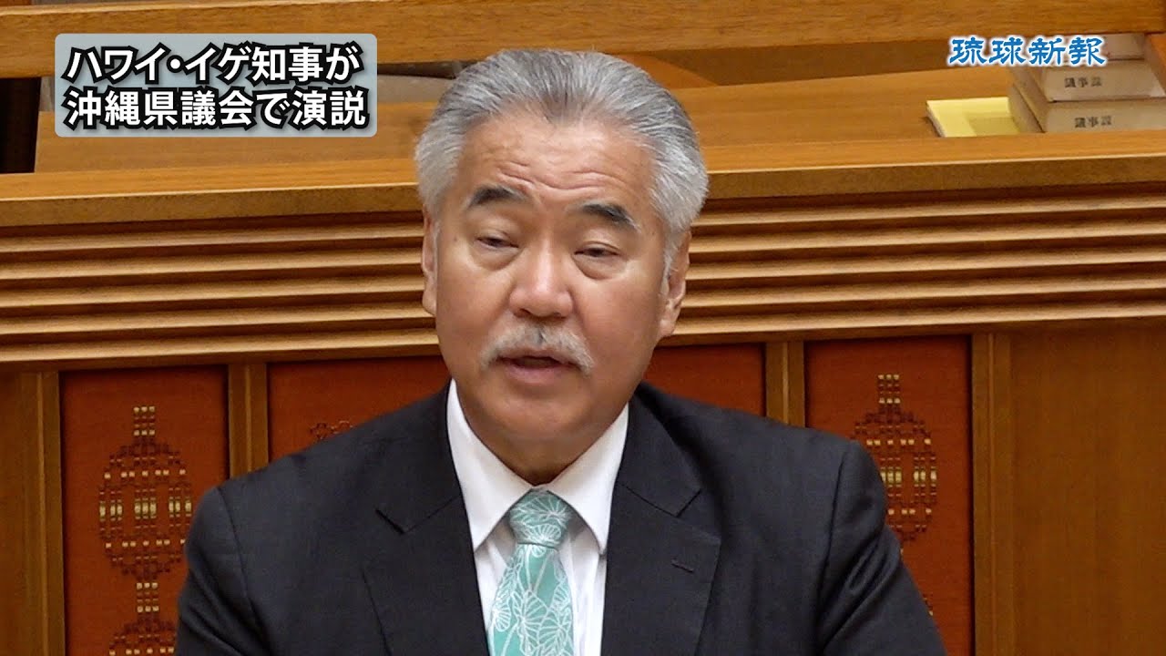 第7回世界のウチナーンチュ大会に合わせて来県中の米ハワイ州知事で、県系3世のデービッド・イゲ氏が31日午後、県議会議場で演説した。イゲ氏は「日米関係、ハワイと沖縄の関係は太平洋地域の平和、法治、民主主義に関して非常に重要な関係だ」と述べ、今後の関係の深化に意欲を示した。沖縄とハワイとの人的交流の積み重ねや経済、再生エネルギー分野などにおける協力関係に触れ「米国初の県系知事となったことを誇りに思う」と述べた。