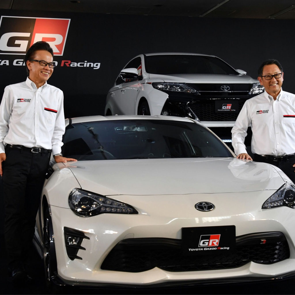 Gazoo Racing President Shigeki Tomoyama (left) and Toyota Motor Corp. President Akio Toyoda introduce the carmaker’s new sports car brand, the GR series, Tuesday in Tokyo. The main target of the new brand is younger customers, who are often said to have lost their passion for driving their own cars. (Yoshiaki Miura photo)