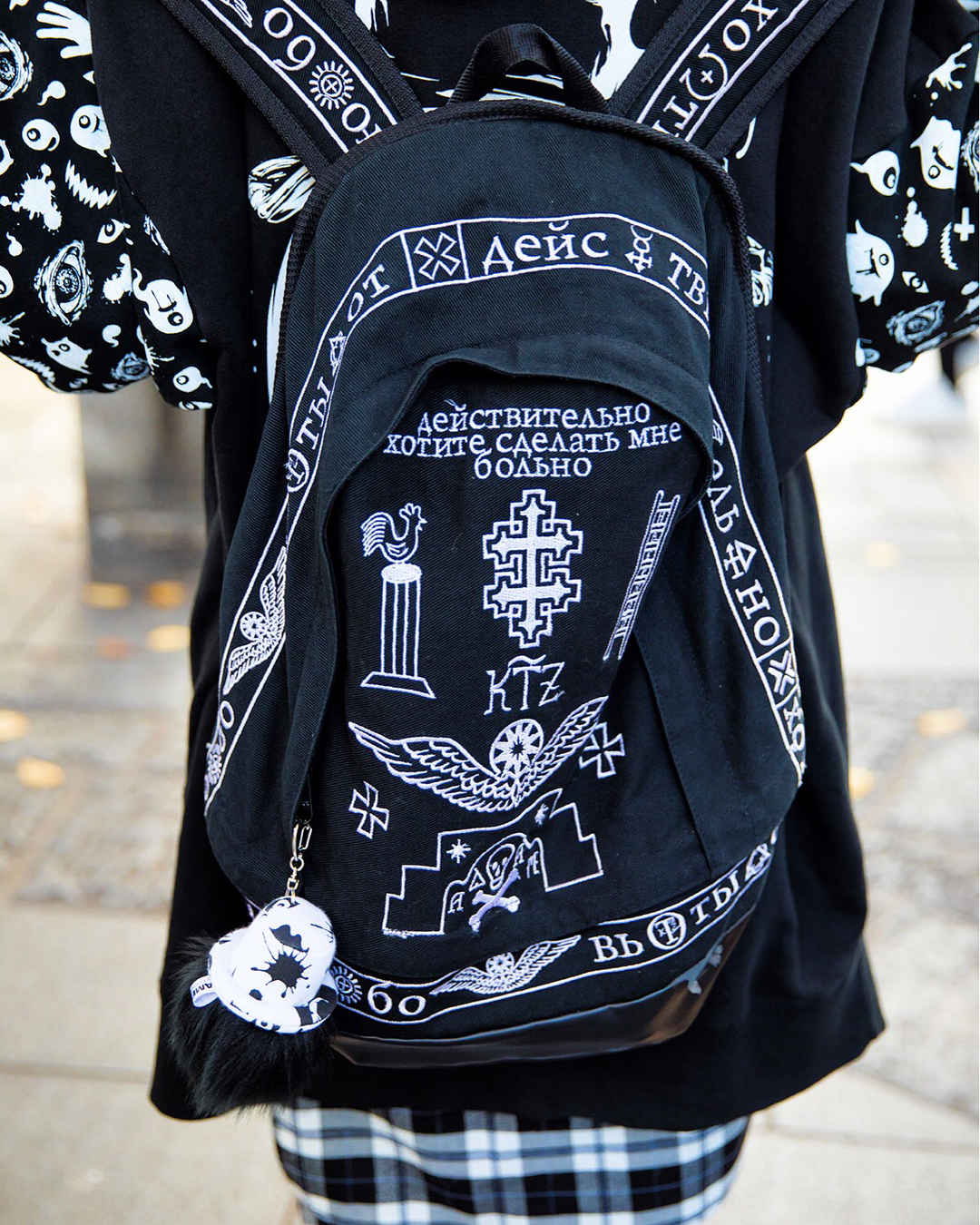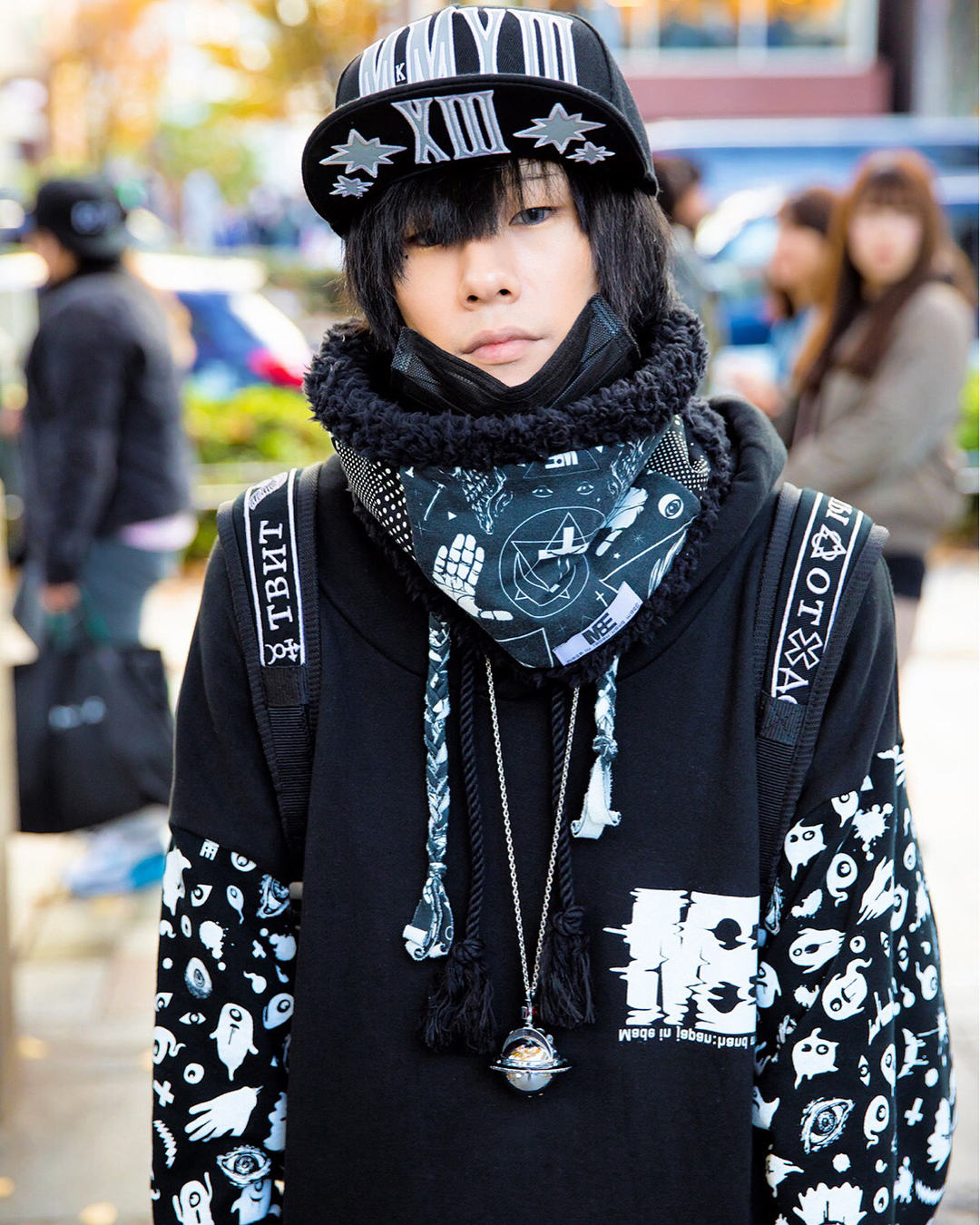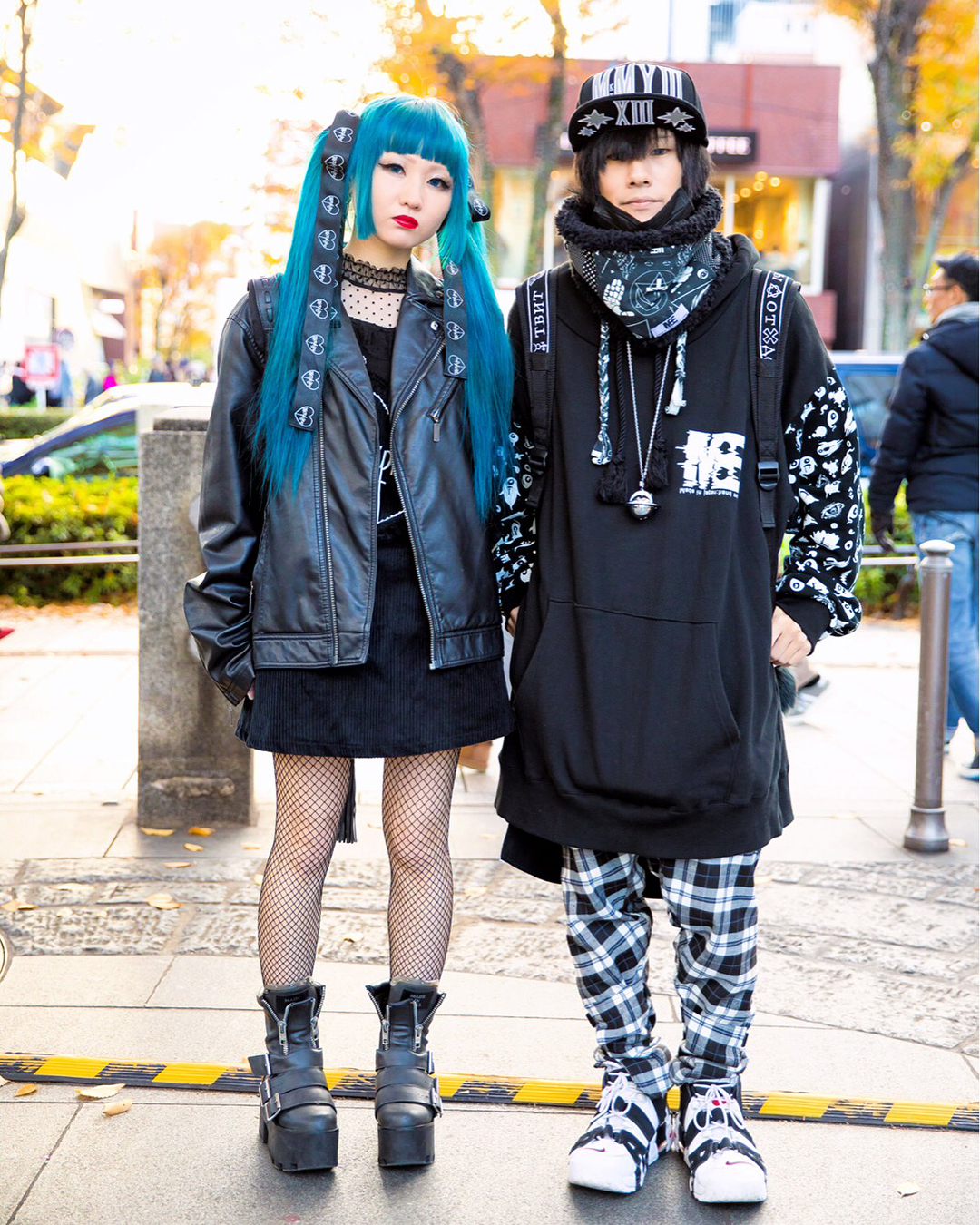 Ayaka (@ayaaya0w0) and Kensuke (@djkuu1028) on the street in Harajuku wearing monochrome styles featuring fashion by ME, Morph8ne, Dolls Kill, Long Clothing, KTZ, Restyle, Nike, and Vivienne Westwood.
