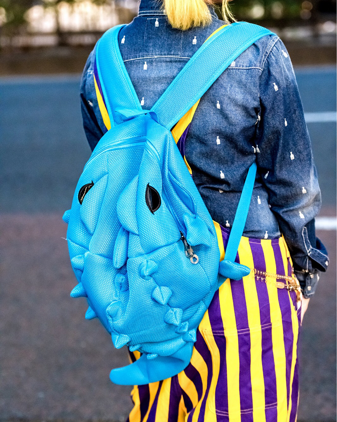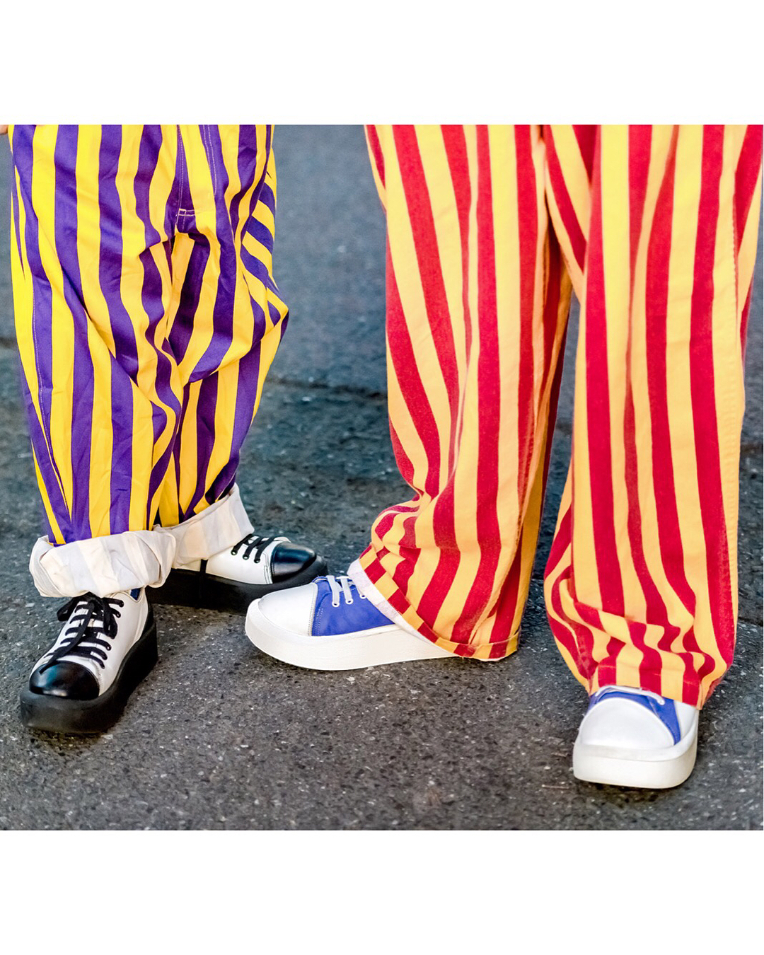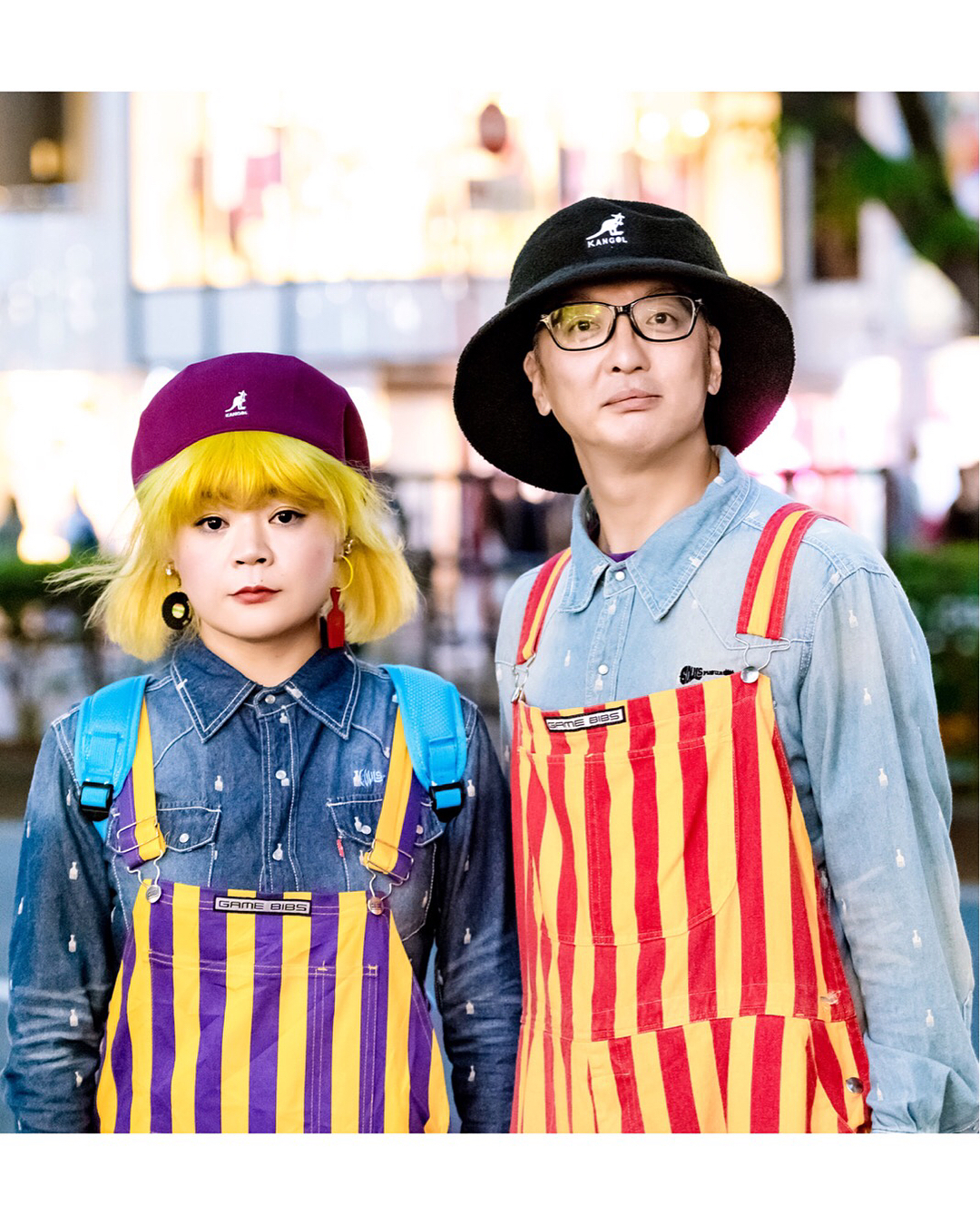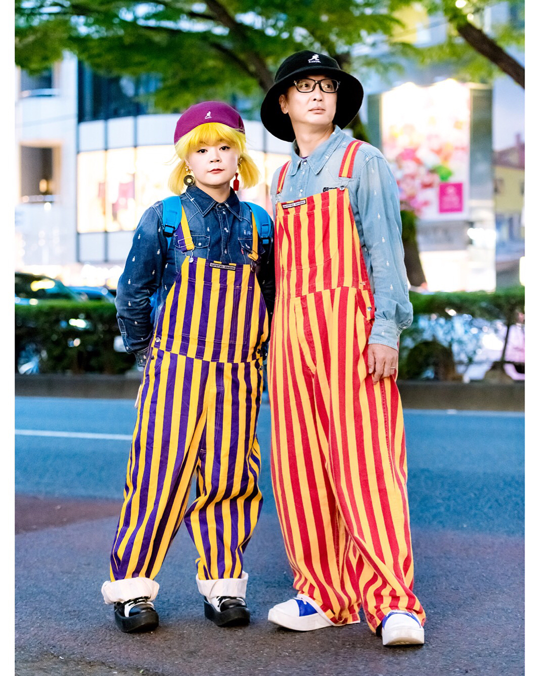 Takako (@takahira1027) and Masao (@masaunti) on the street in Harajuku wearing matching couple fashion with striped Game Bibs, Soulsmania denim, Tokyo Bopper platform shoes, and Kangol hats. Check their Instagram feeds for more matching fashion photos!