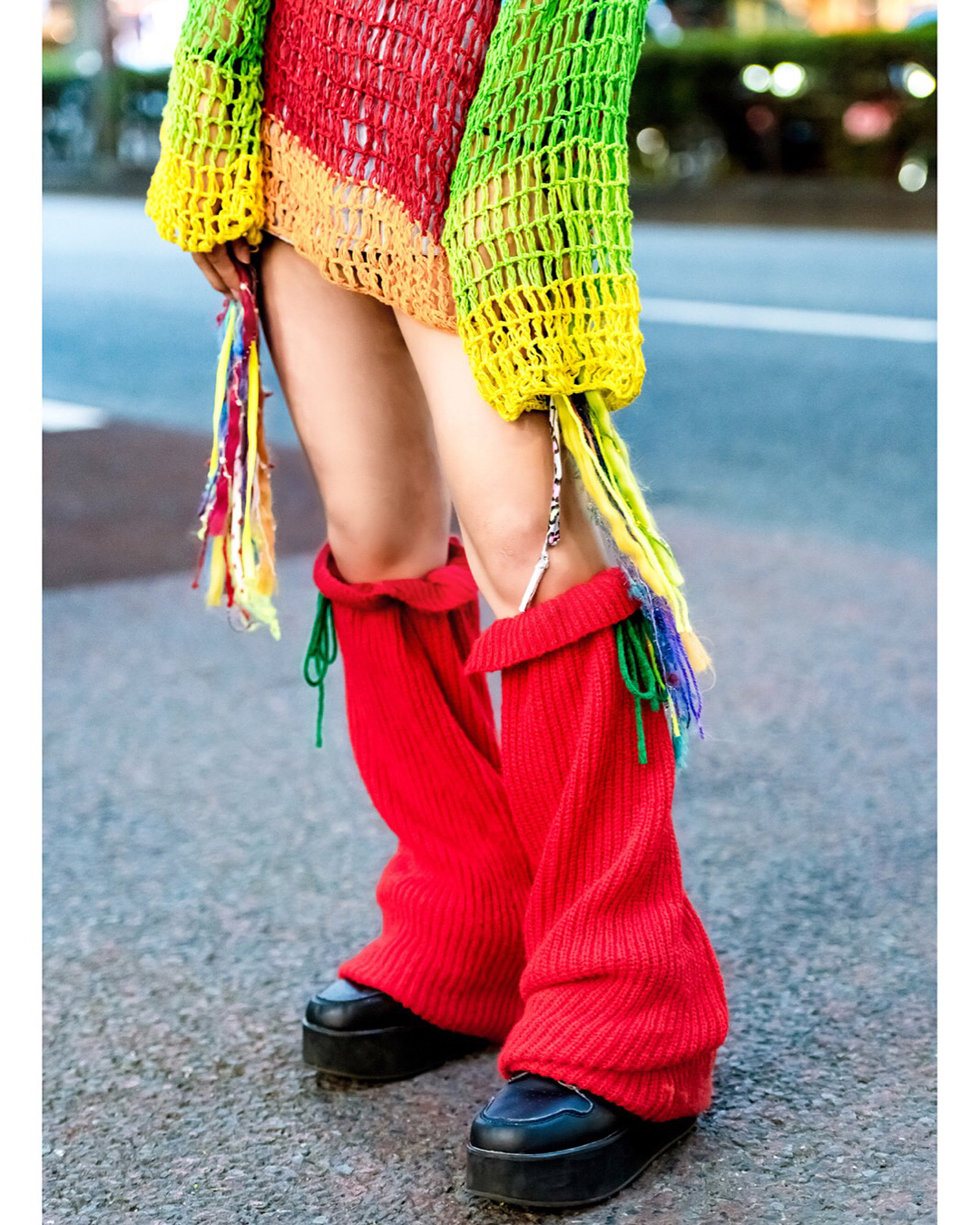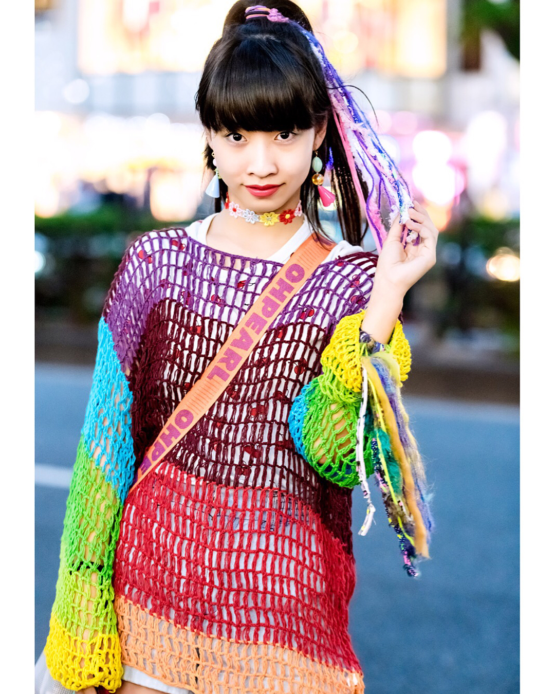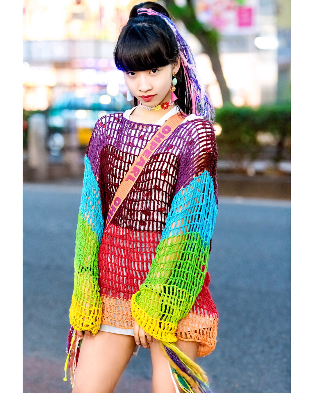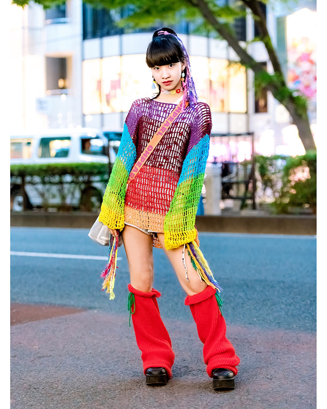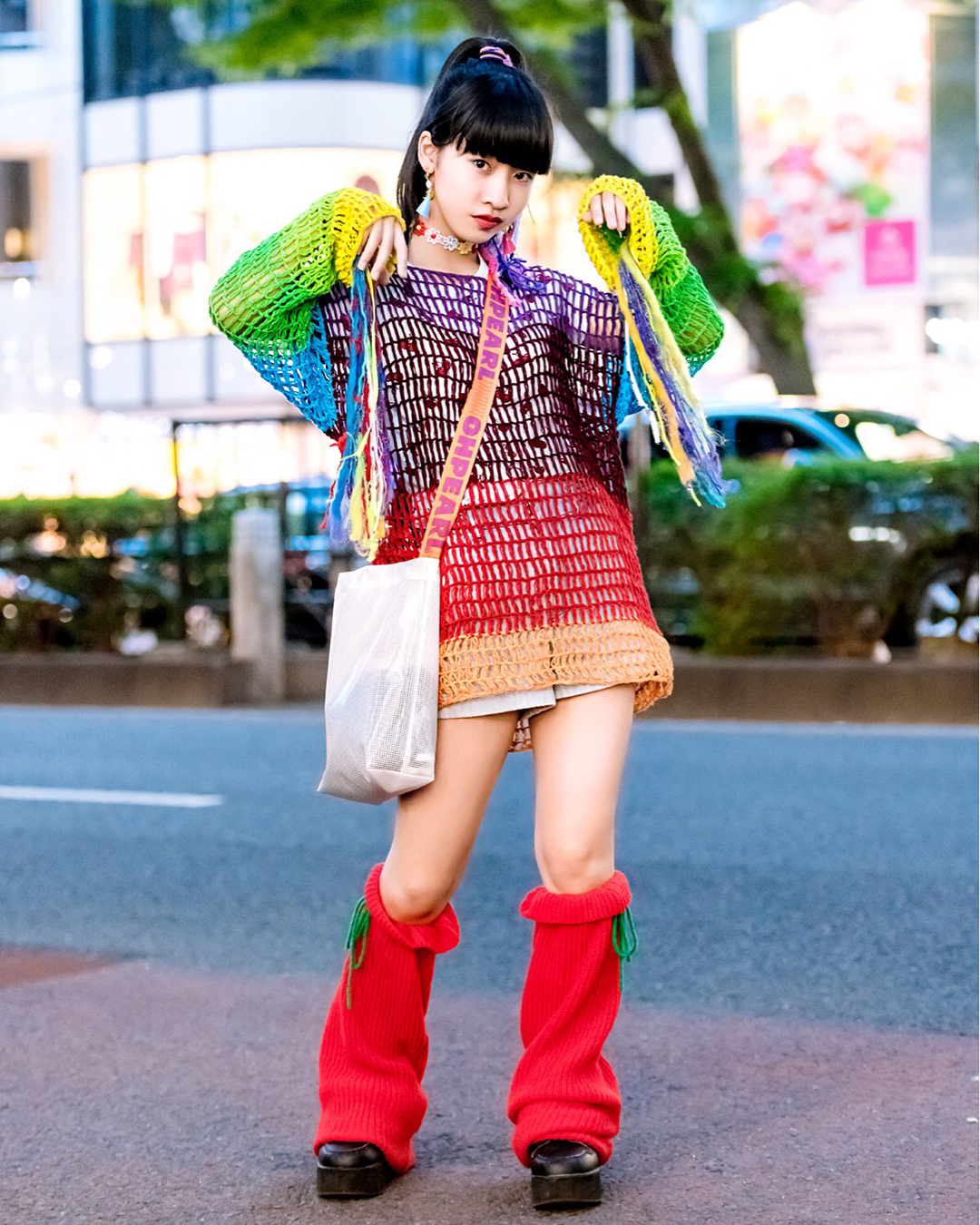 15-year-old Japanese student Yoh (@yohsgram) on the street in Harajuku wearing a colorful look with a vintage knit sweater from Wasteland, a Bubbles top, Lovetoxic shorts, Club Lovage knit leg warmers, an Oh Pearl bag. and handmade flower choker.