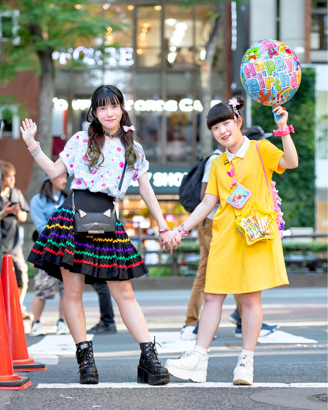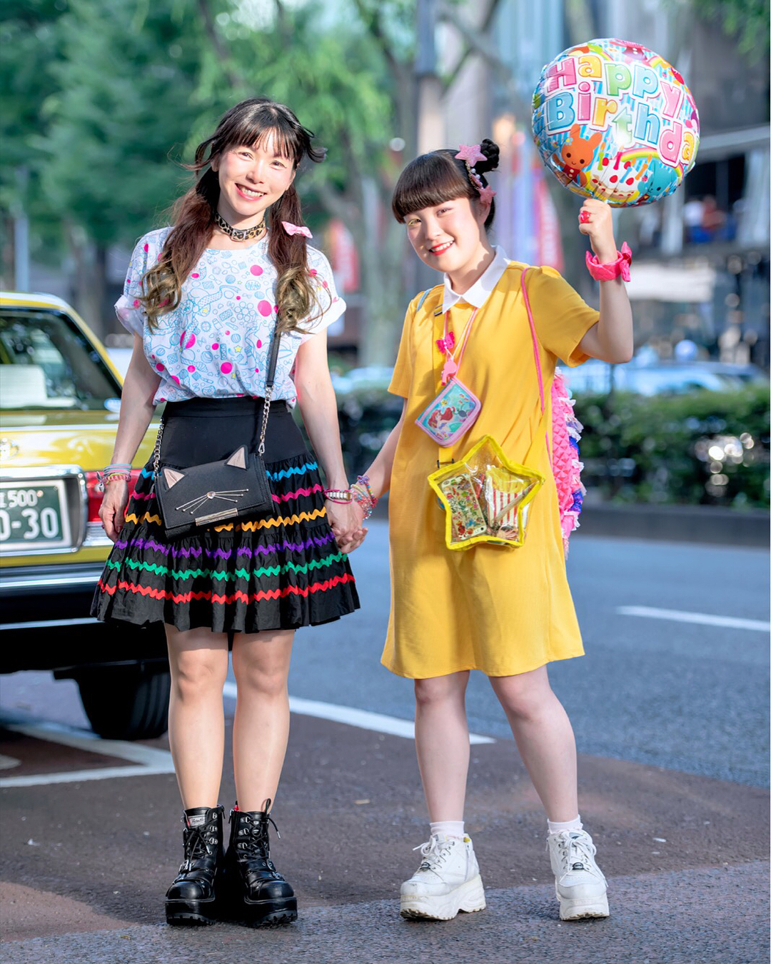 Mother-daughter duo Miwa and Miori (@miori06kidz) wearing kawaii colorful Harajuku street styles with a handmade backpack (made for Miori by her mom) plus items by 6%DOKIDOKI, Yosuke, Kinji, and Kate Spade. Today (June 6th) is Miori’s 17th birthday and she and her mother were in Harajuku celebrating together. Miori – a Japanese high school student – is well known and loved in the Harajuku street fashion scene for her super positive and fun personality. She calls her ever-growing group of friends her “Harajuku Fam” and she always brightens up the neighborhood when she’s around. Please join us in wishing @Miori06kidz a very HAPPY BIRTHDAY!!