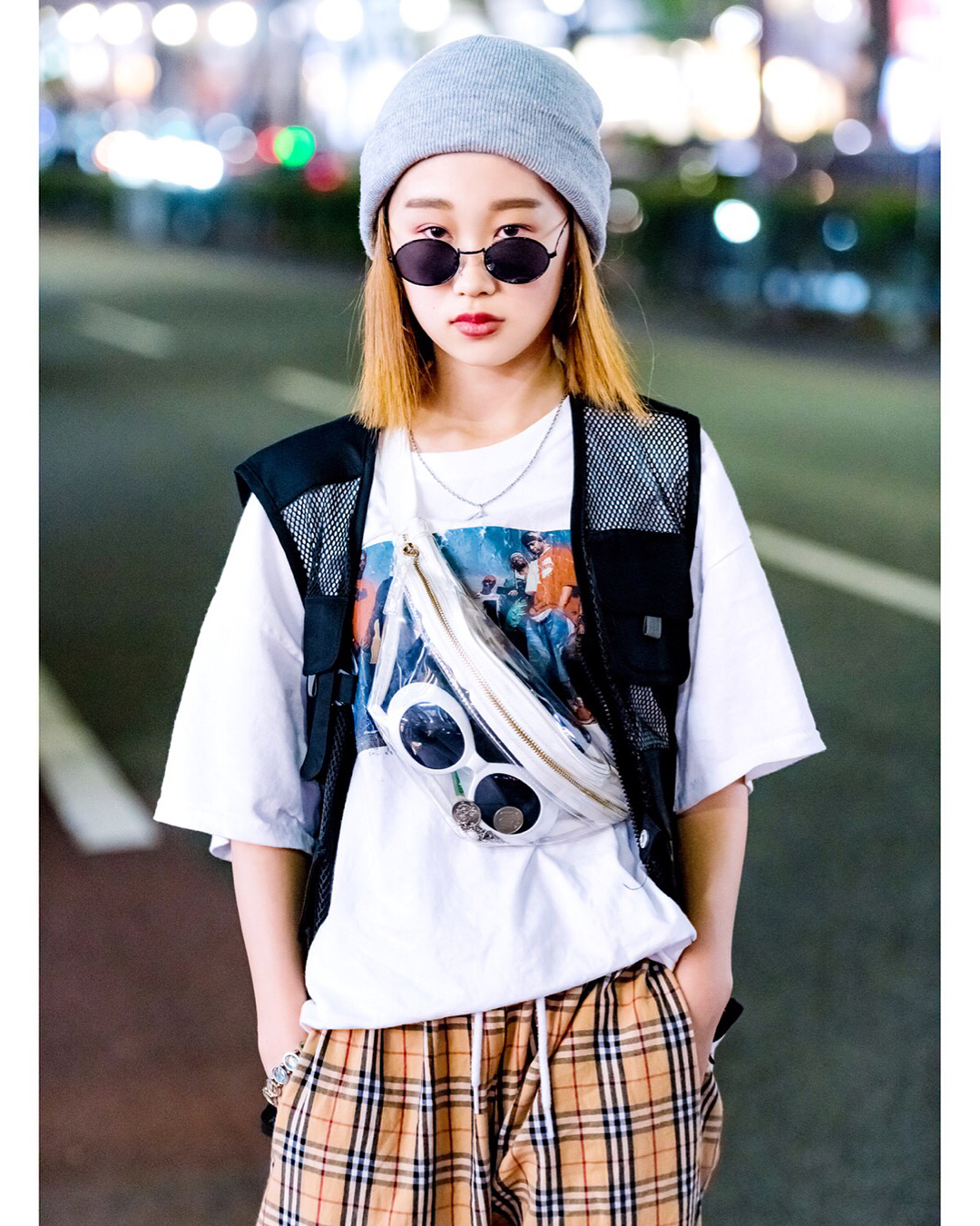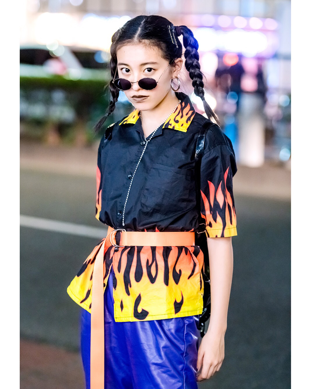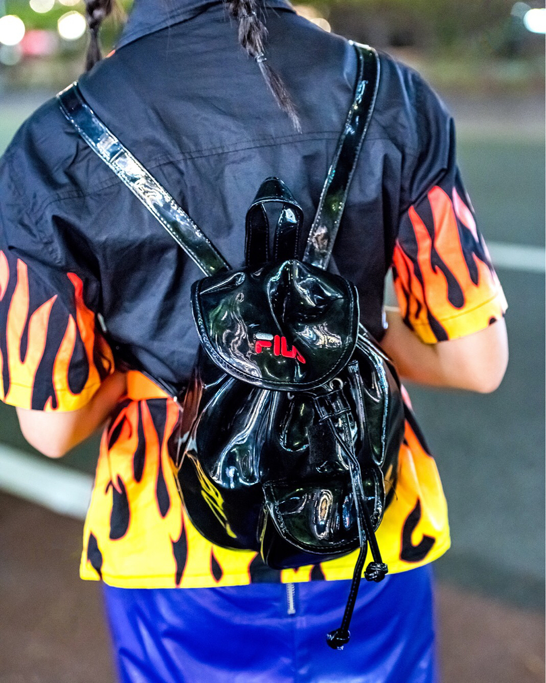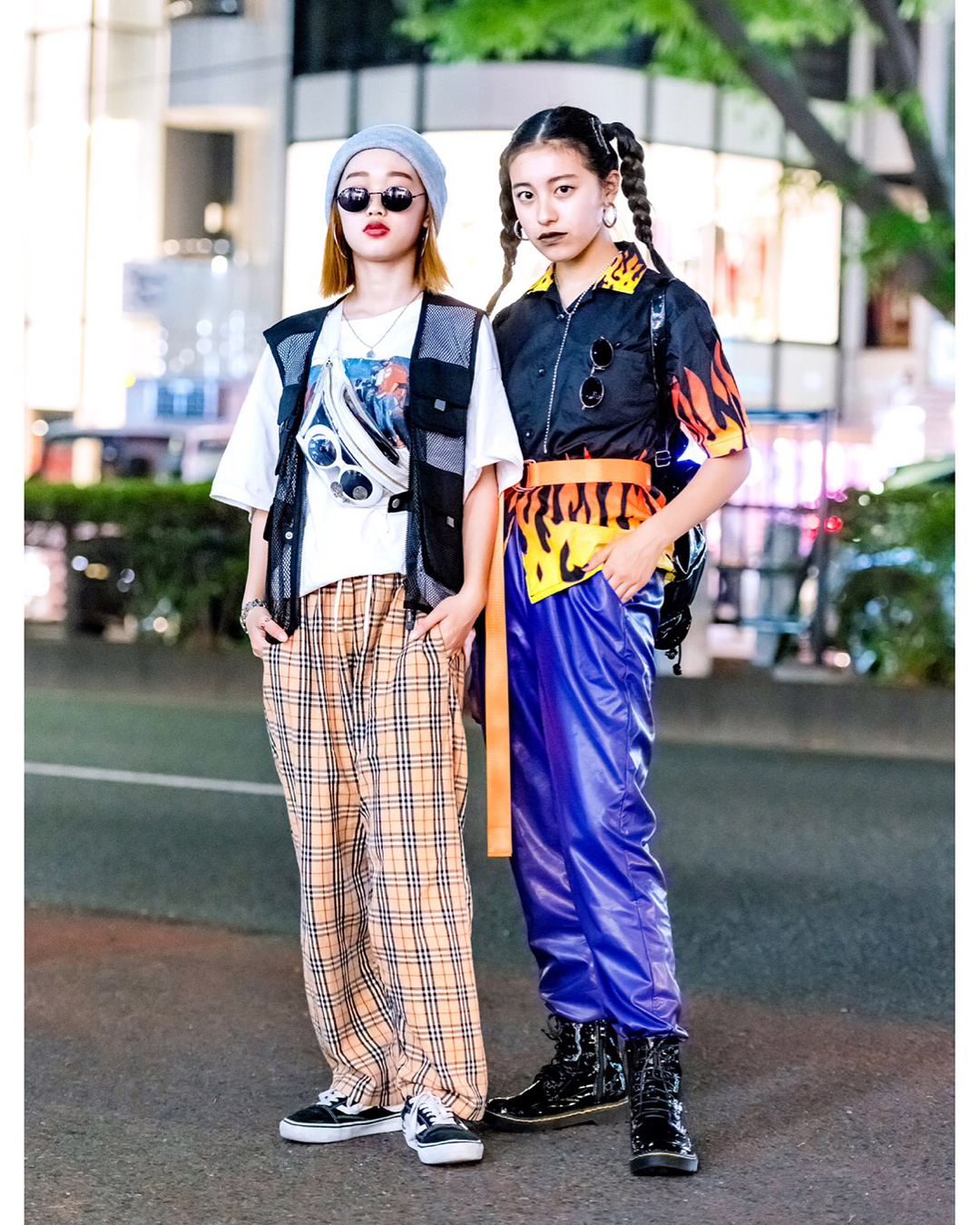 15-year-old Japanese students Rui (@ruieikoshi_03) and Mika (@m_mikaolanda) on the street in Harajuku wearing plaid pants and see through bag vs. flame print and a Fila backpack with items from Spinns, Moussy, Fila, Warp, ME, Vans, Titicaca, Forever 21, and Bubbles Harajuku.