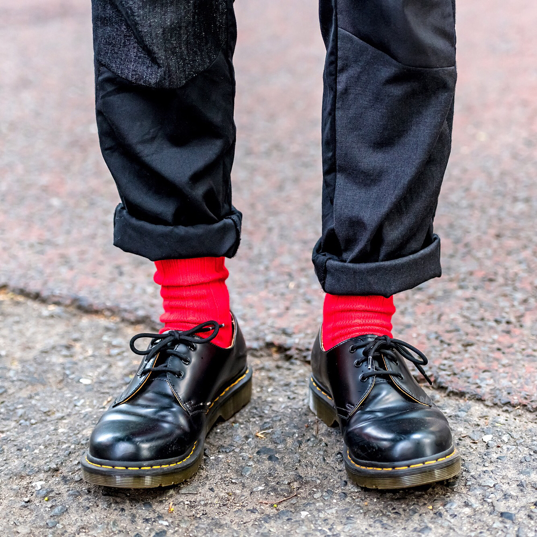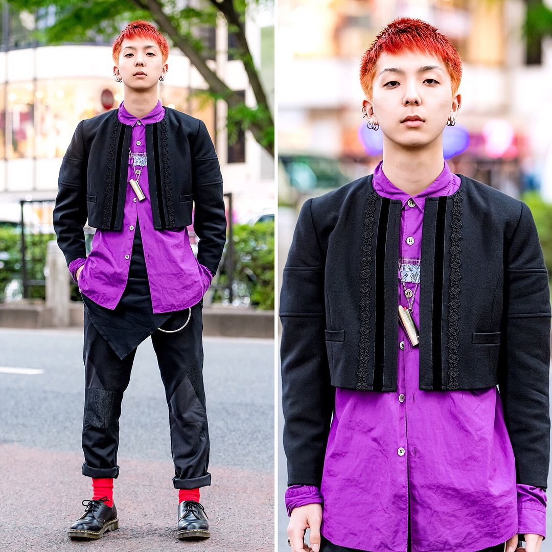 18-year-old Japanese fashion student Ryusei (@k_ryusei2660) on the street in Harajuku wearing a layered look with a Comme des Garcons cropped jacket, purple Comme des Garcons shirt, cropped Paul Smith pants, Dr. Martens, and accessories by Ambush Design.