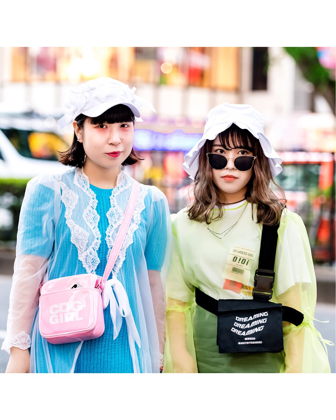 20-year-old cafe staffers Sawa (@hetakuso__13) and Eto (@eto.jp) on the street in Harajuku wearing colorful sheer coats along with items by Nadia Harajuku, Style Nanda, Tokyo Bopper, Oioi Korea, Comme des Garcons Girls, and Keisuke Kanda.