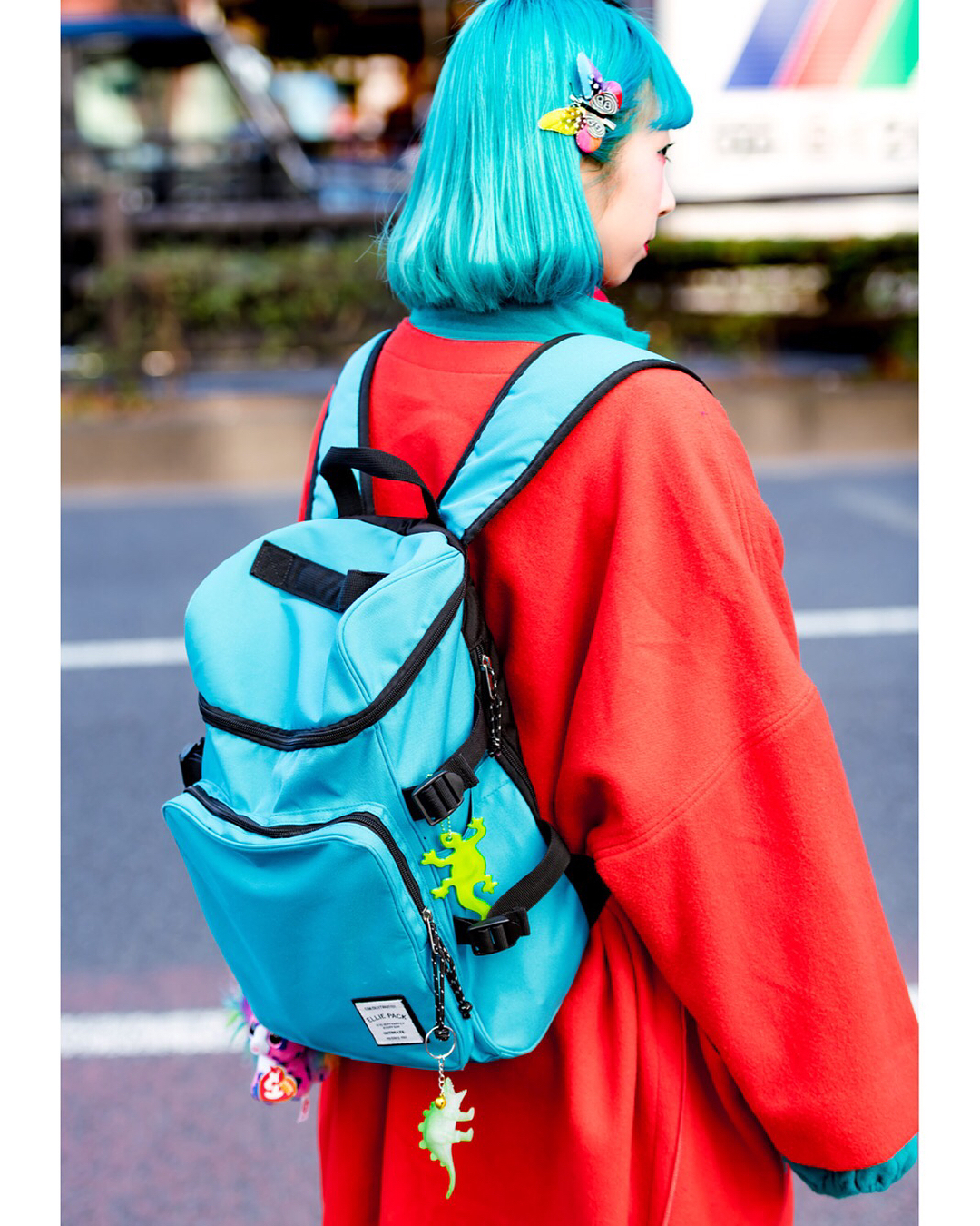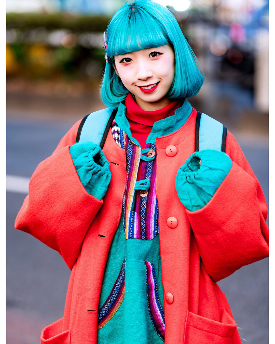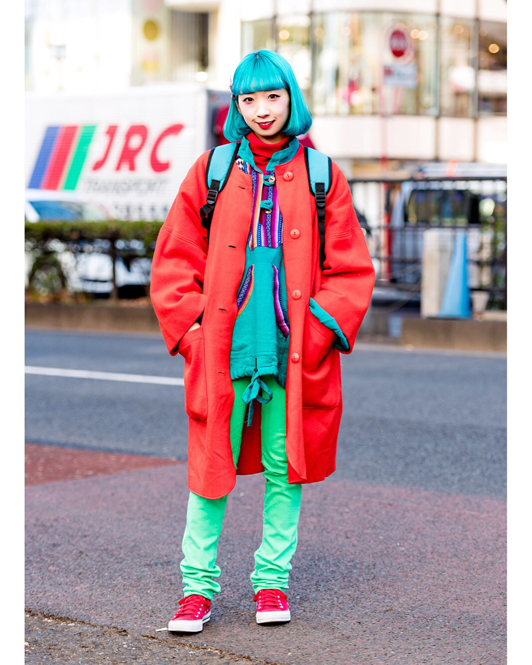 Japanese pop idol and YouTuber Miochin (@dtdq2828) on the street in Harajuku wearing a Grapefruit Moon coat with a top and pants from the popular resale shop Kinji Harajuku, Claire’s accessories, a big backpack, and Converse sneakers. Miochin’s favorite musical artist is Kyary Pamyu Pamyu.