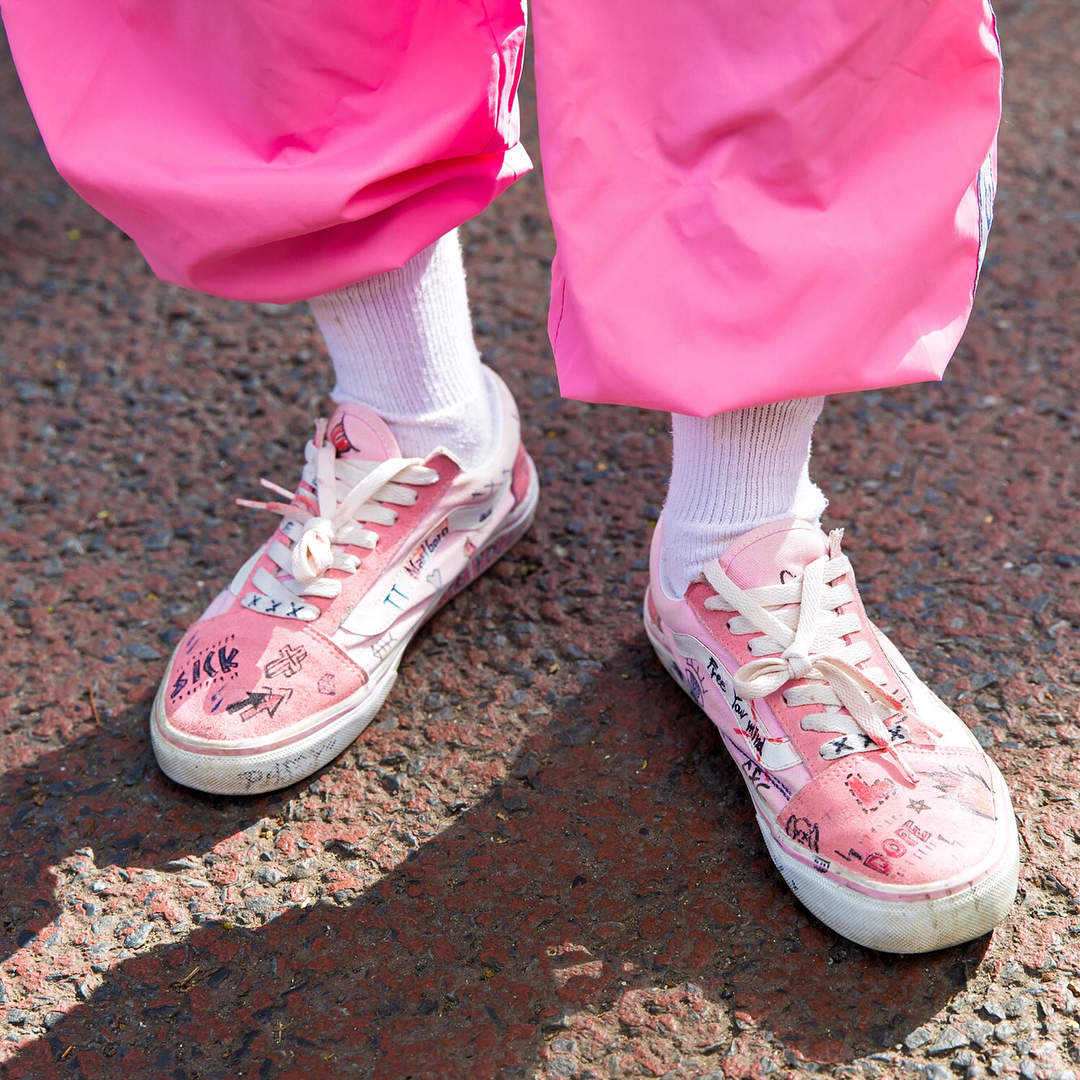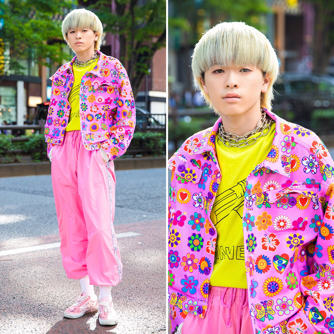19-year-old Japanese student Kanade (@knd529fo) on the street in Harajuku. He’s wearing a pink floral jacket by Kobinai over a DODODO t-shirt, pink vintage pants, and pink Vans sneakers.