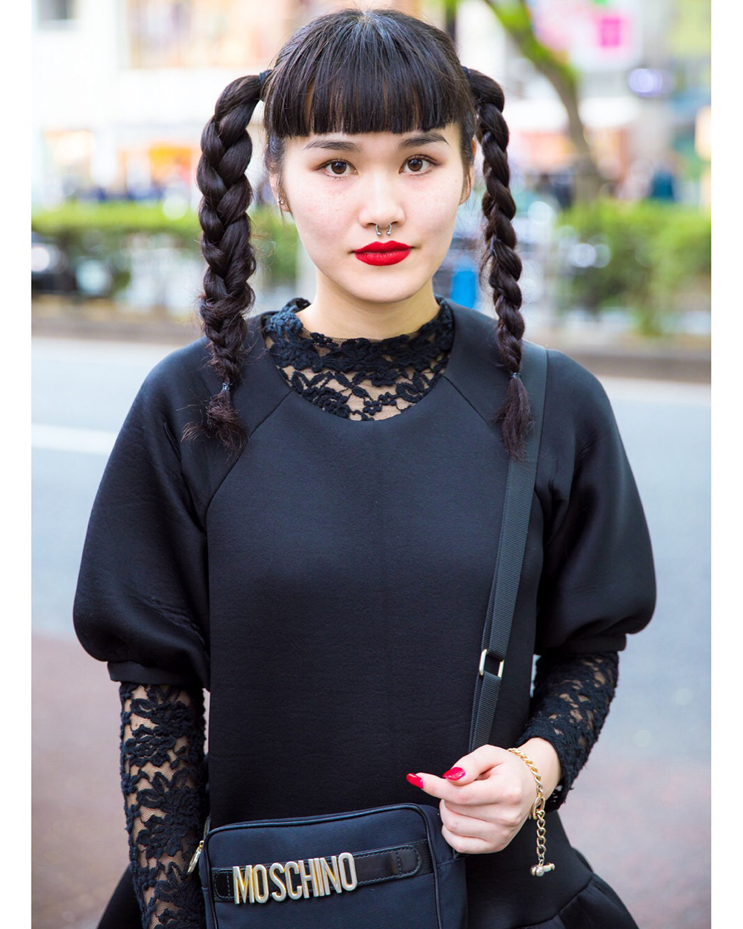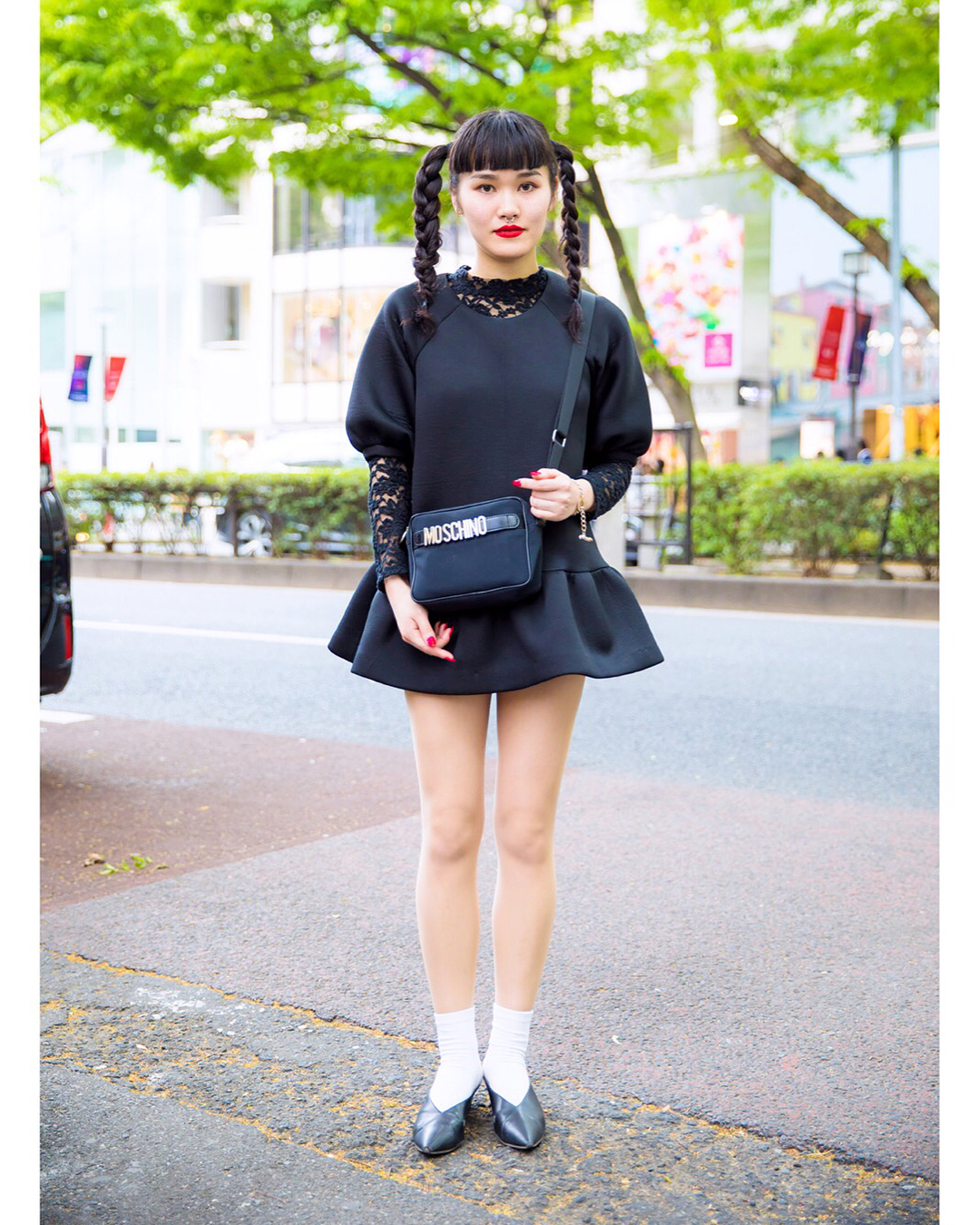 22-year-old Noa (@sakurainoa) on the street in Harajuku wearing a Bubbles Tokyo neoprene mini dress over a lace top, GU heels, a Moschino bag, and Vivienne Westwood accessories.