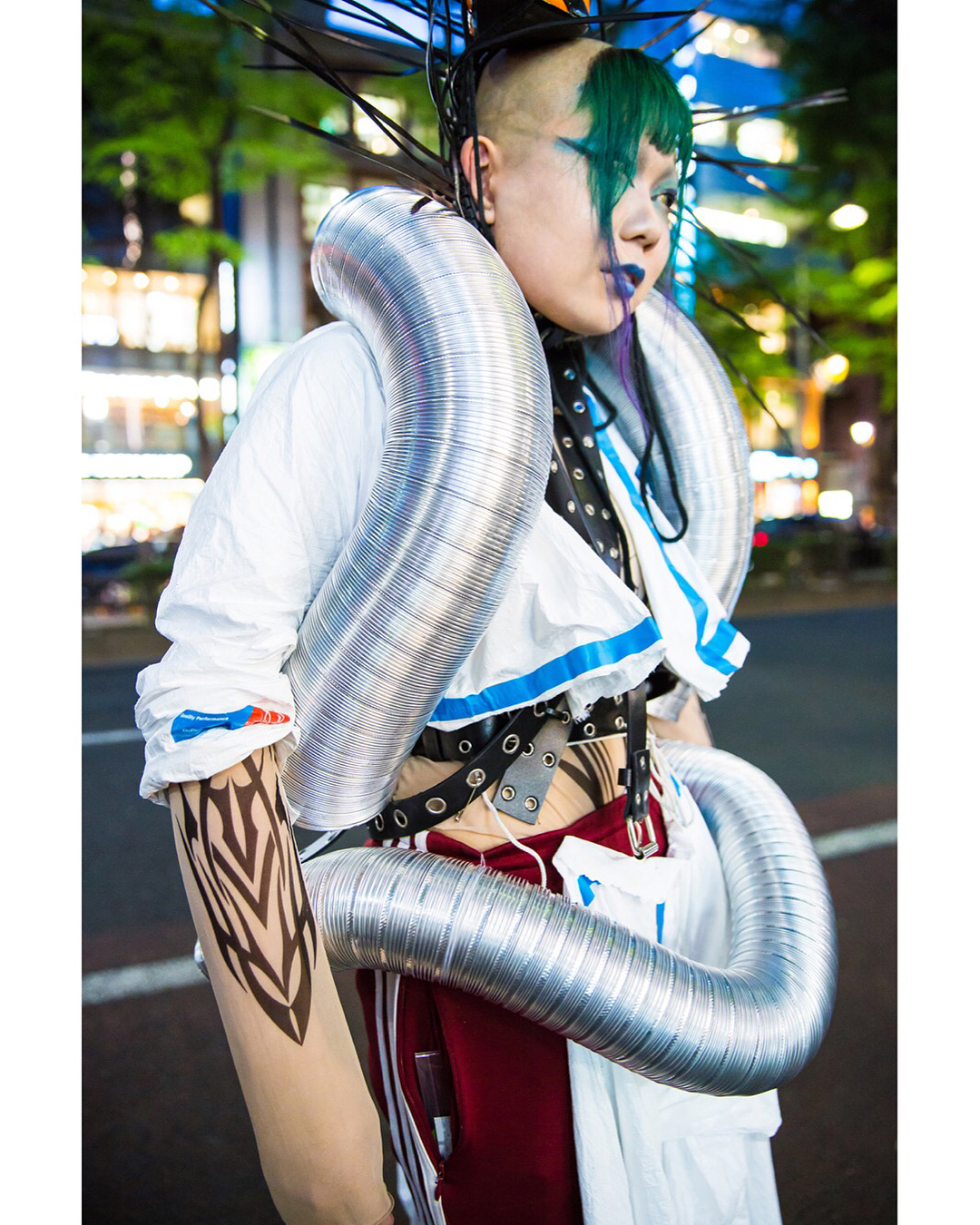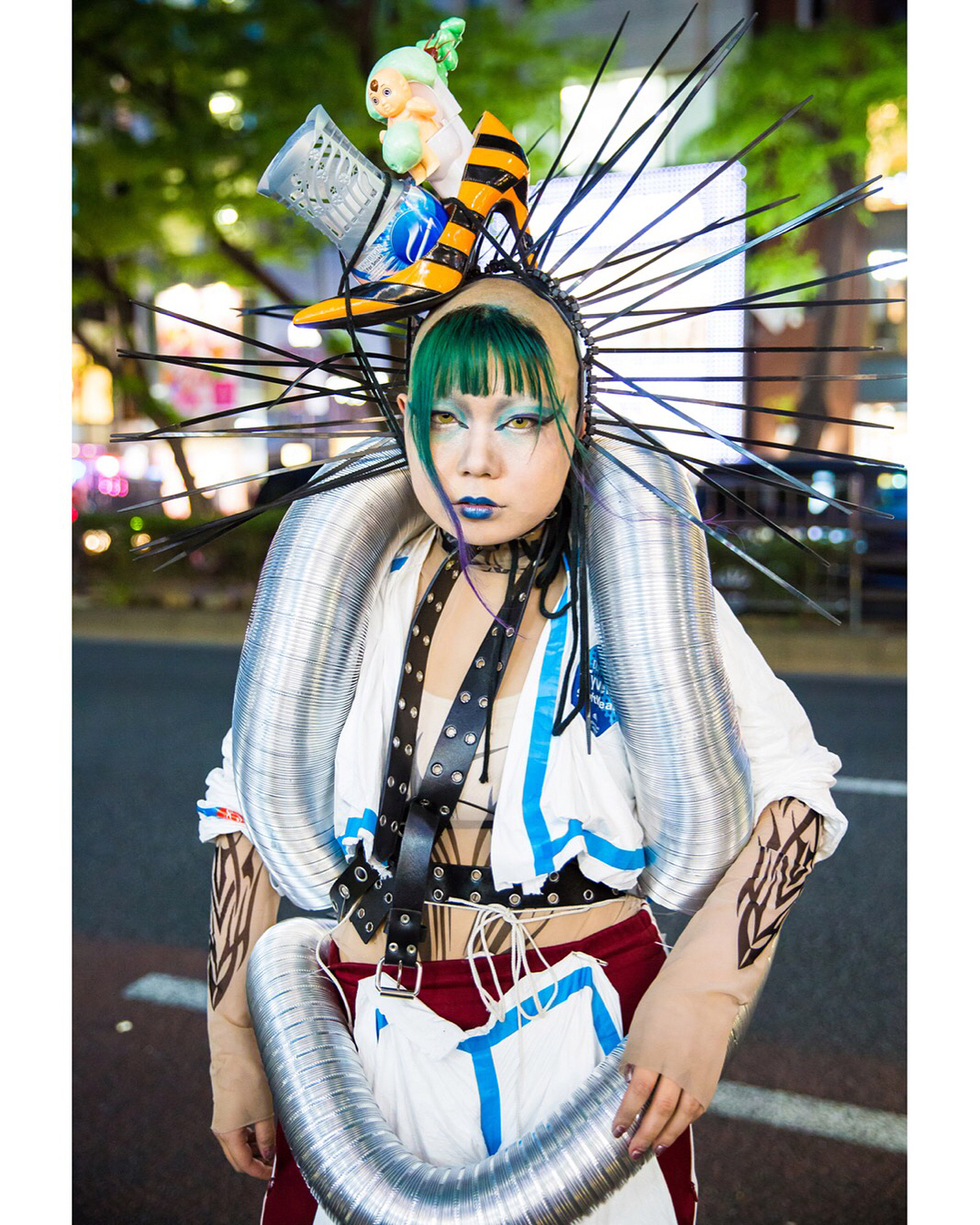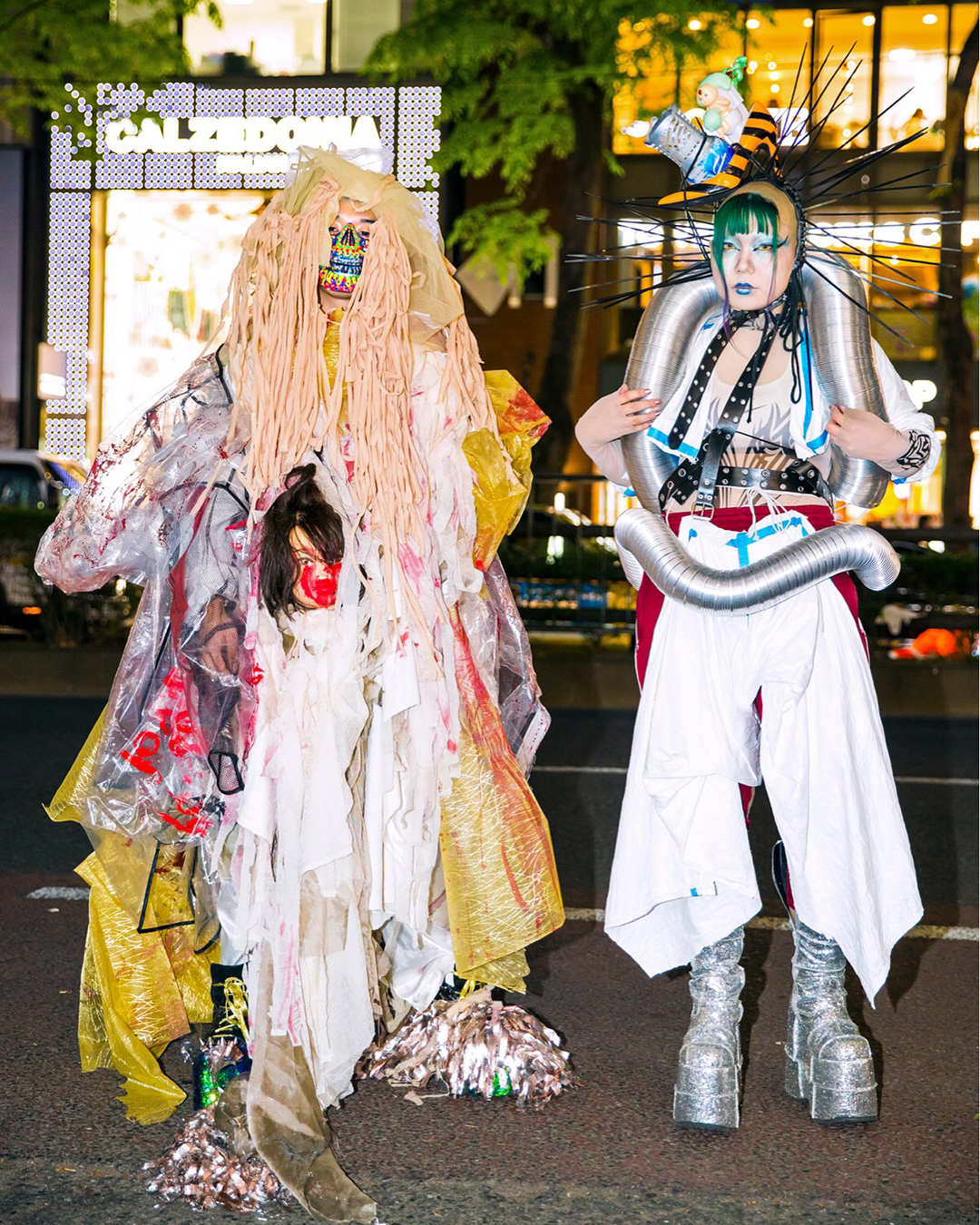 Japanese students Kanji (@freiheit2348.texas7347) and Sakuran (@Sakuran_is_) on the street in Harajuku wearing avant-garde looks with mostly handmade and remake fashion as well as Demonia, YRU, and Dolls Kill items.