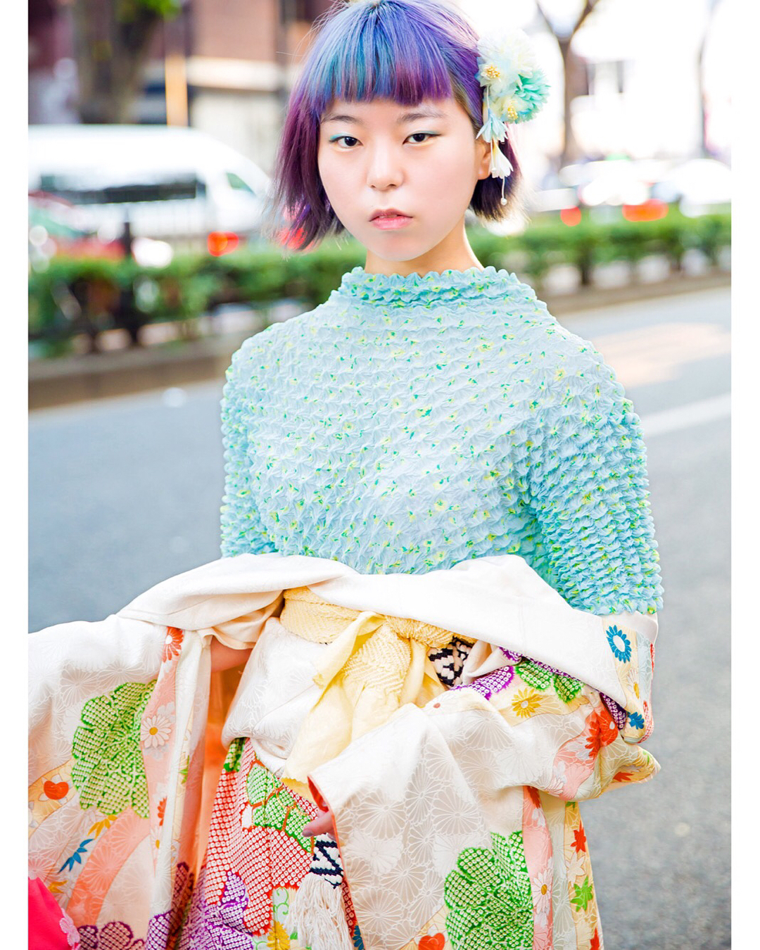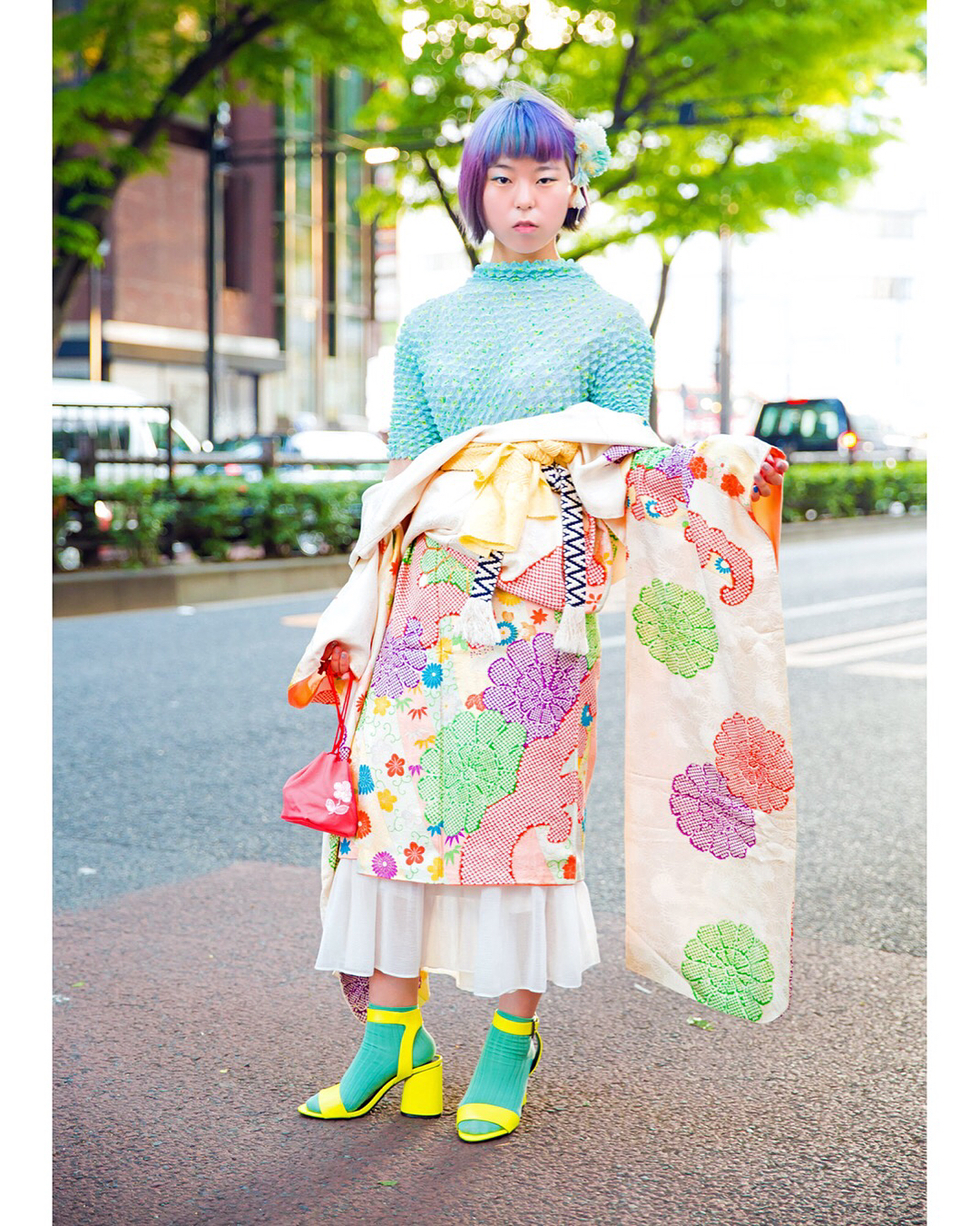 18-year-old Japanese fashion student Lisa (@Drawing_Risa) on the street in Harajuku wearing a floral kimono with a popcorn top, sheer skirt, yellow sandals, and a flower headpiece.