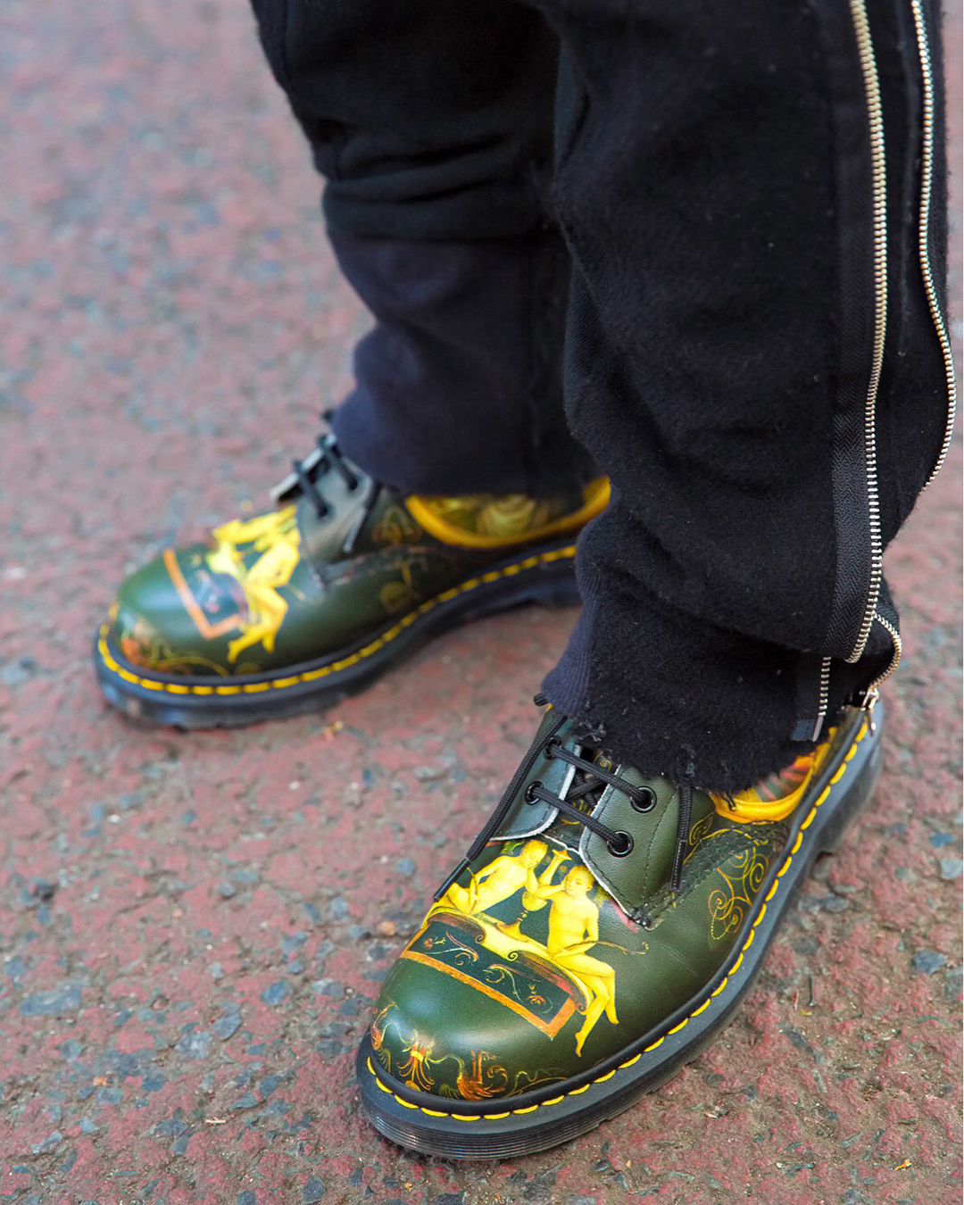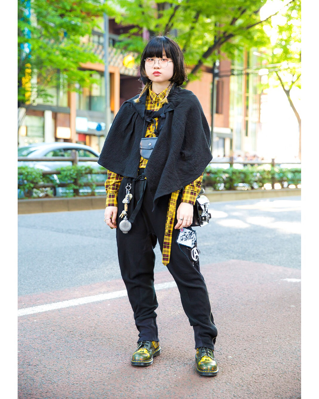 Hyaku on the street in Harajuku wearing a black and yellow look with layered handmade tops, Undercover pants, Dr. Martens boots, a Mihara Yasuhiro bag, and accessories by Pass The Baton, Pala, Chigo, and Vivienne Westwood.