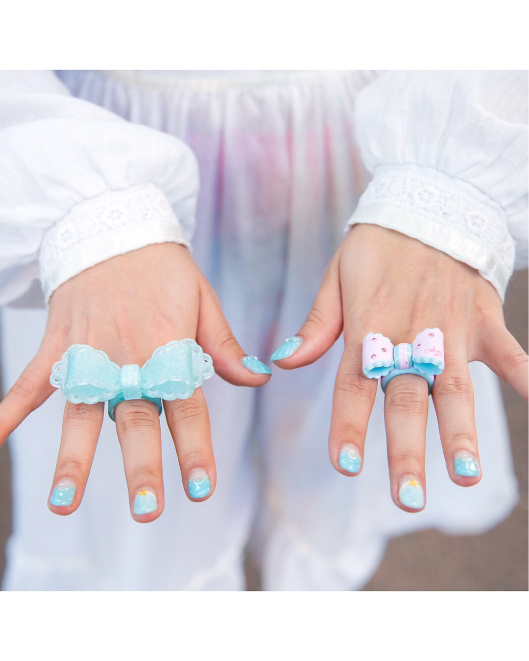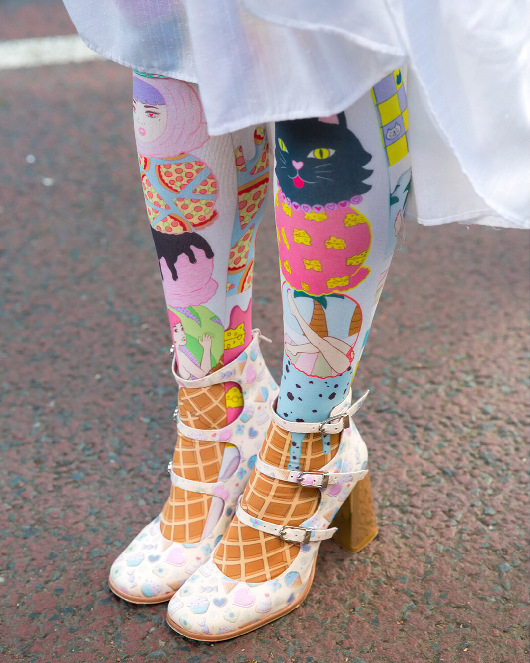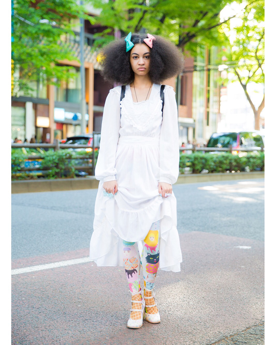 Tokyo-based model and publisher Choom (@choom.online) on the street in Harajuku wearing a vintage Gunne Sax dress with Tokone graphic tights, print Jeffrey Campbell heels, an EatMe backpack, Angelic Pretty bow rings, and 6%DOKIDOKI hair clips.