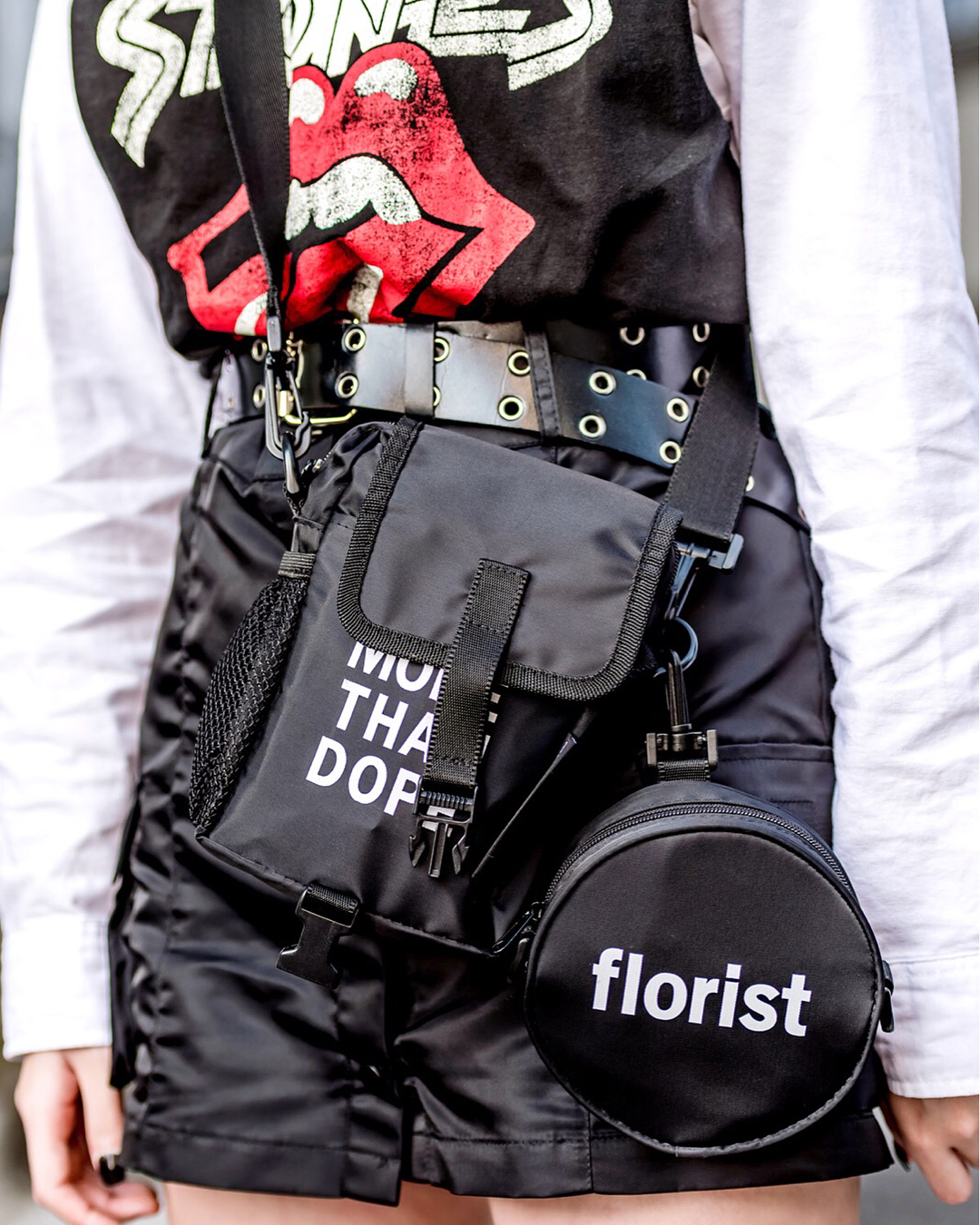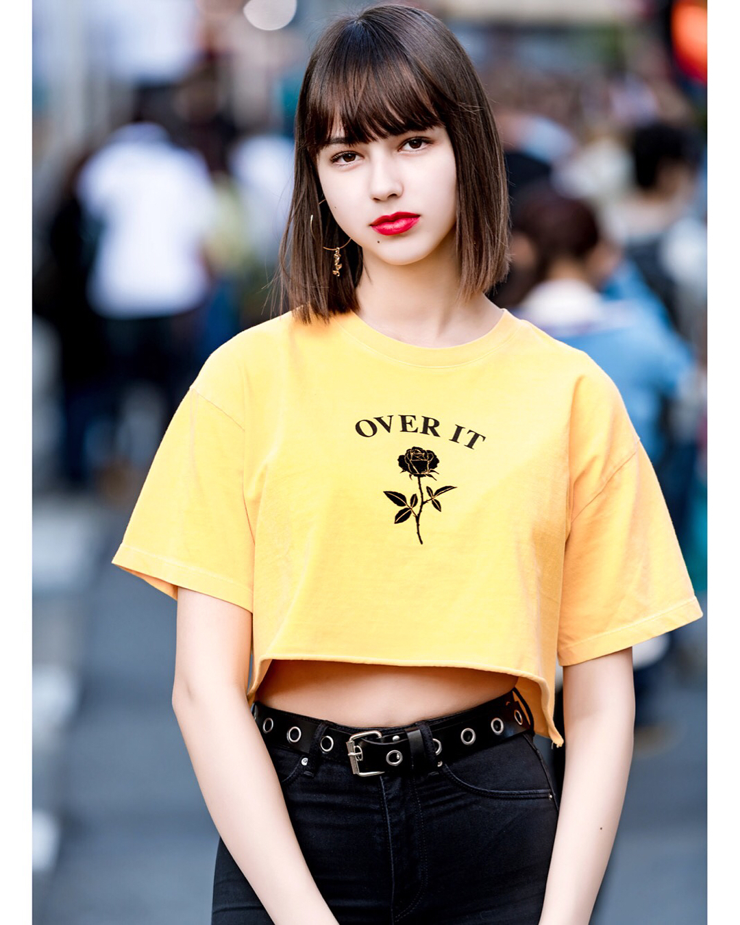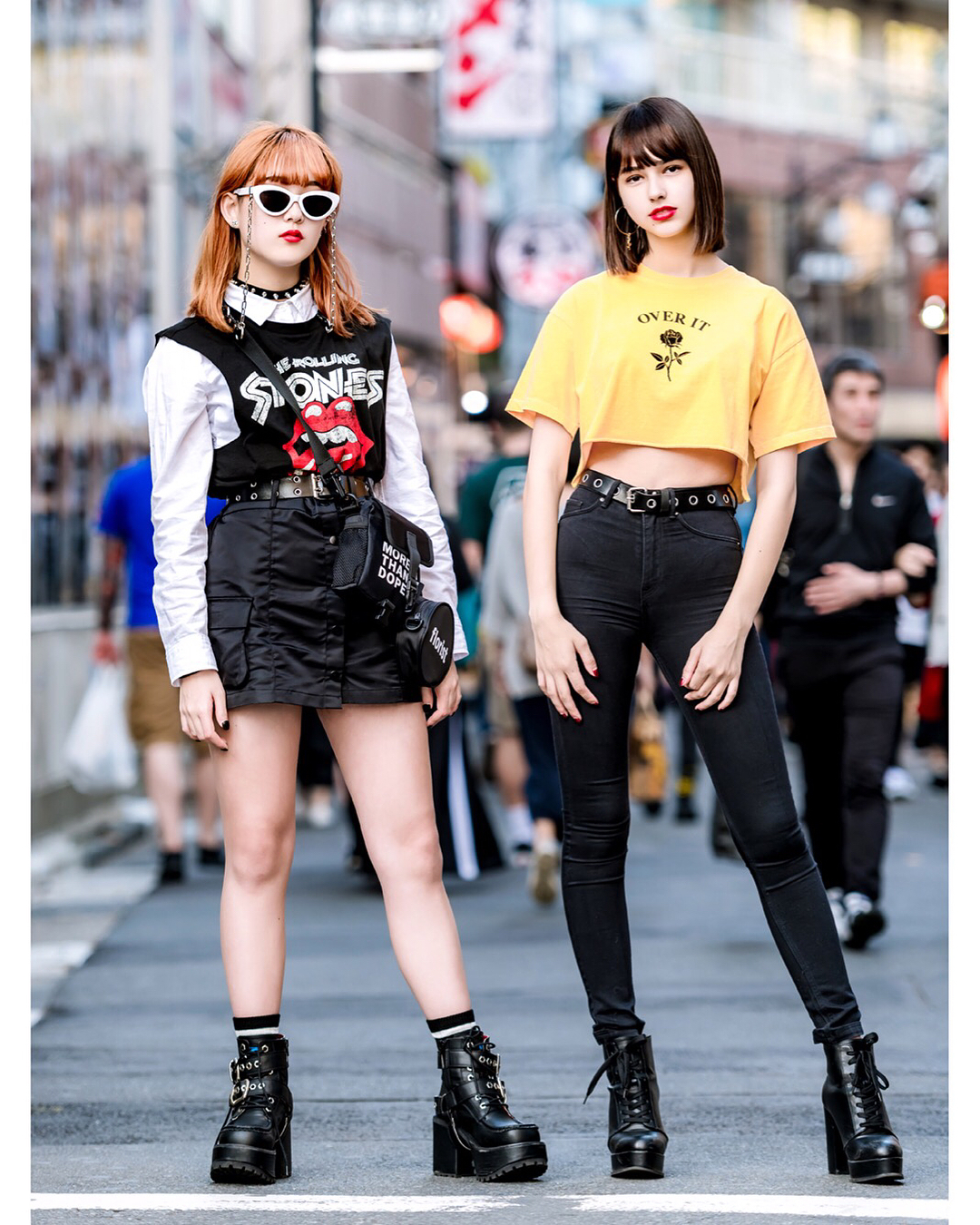 15-year-old Maria (@0_REI__maria) and 16-year-old Ayumi (@ayumiisabel) on the street in Harajuku wearing fashion by More Than Dope, Open The Door, Never Mind the XU, H&M, The Rolling Stones, and Bershka.