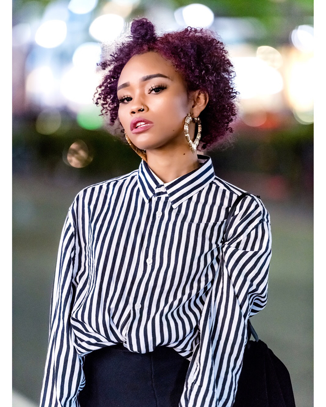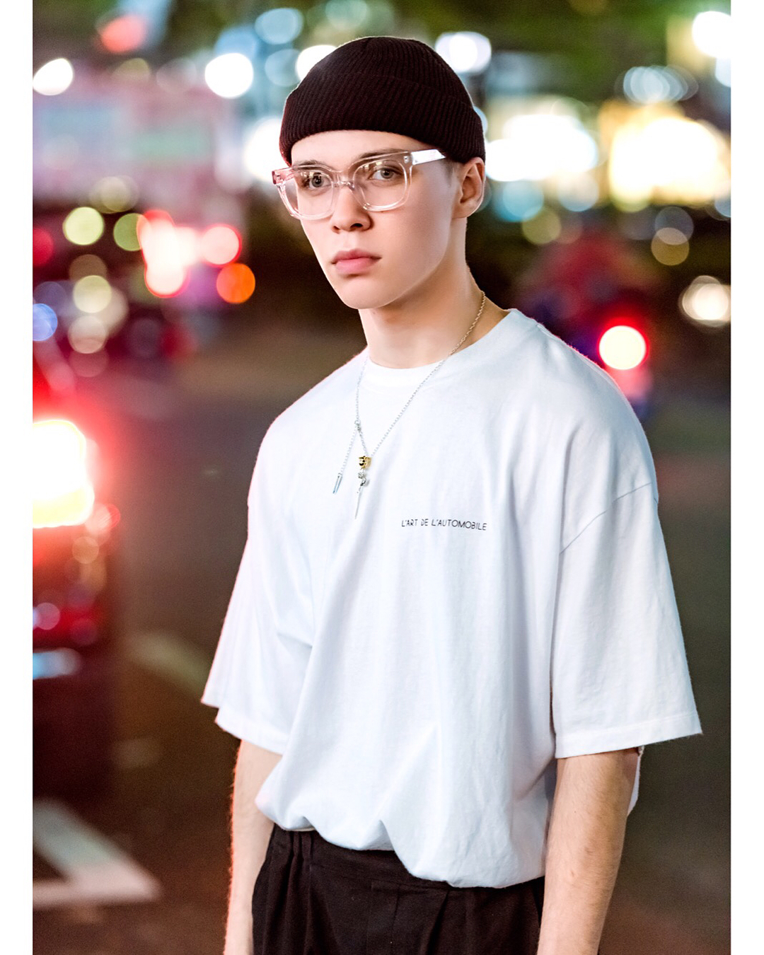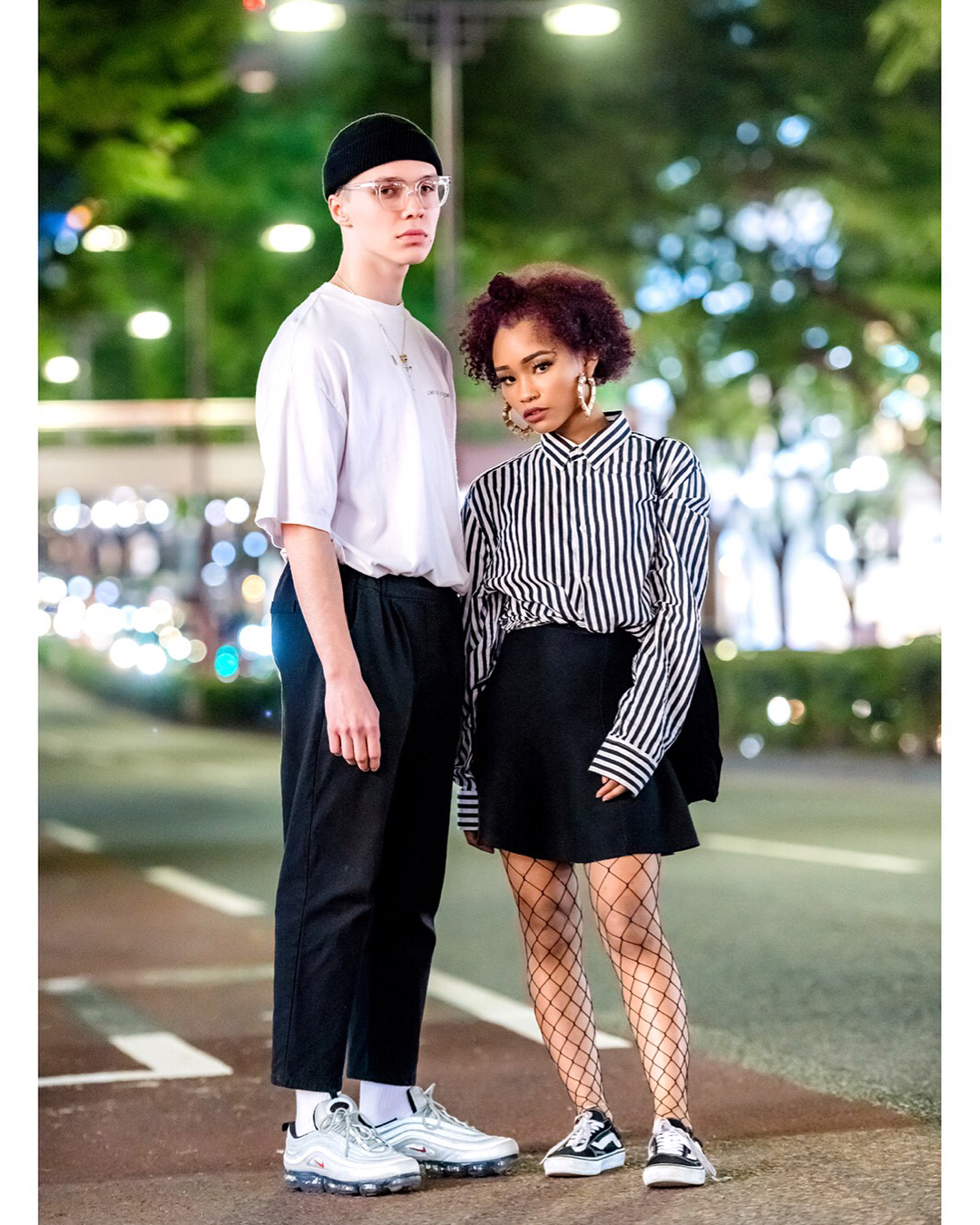 Russian model Danil (@danil_____17) and Japanese production manager @LilHoneyPrincess on the street in Harajuku wearing monochrome styles including items by Fenty Puma, KAR, Ambush, Inari, Baby Shoop, H&M, Nike, and Vans.