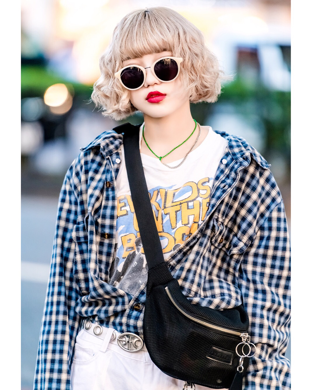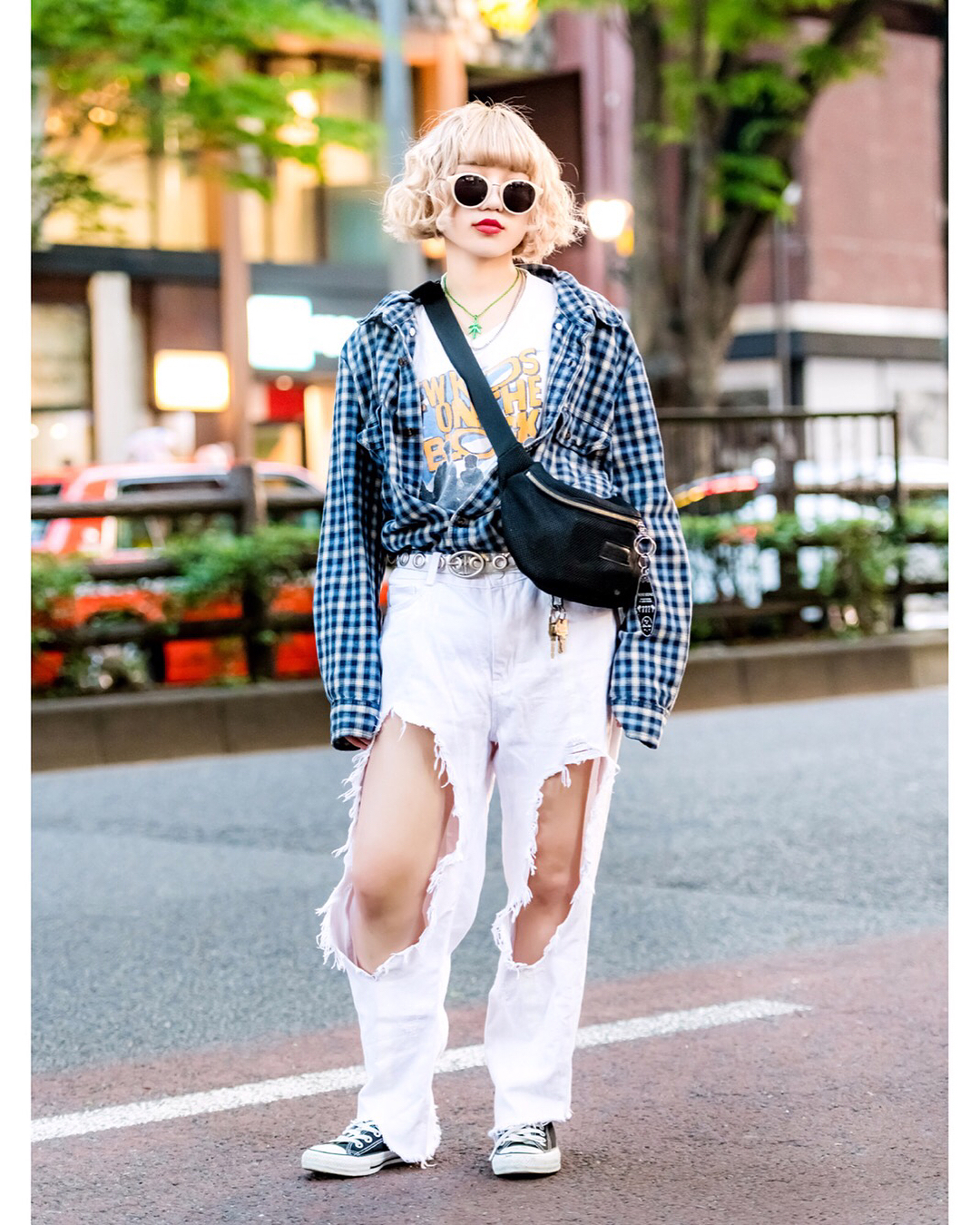 18-year-old Japanese fashion student Megumi (@megu1999mi) on the street in Harajuku wearing a vintage New Kids on The Block t-shirt under a vintage plaid shirt, MYOB NYC ripped jeans, an X-Girl crossbody bag, and Converse sneakers.