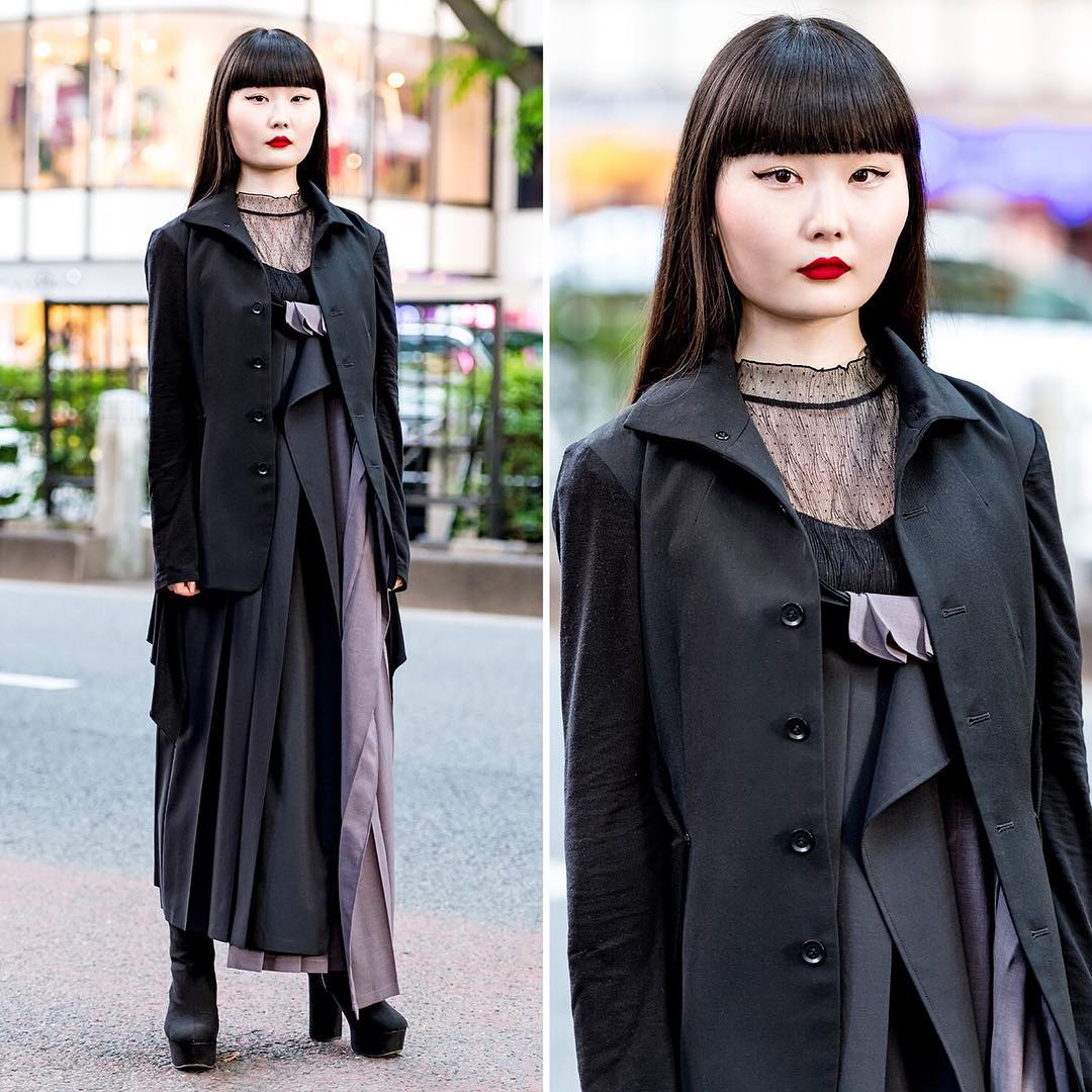18-year-old Japanese student Kana wearing a monochrome minimalist street style in Harajuku with a jacket and pleated dress by legendary Japanese designer Yohji Yamamoto, plus suede platform heels. Her favorite musical group is [Alexandros].