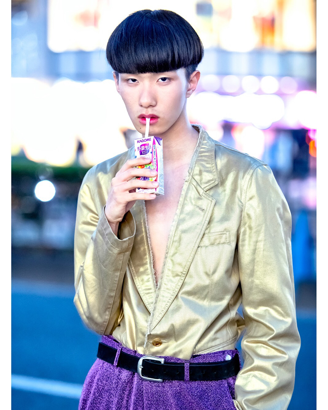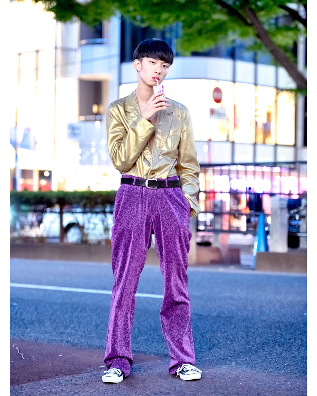 17-year-old Japanese high school student Ryoki (@watanaberyoki) on the street in Harajuku at night wearing a gold Comme Des Garcons jacket with resale sequin pants and Converse sneakers. We first got to know Ryoki as one of kids who plays Yu-Gi-Oh trading cards with his friends around the street in Harajuku.