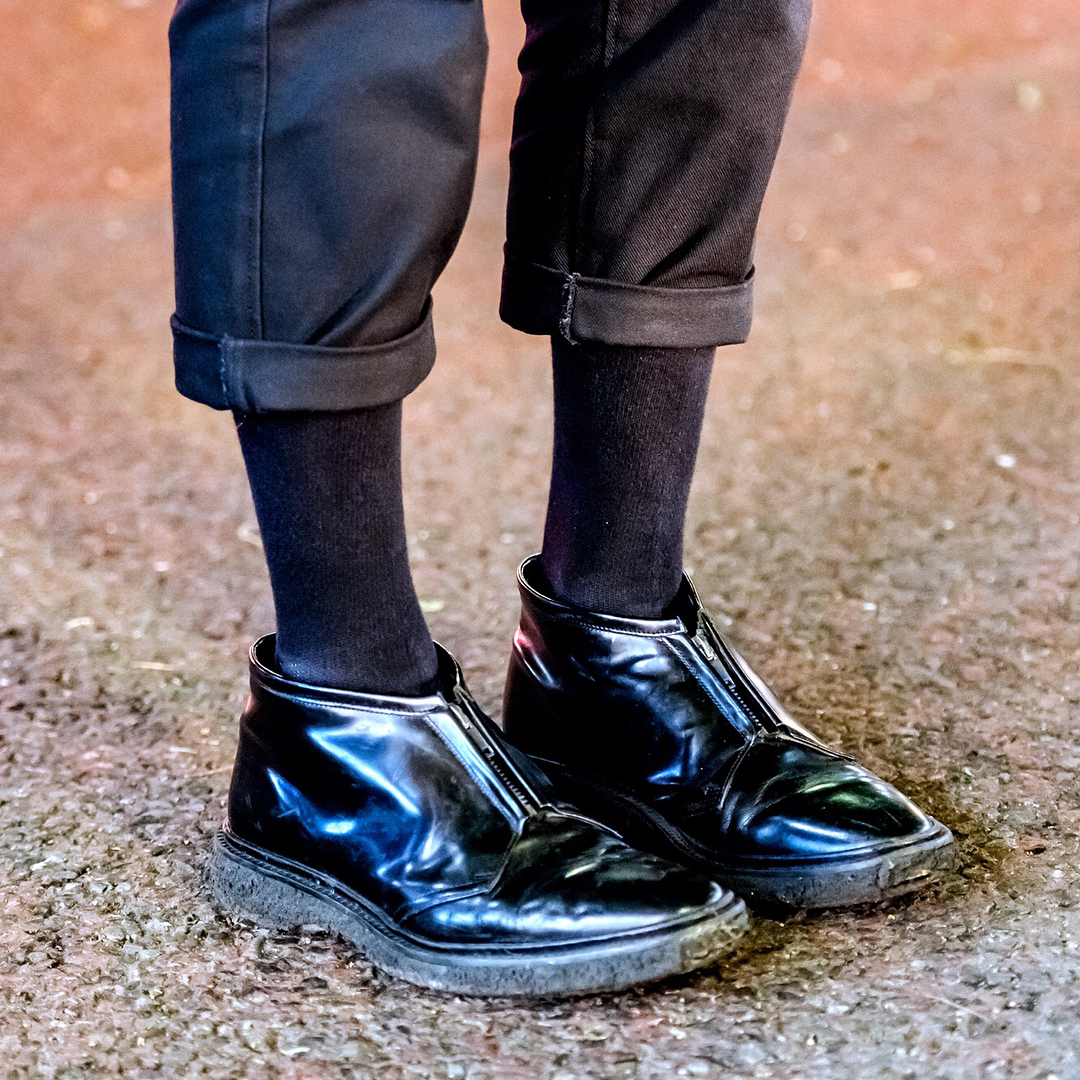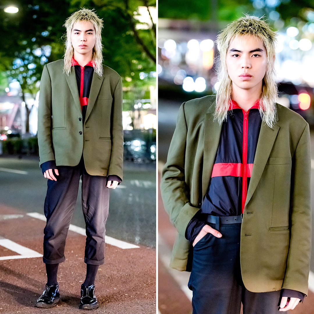 19-year-old Japanese beauty school student Ayumu (@aym_iz) on the street in Harajuku wearing a LittleBig blazer with a Sub-Age shirt, Acne Studios cropped pants, and patent zipper shoes.