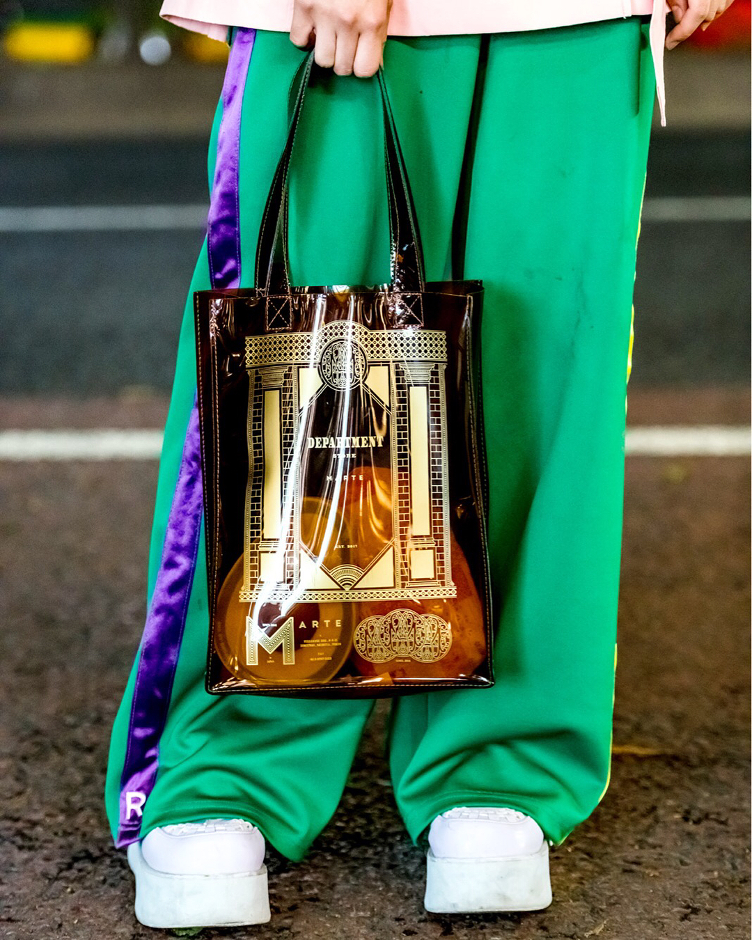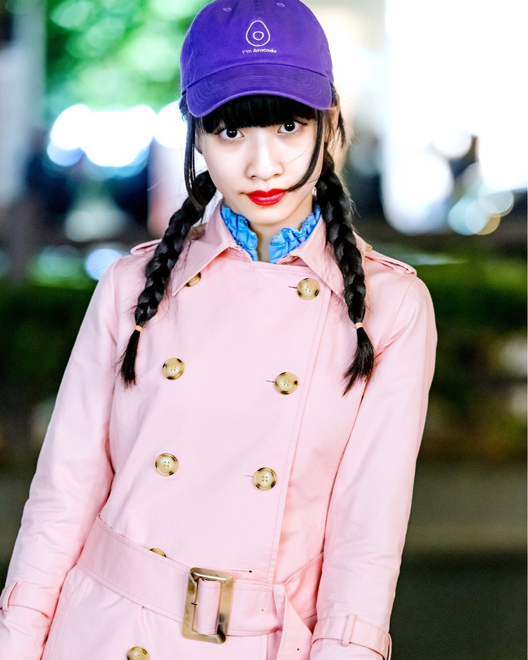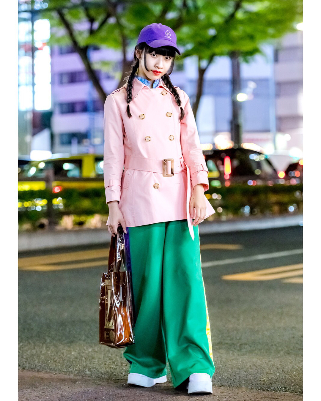 Yoh (@yohsgram) is a 15-year-old Japanese high school student who we often see on the streets of Harajuku recently. This time, Yoh is wearing a vintage pink jacket over a top from San To Nibun No Ichi, RRR by Sugar Spot Factory pants, platforms, and a see through tote from Marte Tokyo.