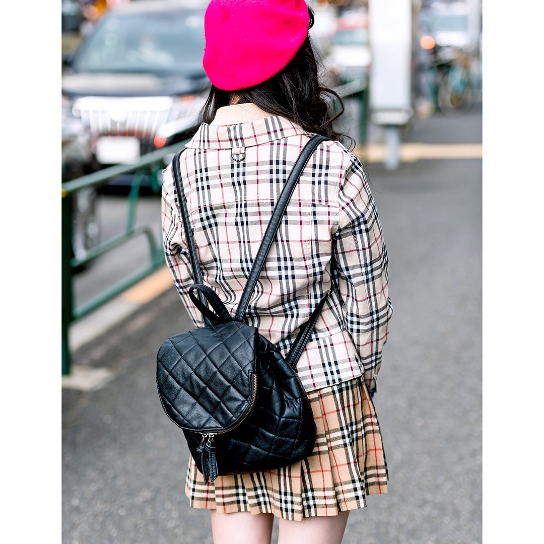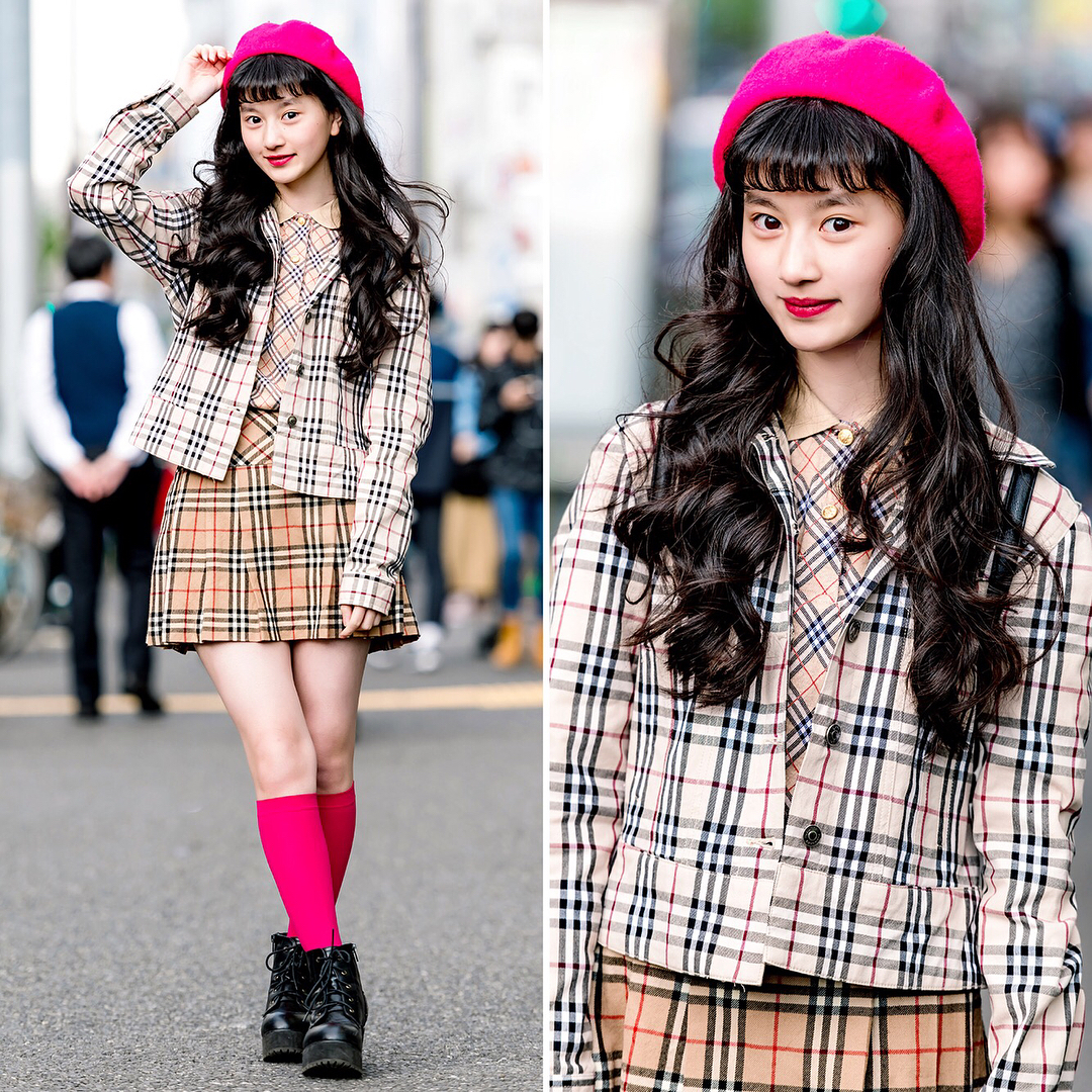 14-year-old Japanese street style personality A-Pon (@a_ponnnn) on the street in Harajuku wearing a plaid look with a jacket, top, and skirt by Burberry, WEGO platforms, and a pink beret.