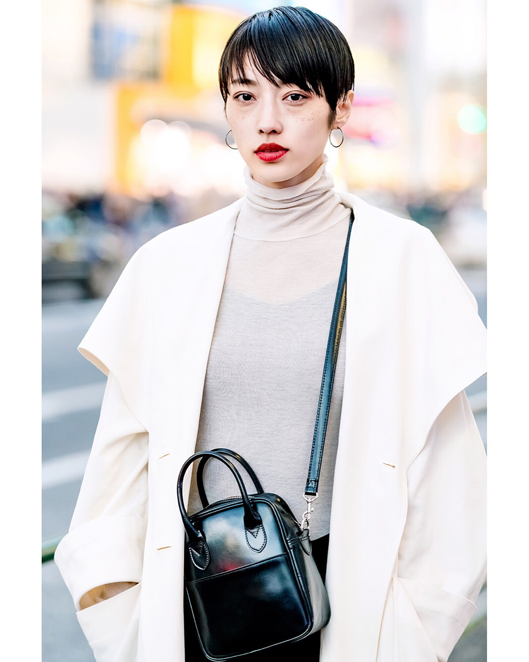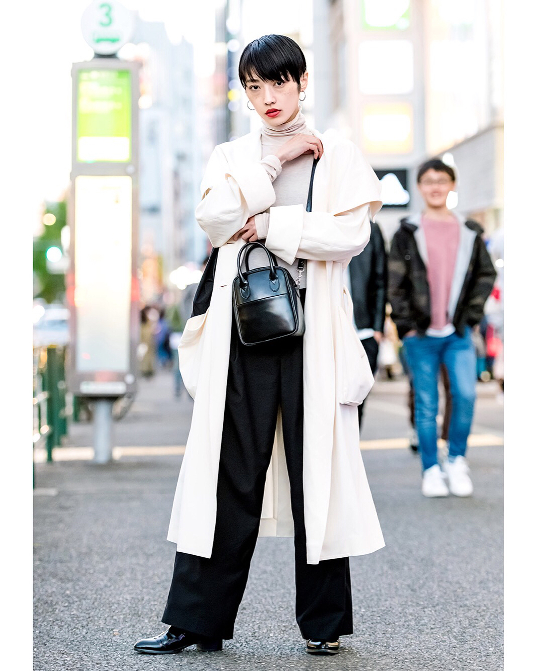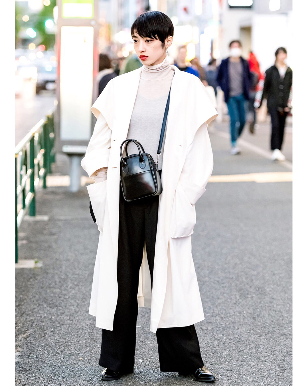 Hako (@hakohotta) a Japanese model wearing a minimalist style with a coat by Rito and a Comme Des Garcons bag, on the street in Harajuku. Tokyo FashionAloJapan.com