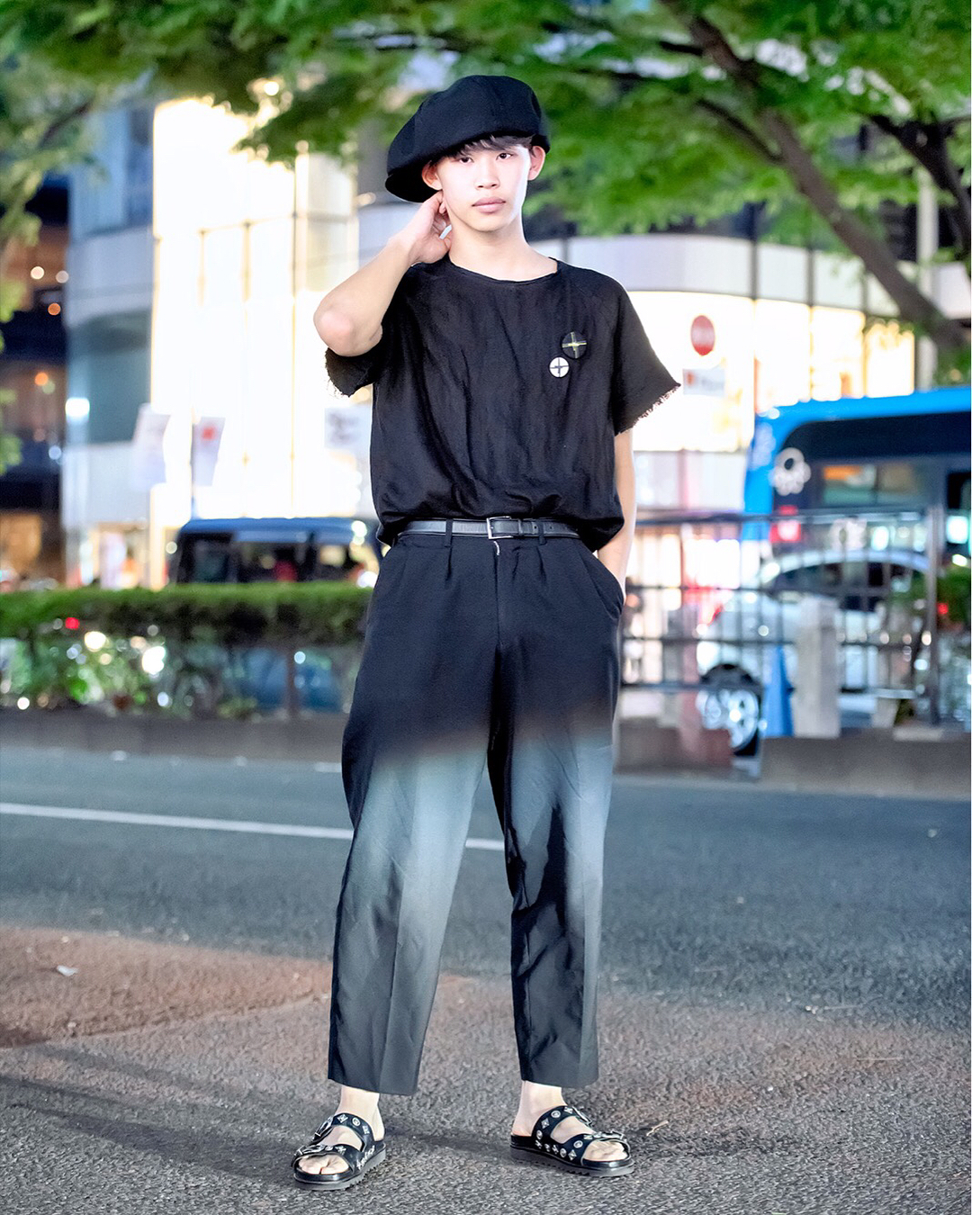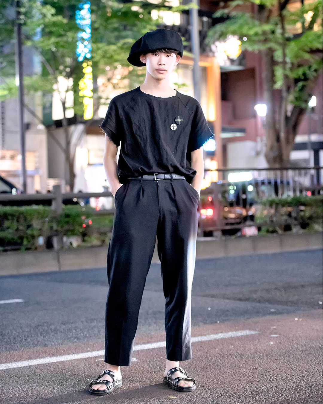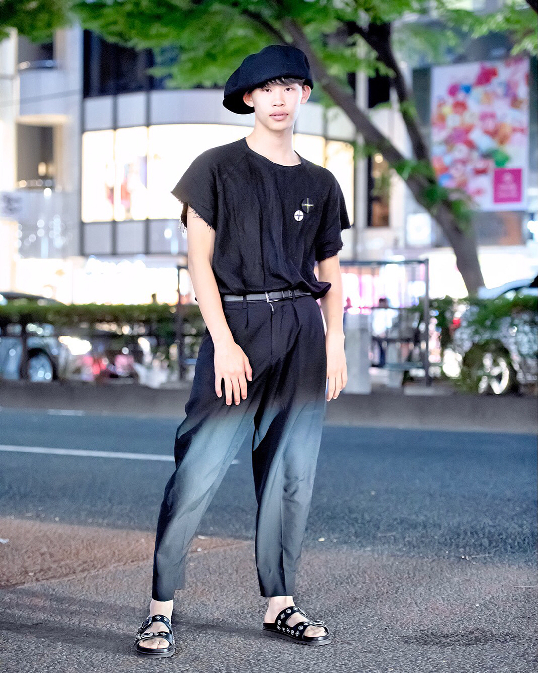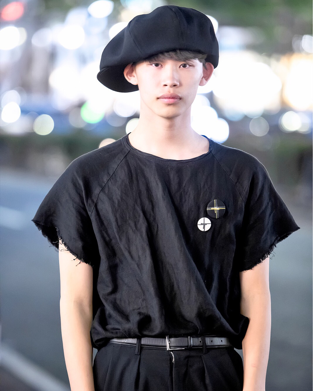 17-year-old Japanese model and high school student Yura (@yrnkn__) on the street in Harajuku wearing a minimalist look with a black t-shirt, pleated Yohji Yamamoto pants, Toga sandals, and Christopher Nemeth pins. Yura’s birthday was yesterday (he turned 17) and he speaks fluent English if you want to wish him Happy Birthday on his Instagram!!