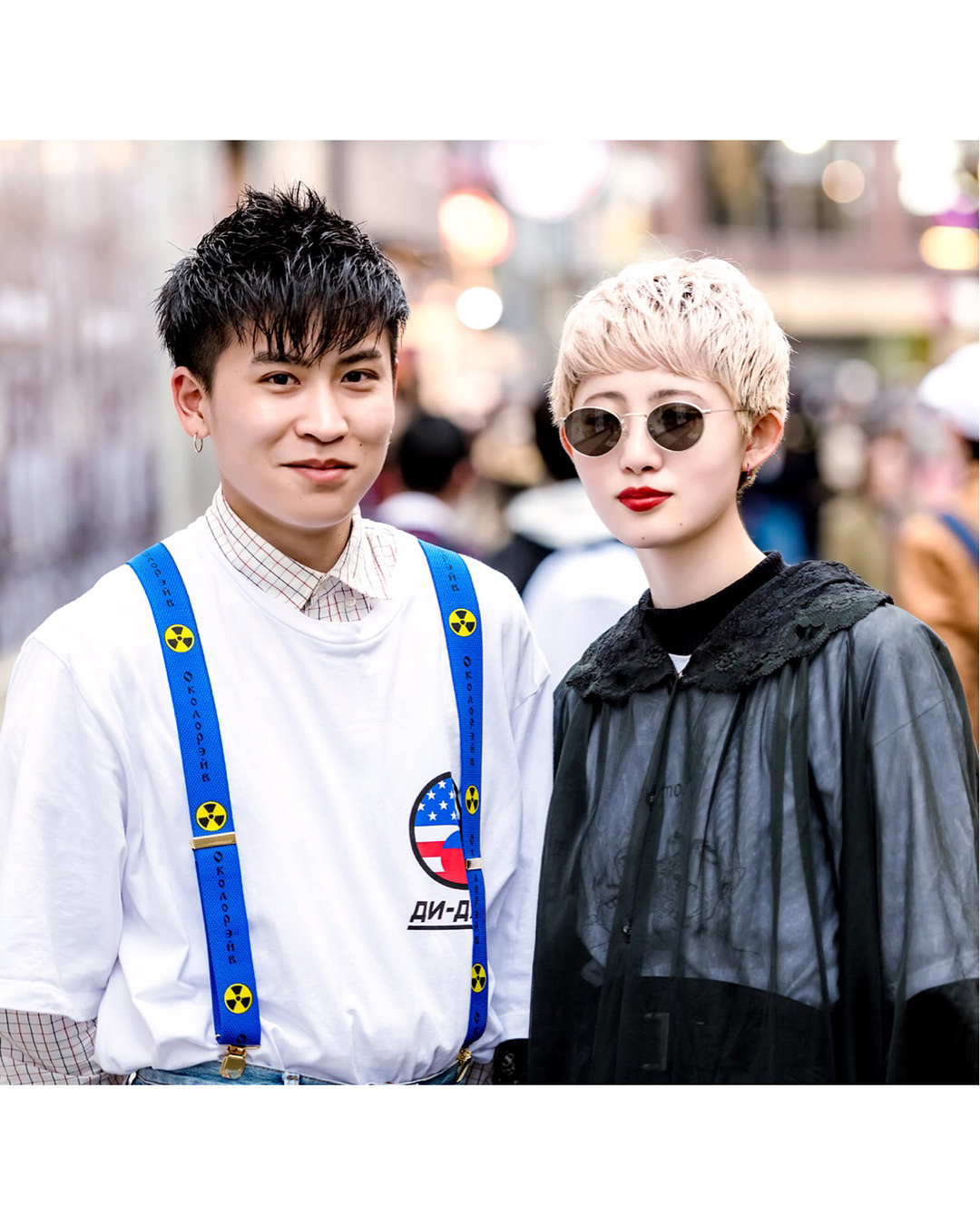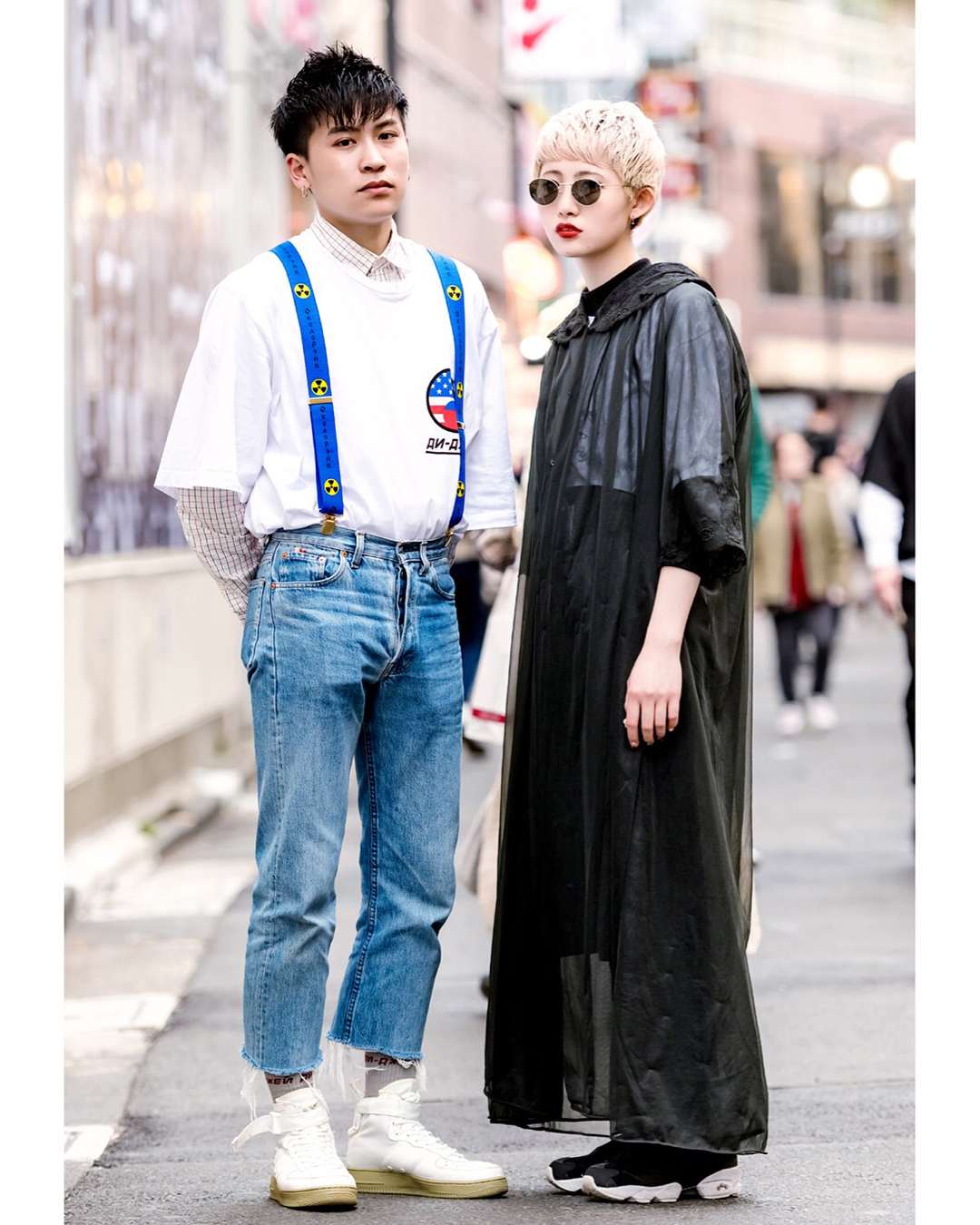 20-year-old Tomoki (@nakatomoki) and 18-year-old Meika (@garinton_meimei) on the street in Harajuku. He’s wearing Gosha Rubchinskiy supenders and t-shirt with cropped denim and sneakers. She’s wearing a sheer Ewear coat over a Nemo tee, skirt, and Reebok sneakers.