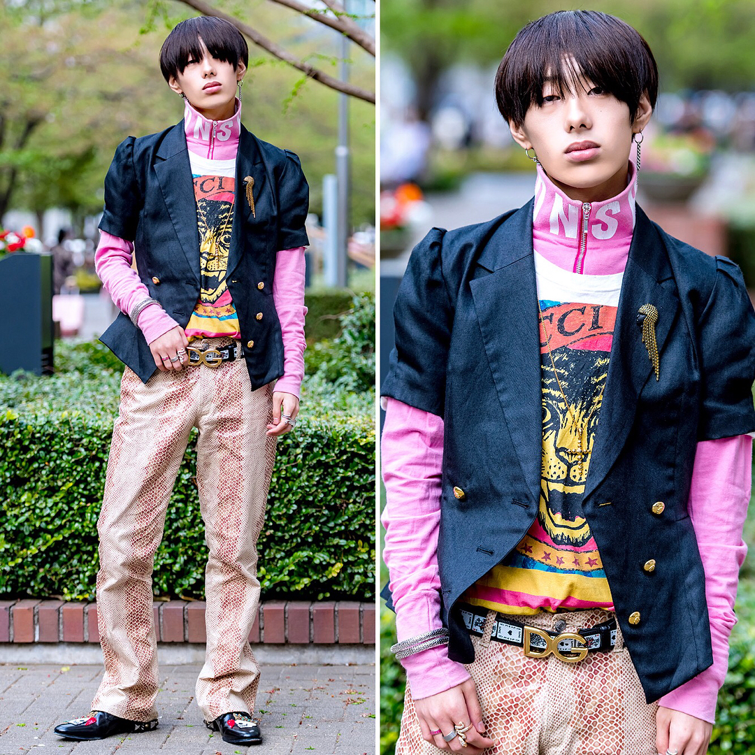 20-year-old Japanese male model @Manaya_Tsunoda on the street near Bunka Fashion College wearing a jacket from The Four-Eyed Tokyo, a Gucci tee over a Christopher Shannon top, snakeskin pants from Kinji, D&G skull applique shoes, and a D&G belt.