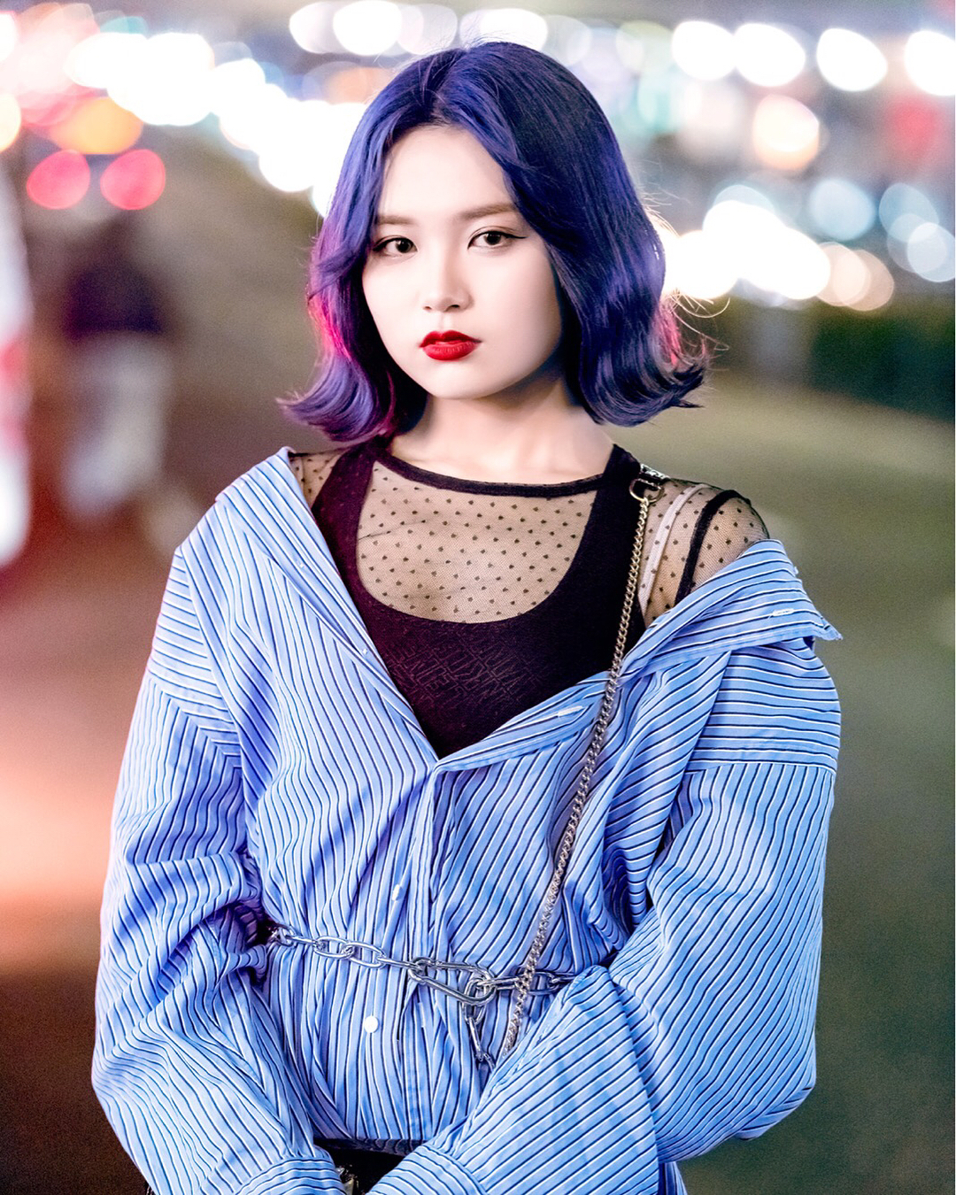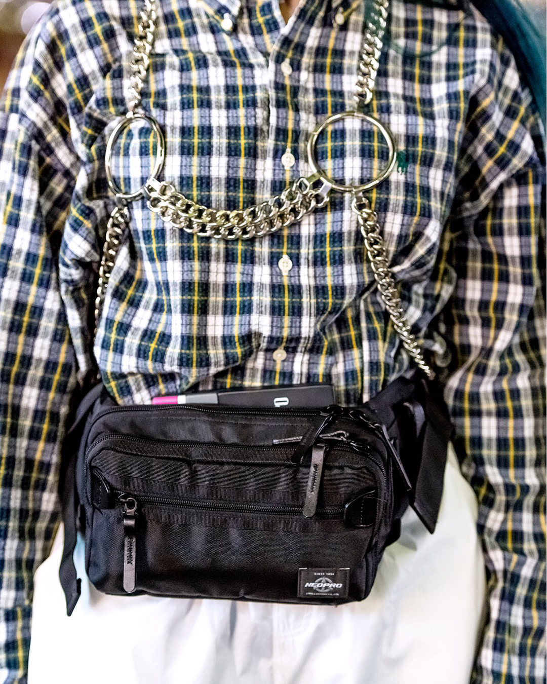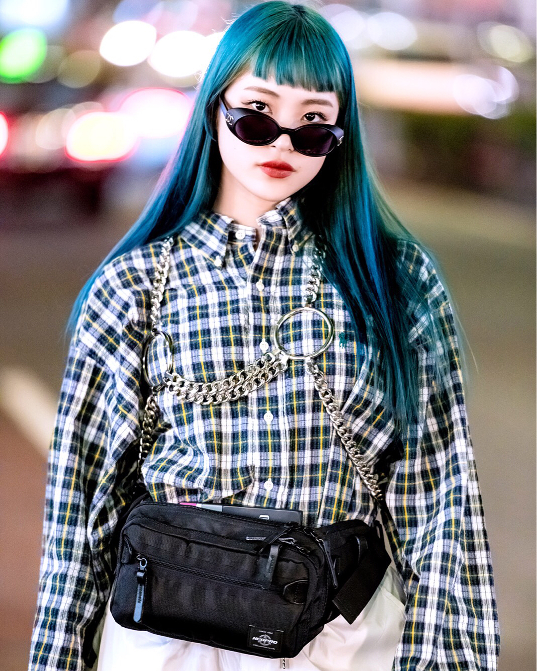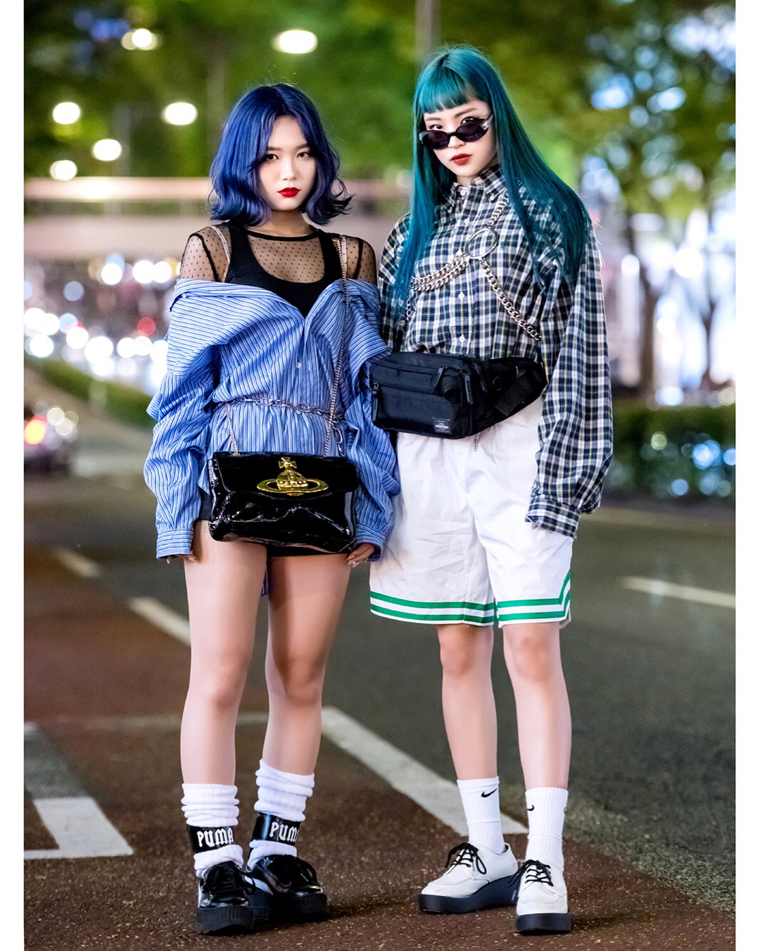 17-year-old Mari (@dwgran) and 15-year-old Airi (@x____iri) on the street in Harajuku after dark wearing fashion color coordinated with their hair including items from Fenty Puma, Polo Ralph Lauren, Vivienne Westwood, H&M, Nike, and Chanel.