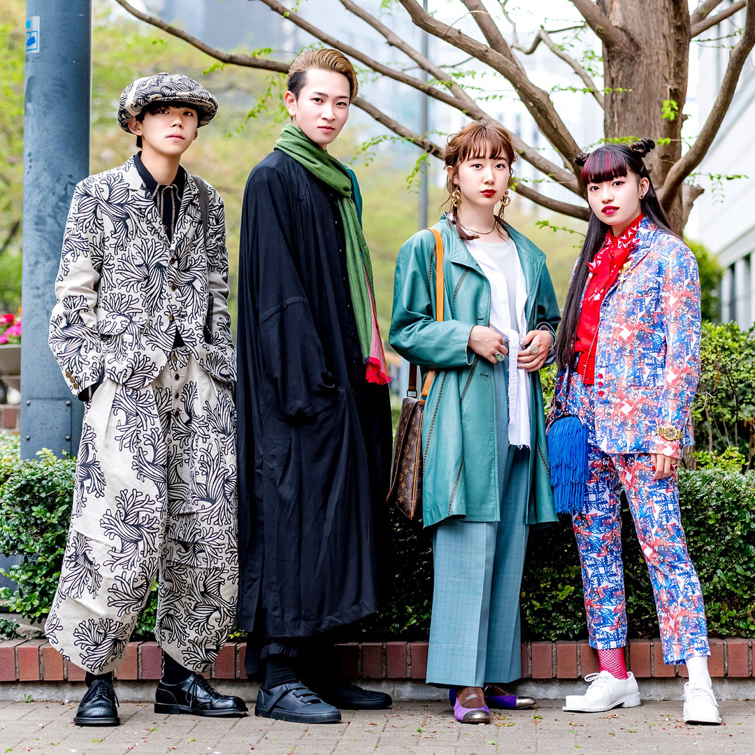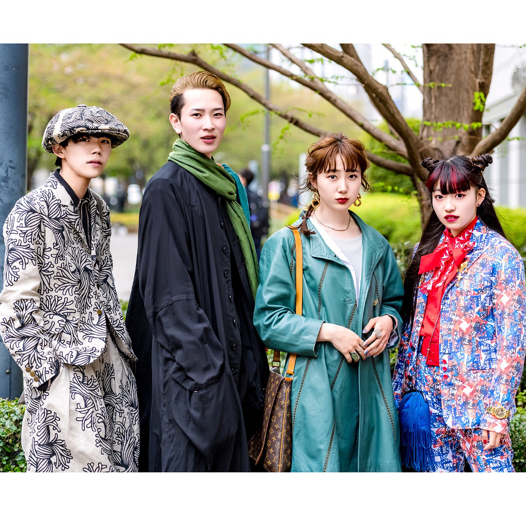 Fashion students Shota (@immrsht73), Shunsuke (@xx.margatsni), Ayako (@ayapachi0609) and Sakura (@sakura__ra_ra) on the street near Tokyo’s Bunka Fashion College wearing items from vintage shops, Christopher Nemeth, Yohji Yamamoto, Rick Owens, LV, Dowbl, Kinji Harajuku, Ikumi, TokyoHumanExperiments, and Vivienne Westwood.