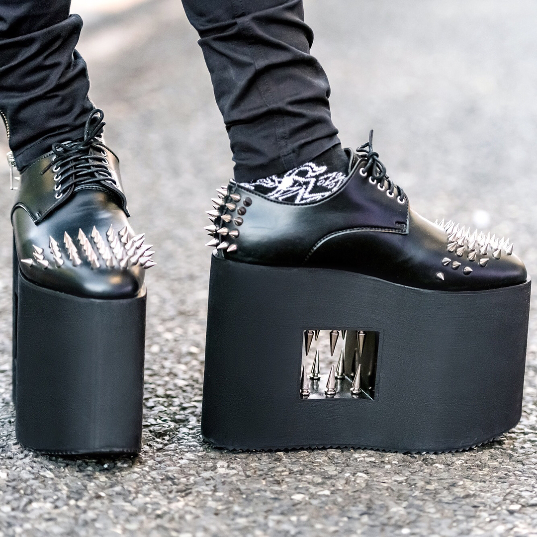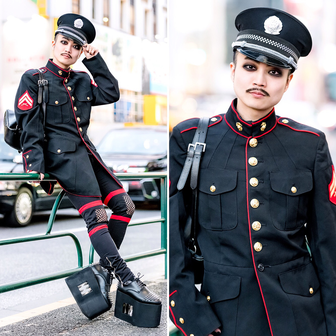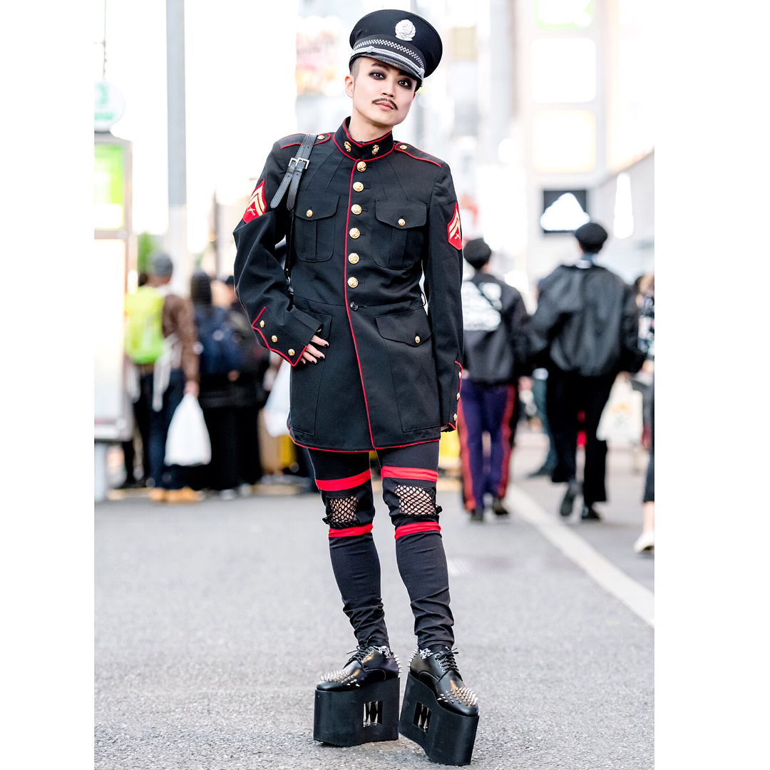 Japanese DJ and composer Ohshi (@oshy_wu) on the street in Harajuku wearing a vintage US Navy coat with cutout pants by the Harajuku brand MilkBoy, giant platforms with spike-filled cutouts by Monster Shoes, and an agnes b. bag. Swipe left to see Ohshi’s @Monster_Shoes!