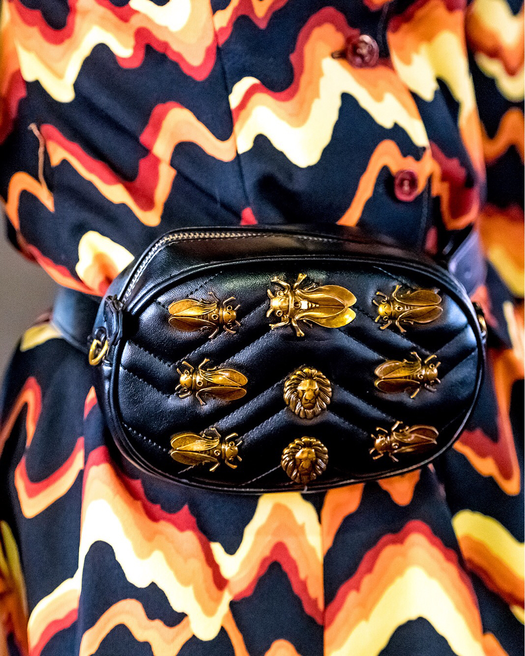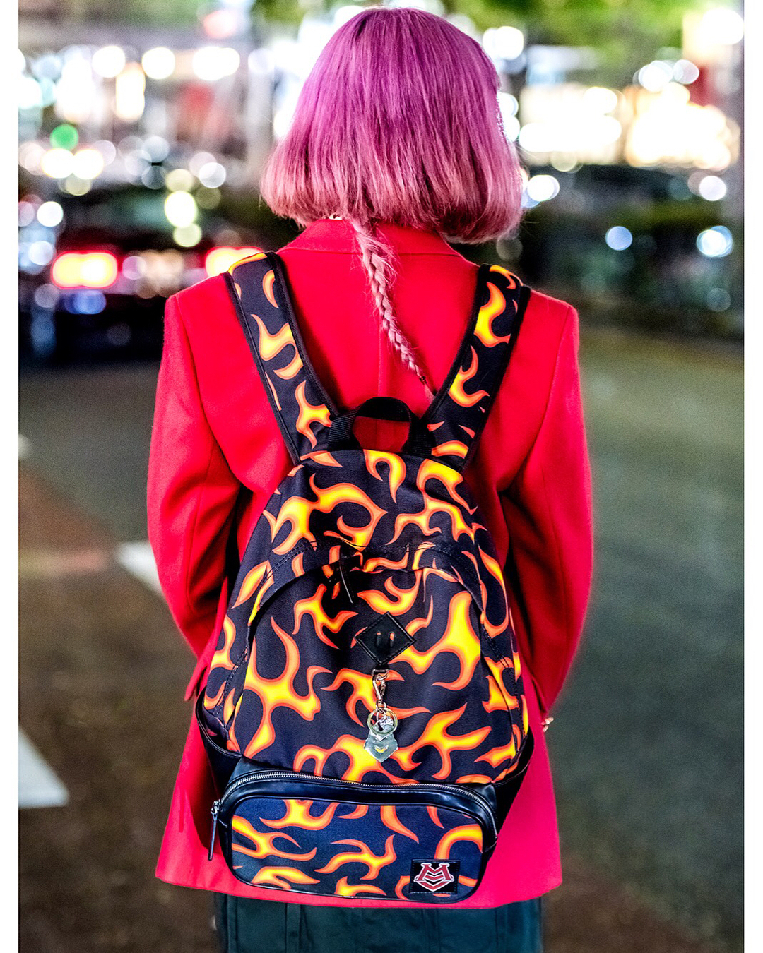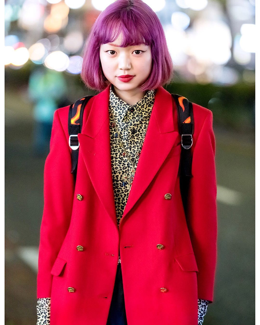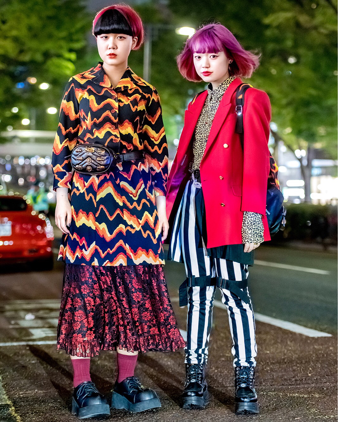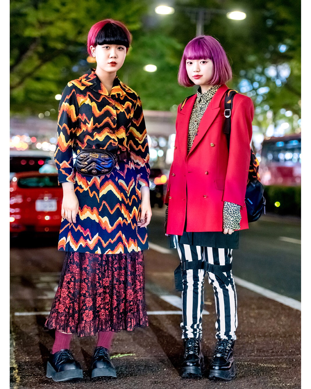 18-year-old Japanese fashion students Ayano (@shimoaya_122) and Hikari (@h_iai) on the street in Harajuku wearing colorful mixed prints styles with items from Tokyo vintage shops, Kinji Harajuku, Demonia, ME, Dog Harajuku, Moschino, and Burberry. Swipe left to see Ayano’s insect-covered waist bag!!