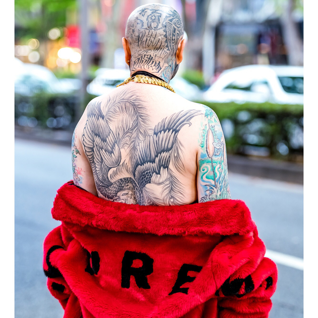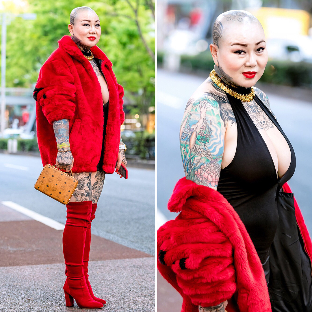 Fashion boutique owner Amy on the street in Harajuku wearing a red faux fur Supreme coat with a black dress, red boots, MCM box bag, Versace necklace, and Chanel bracelet. Swipe left to see Amy’s amazing back tattoo.