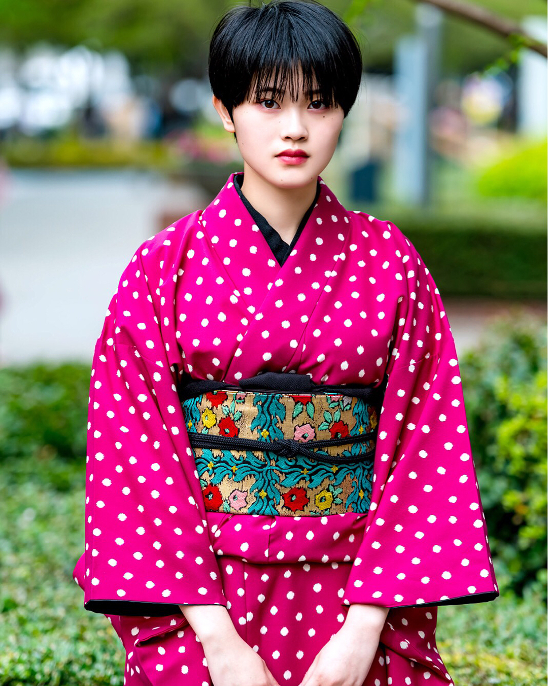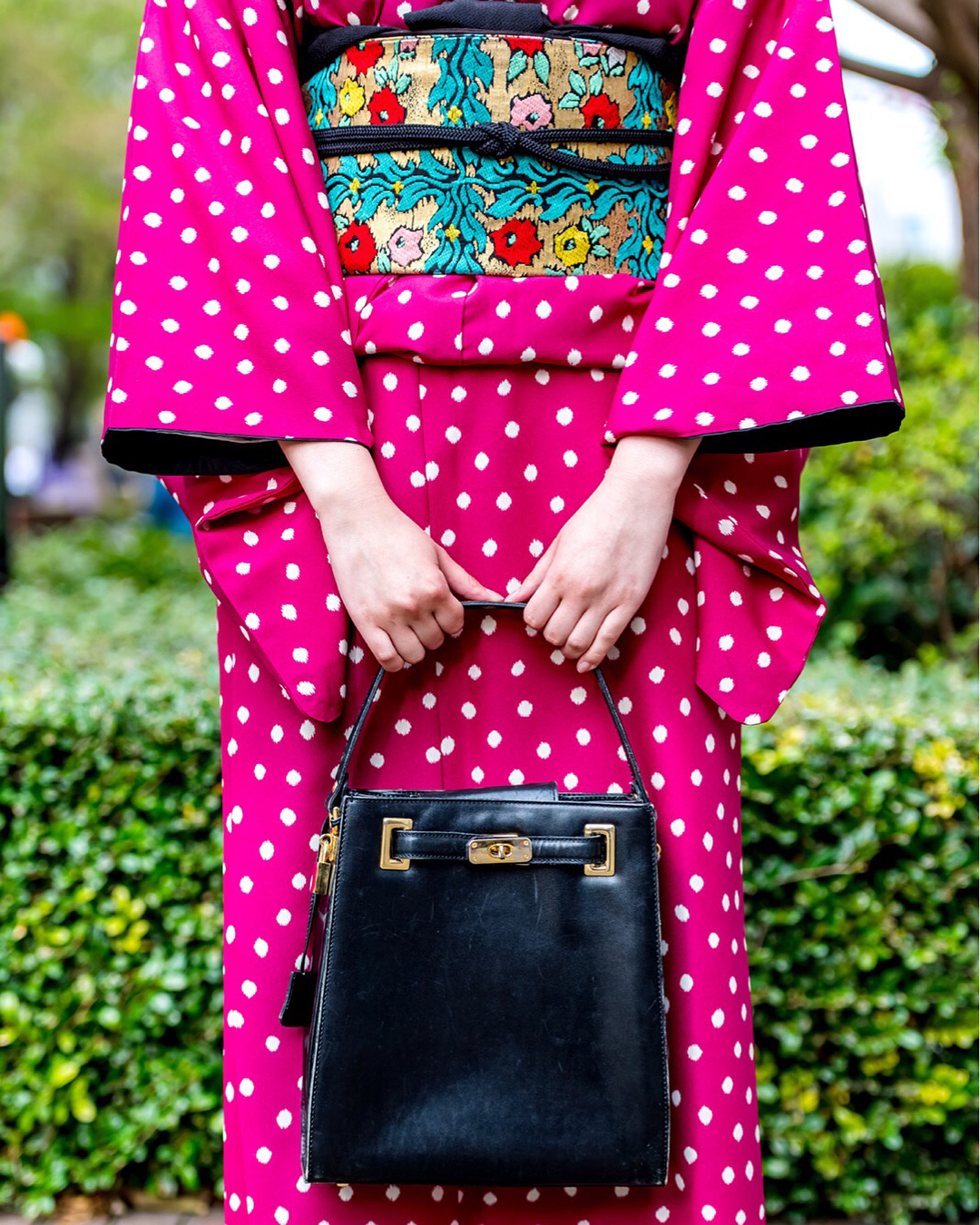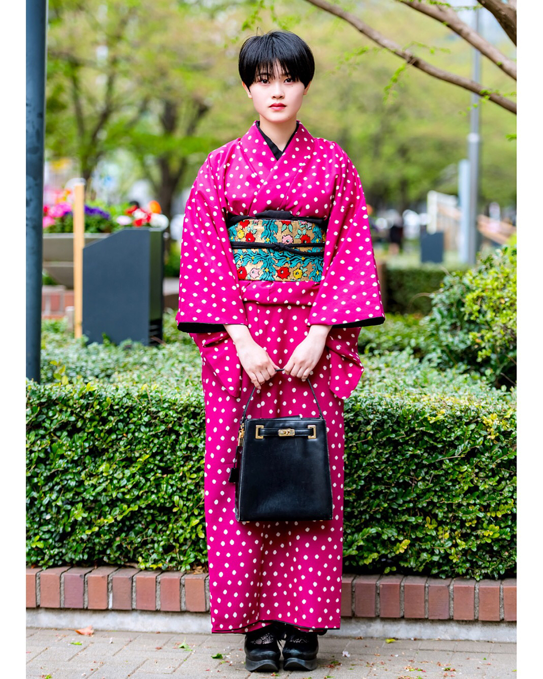 Japanese fashion college student Haruka (@harehana1003) on the street in Tokyo wearing a pink polka dot kimono with a floral obi, leather bag, and Tokyo Bopper platforms.