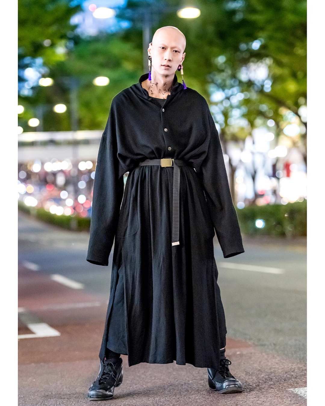 Japanese musician and model Shouta (@tananasho) on the street in Harajuku at night wearing Yohji Yamamoto, Comme Des Garcons, Vivienne Westwood, and Nike.