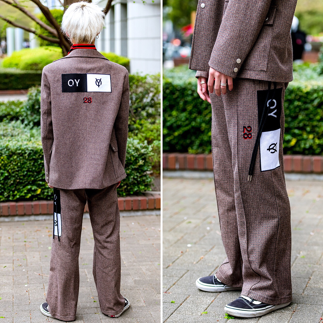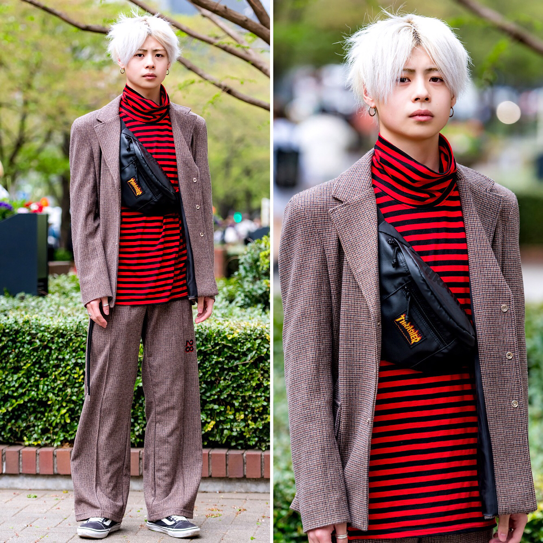 18-year-old Japanese fashion student Matthew (@dra___gm21) on the street in Tokyo near Bunka Fashion College wearing a tweed suit by OY Korea with a Live in the Moment Tokyo striped top, Thrasher crossbody bag, and Vans sneakers.