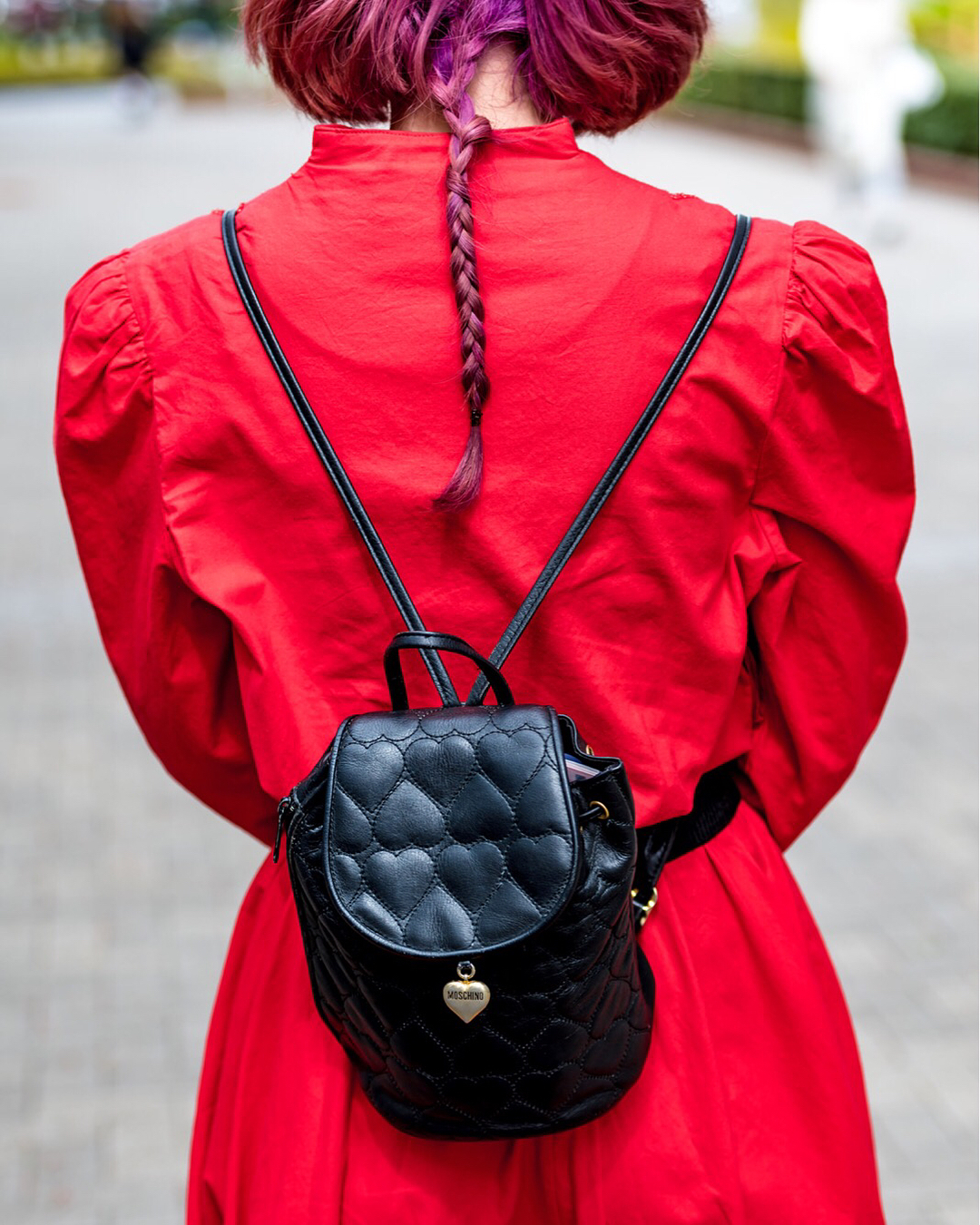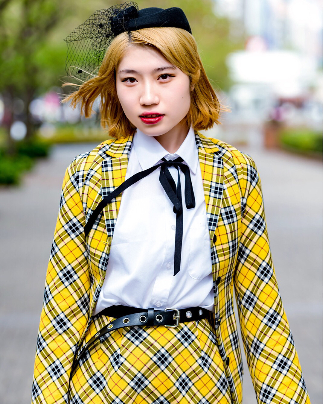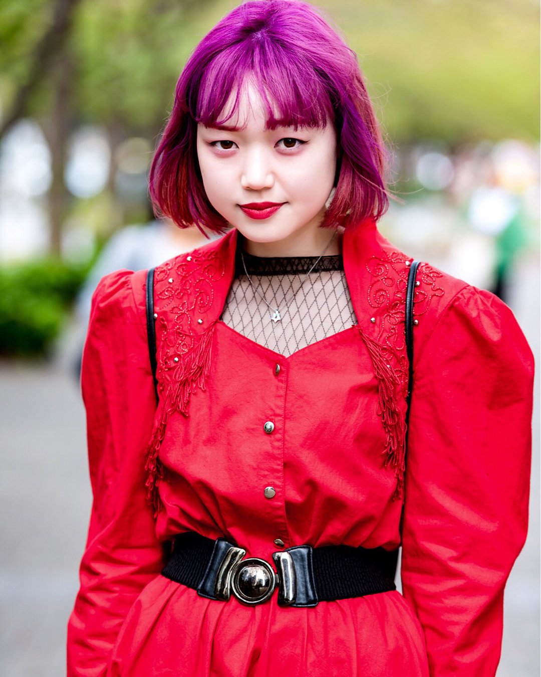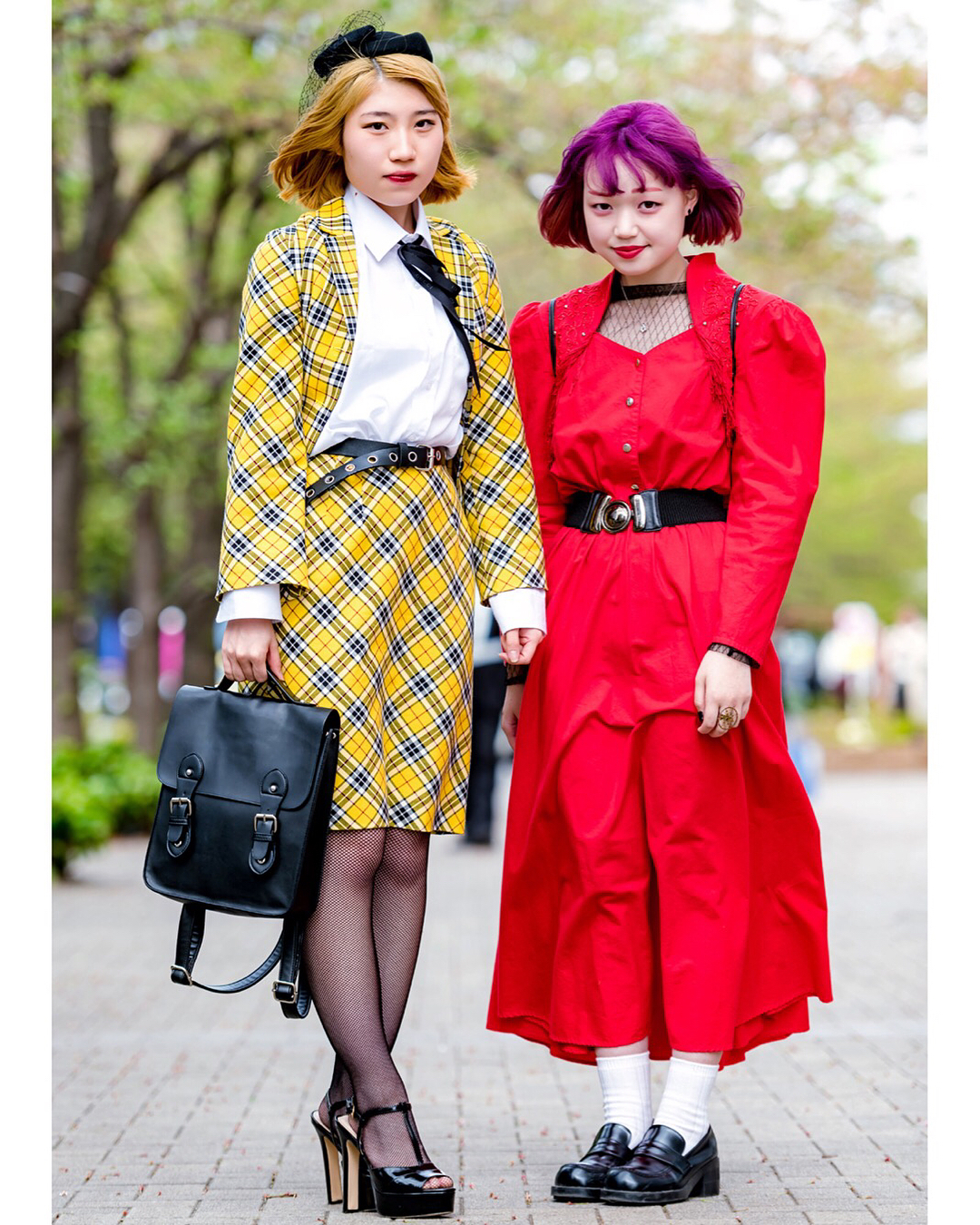 18-year-old students Hayaka (@_hyk_18_) and Hikari (@h_iai) on the street near Bunka Fashion College in Tokyo wearing colorful vintage styles with items from Punk Cake Harajuku, Moschino, and WC Harajuku.