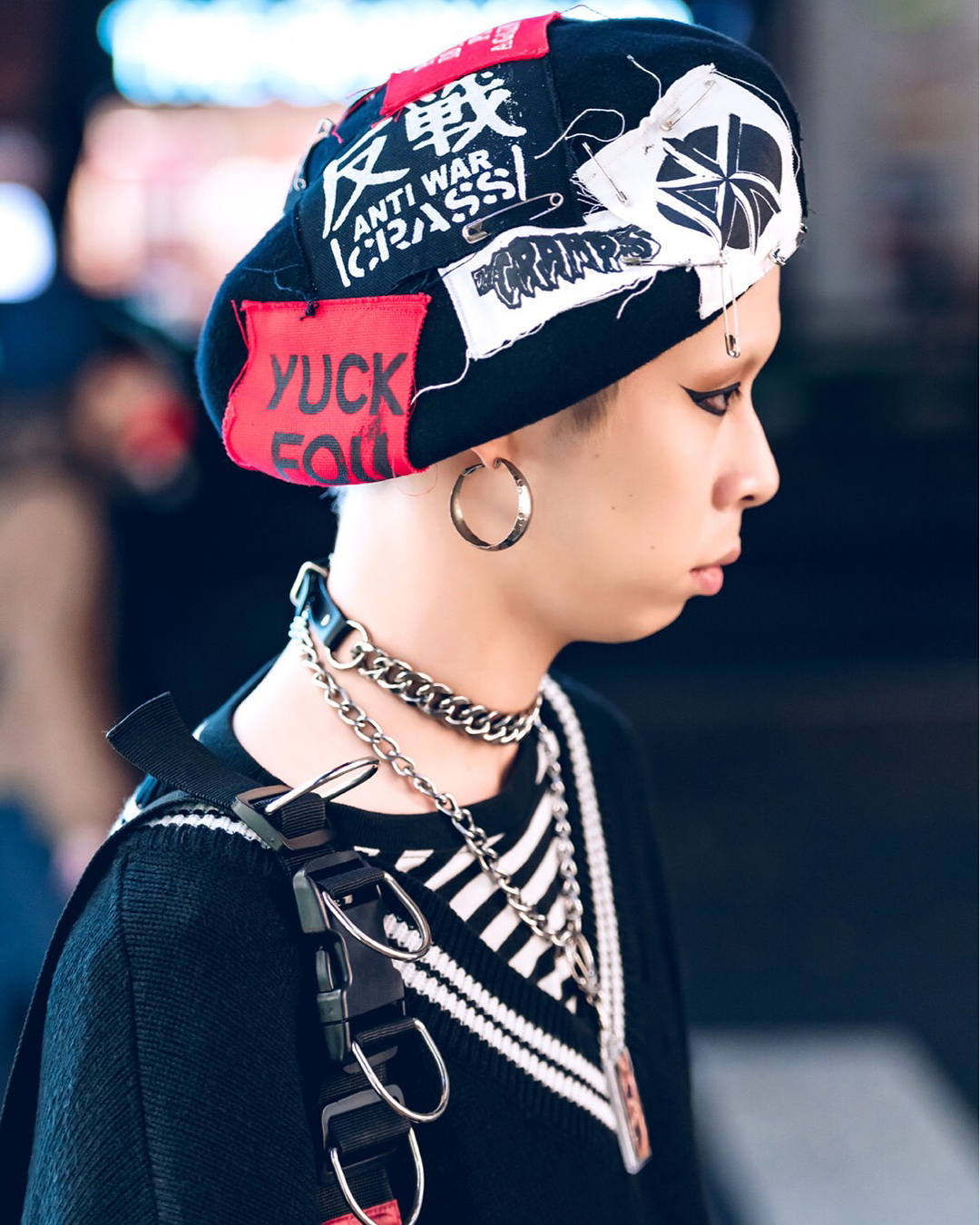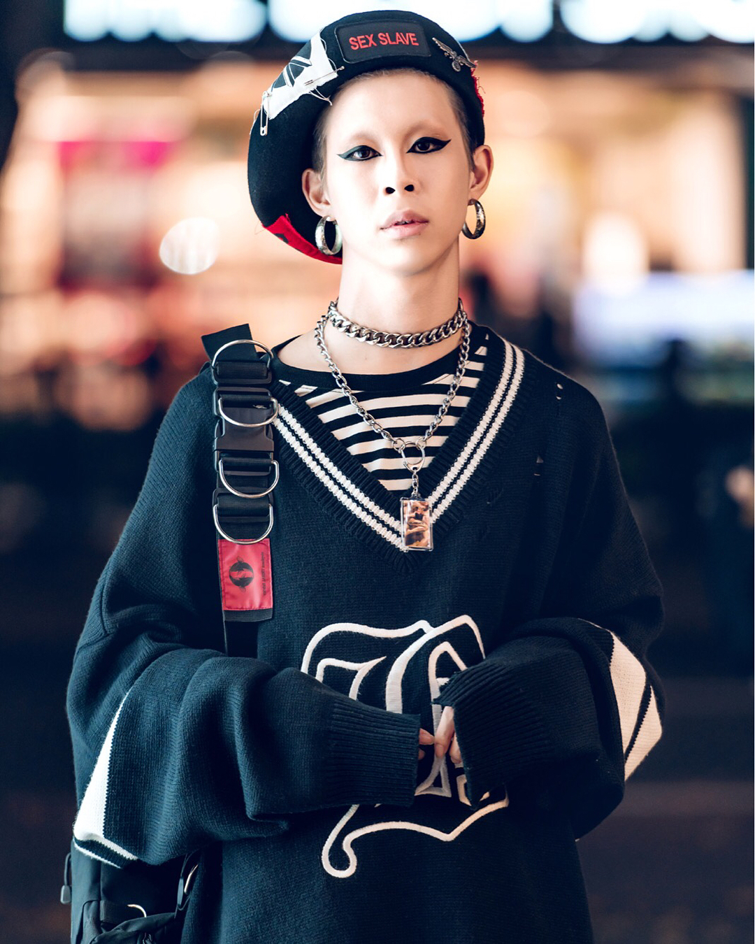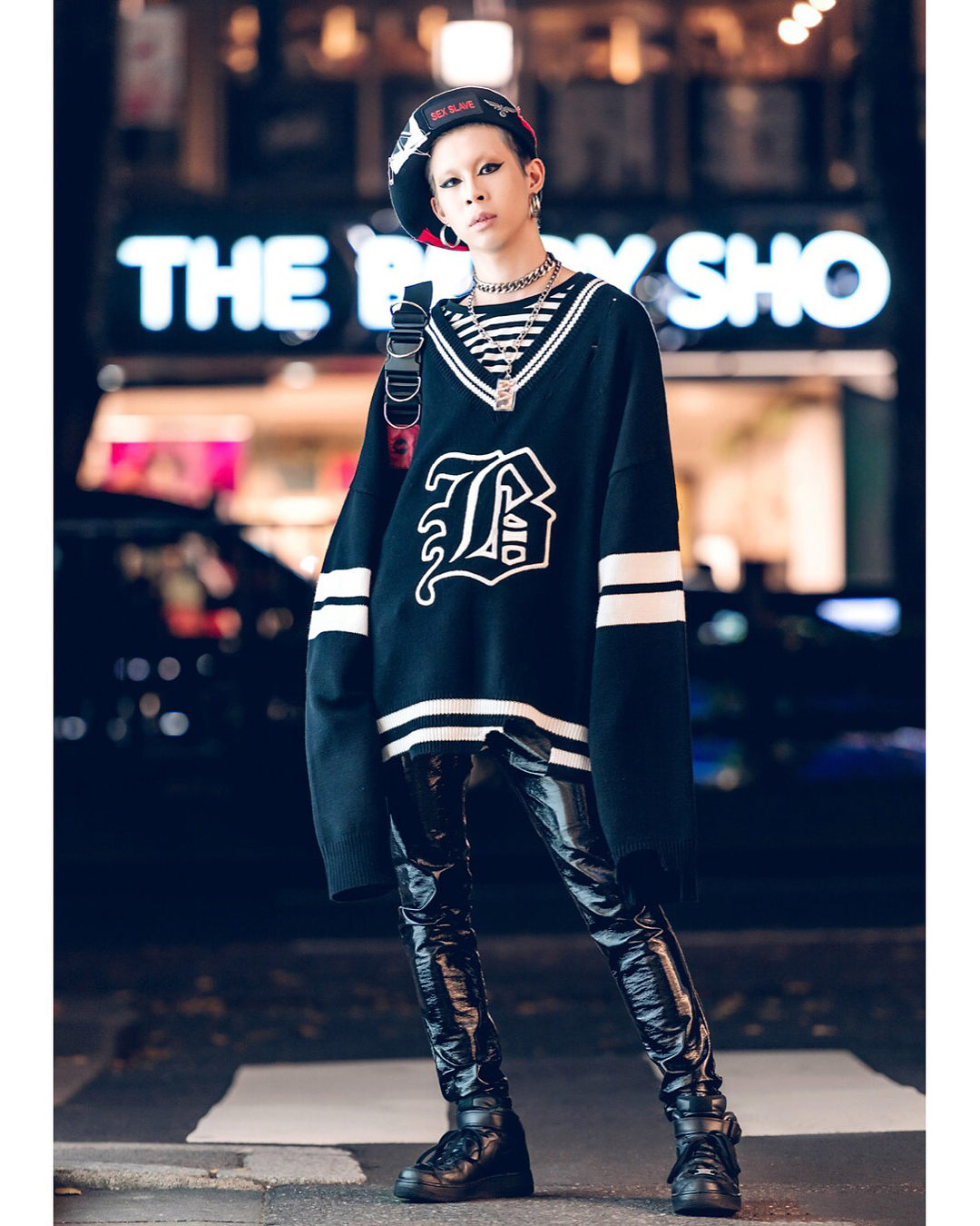 @Tokyo Fashion: Cham (@daaaaaaicham) on the street in Harajuku at night wearing a v-neck sweater…