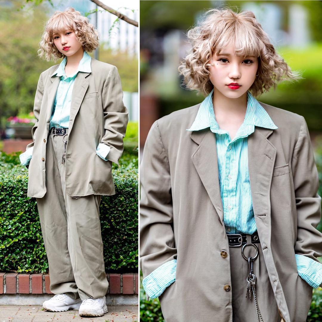18-year-old Japanese fashion student Megumi (@Megu1999mi) on the street in Shinjuku wearing an oversized vintage suit from Faith Tokyo with a Polo Ralph Lauren shirt and white Fila sneakers. Her keychain is vintage Harley Davidson.