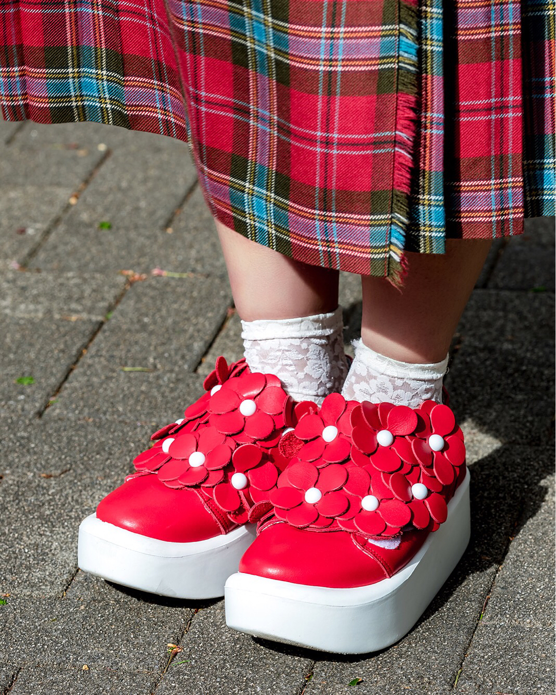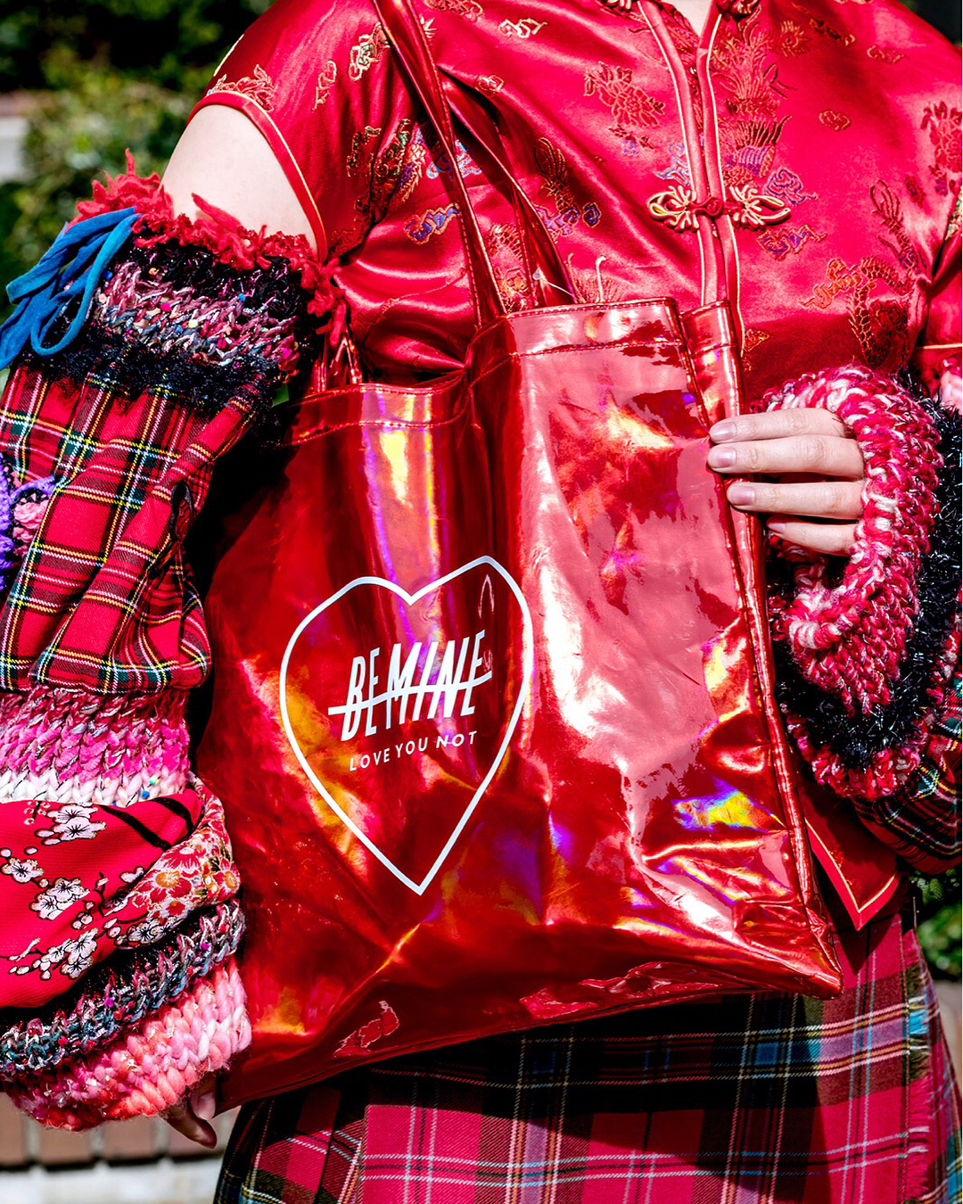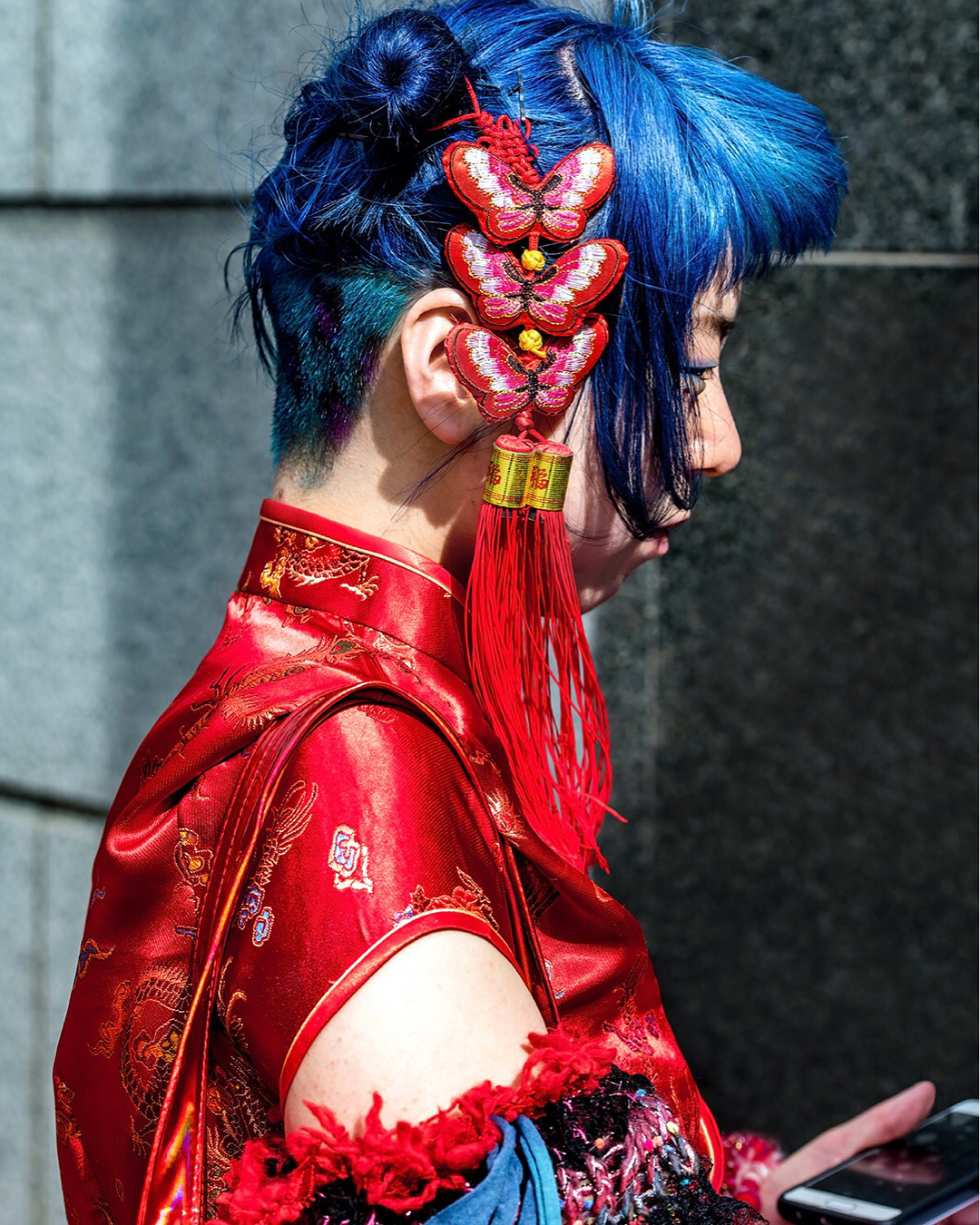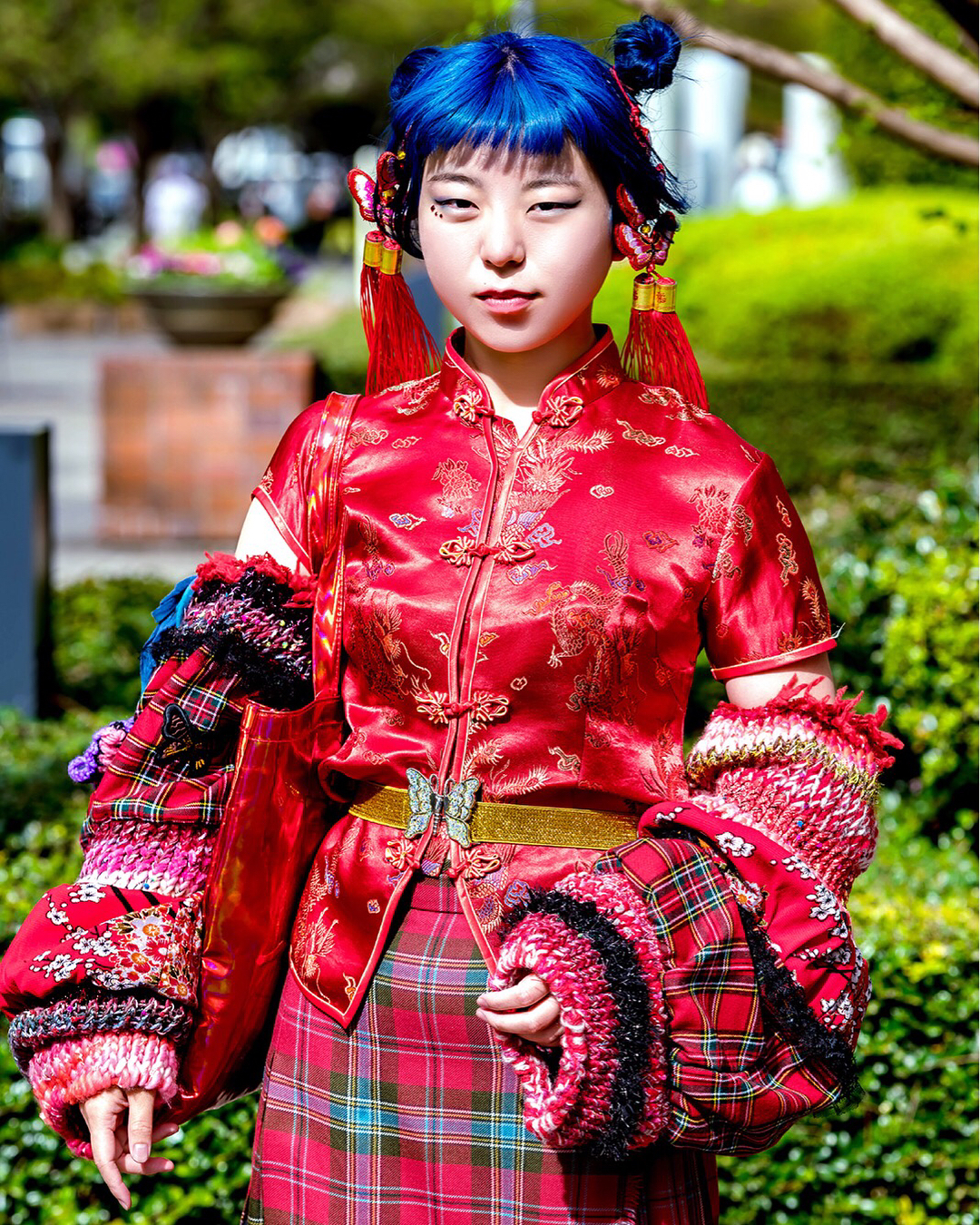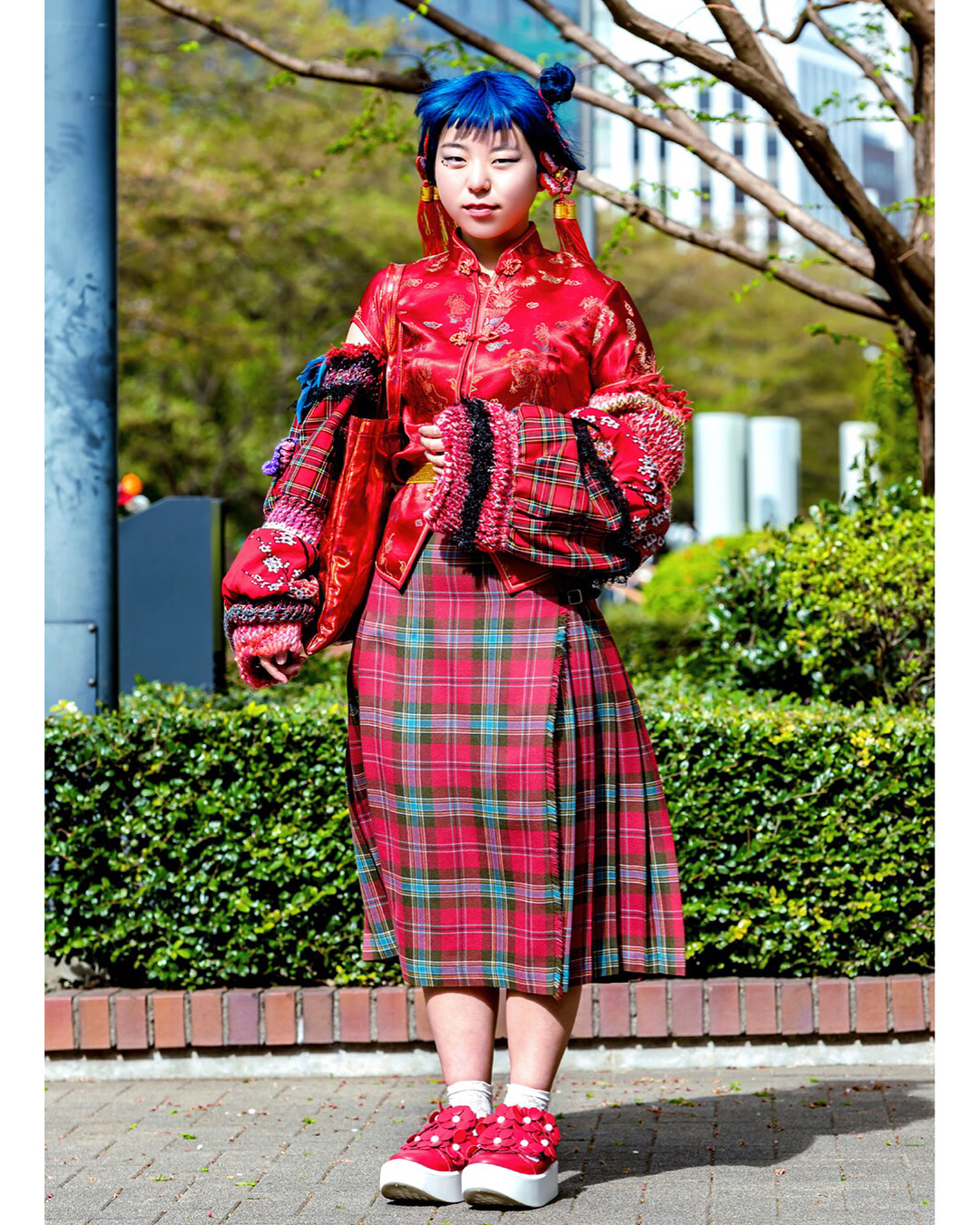 18-year-old Lisa (@drawing_risa) with blue hair and mixed prints fashion on the street near Bunka Fashion College in Tokyo. Her outfit includes items from vintage shops, items purchased in Chinatown, a WEGO bag, and Tokyo Bopper platforms.