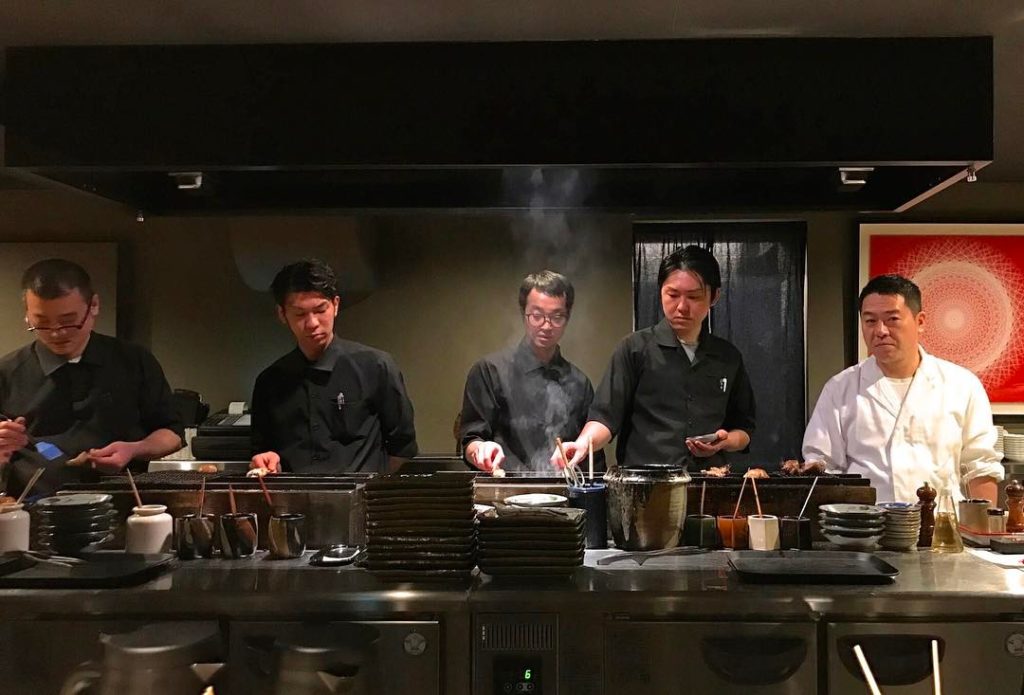 Chef Takashi Imai (far right) stands with his staff behind the charcoal grills at his new Jingumae restaurant, Yakitori Imai. The chef takes “yakitori” to the next level by pairing it with natural wines and serving chicken liver pate. (Robbie Swinnerton @tokyofoodfile photo) #Japan #Tokyo #yakitori #東京 #焼き鳥 #instafood #washoku #和食