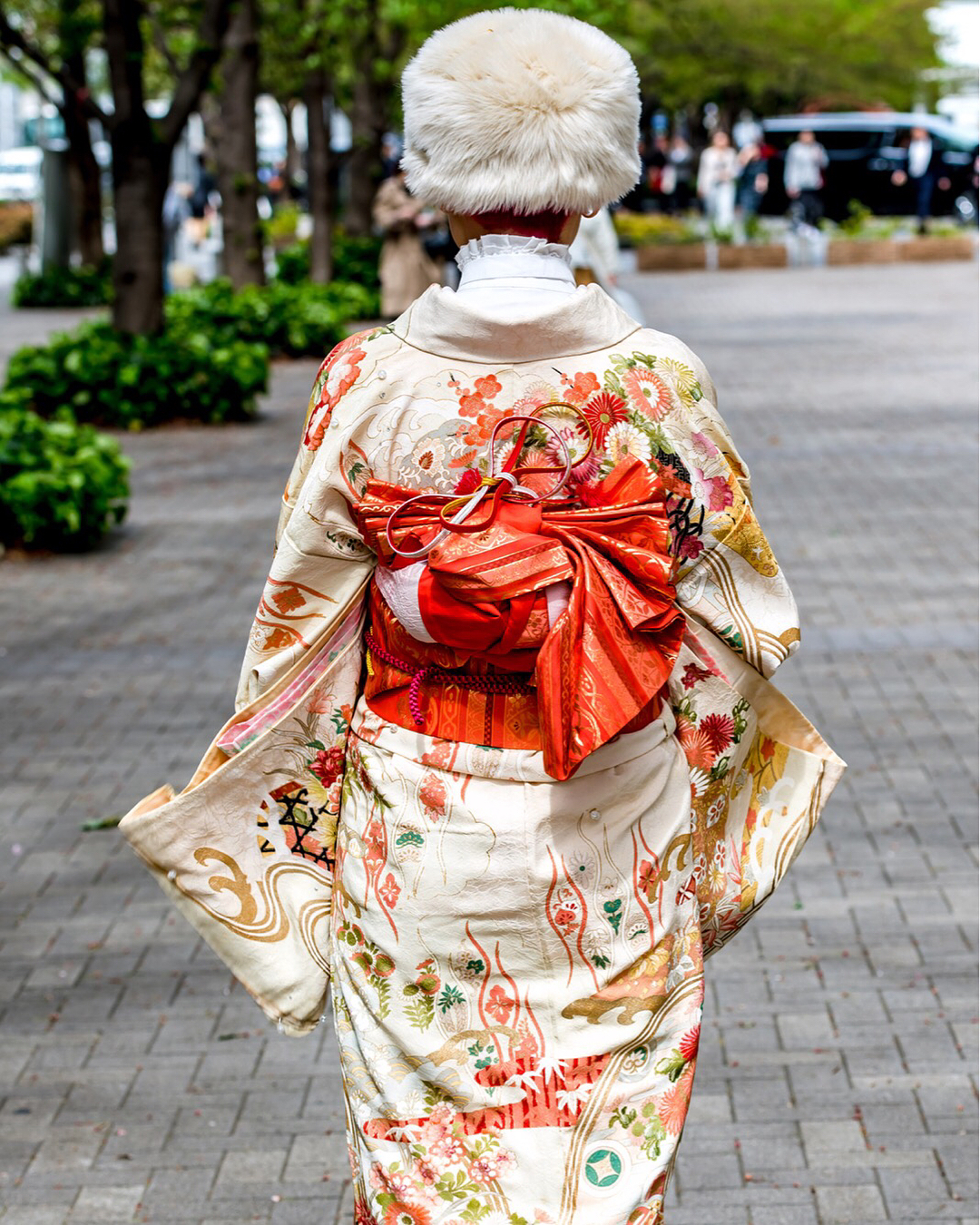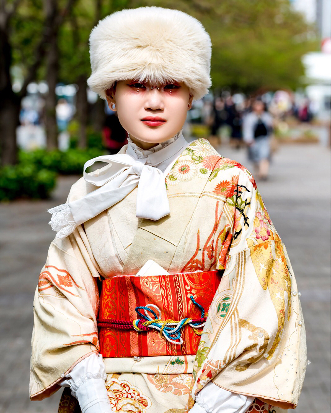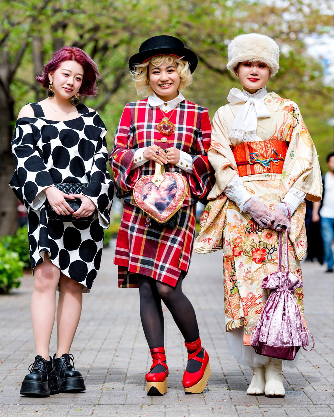 18-year-old Japanese students Riona (@riogacha), Yuka (@rocklove0916), and Ikumi (@ohbahmi) on the street outside of Bunka Fashion College in Tokyo. Riona is wearing a Comme Des Garcons dress with Demonia platforms, Yuka is wearing head-to-toe Vivienne Westwood, and Ikumi is wearing a vintage kimono with tabi boots.