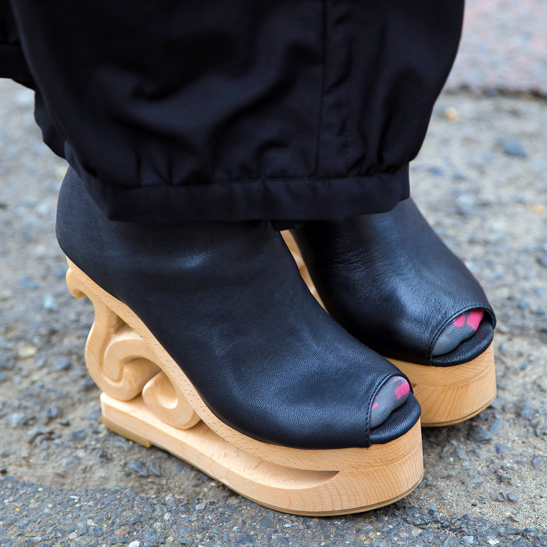 @Uri_Hanazono on the street in Harajuku. He is wearing a teeth shirt from Mineral with a Black Peace Now skirt, Jeffrey Campbell platforms, a Punyus tiger bag, and accessories from Vivienne Westwood and Oh Pearl.