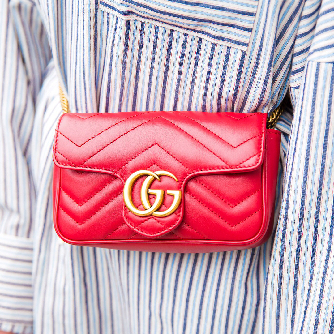 Tokyo fashion college student @Lois_z on the street in Harajuku wearing a shirt dress by Dairiku, Dr. Martens boots, and a Gucci purse converted into a waist bag. Swipe left to see a closeup of the purse-to-waist bag conversion!