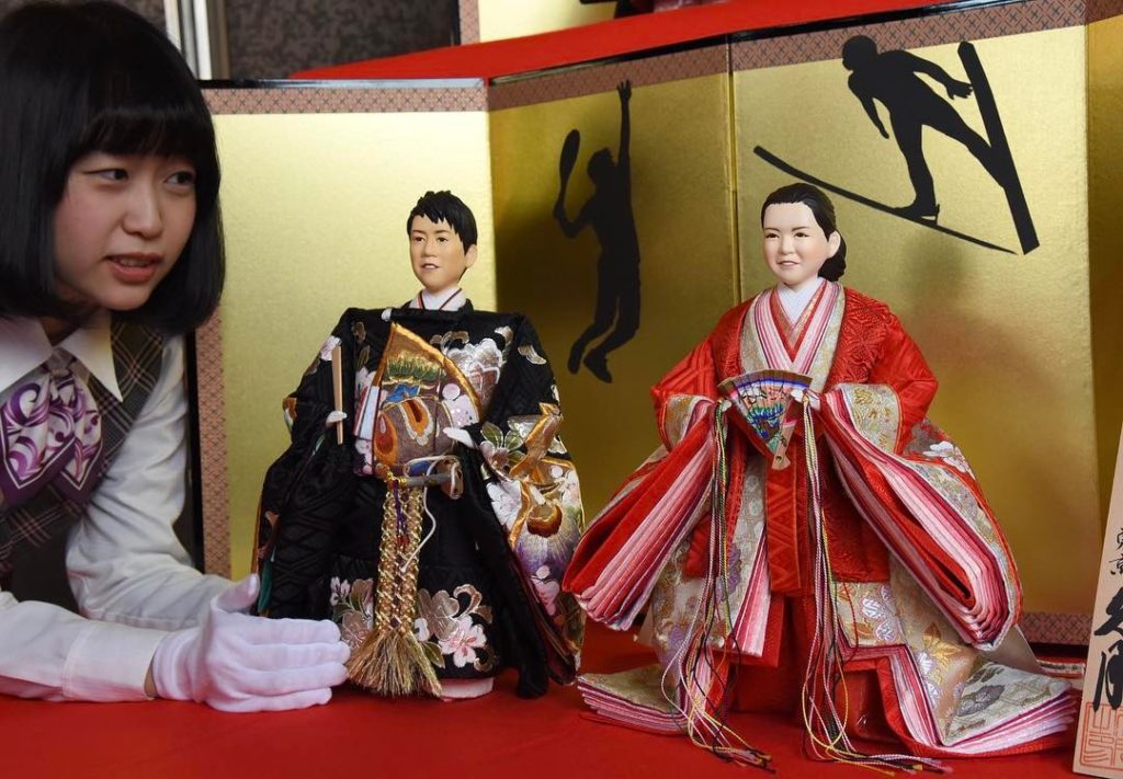 Japanese doll maker Kyugetsu displays sets of “hina” dolls with likenesses of tennis player Kei Nishikori and ski jumper Sara Takanashi at the company’s showroom in Tokyo’s Taito Ward on Jan. 27 ahead of Girls’ Day on March 3. (Satoko Kawasaki photo) #Japan #Tokyo #dolls #雛祭り #東京 #人形 #🎎