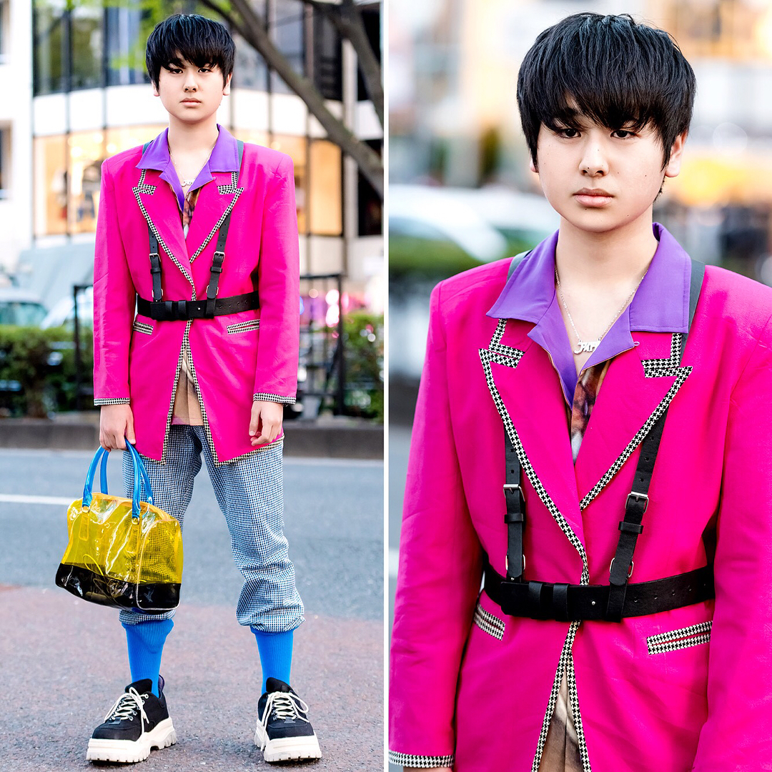 16-year-old Japanese student Taira (@___kusodebu) on the street in Harajuku wearing a black harness over a vintage pink blazer, a shirt from Faith Tokyo, vintage cropped pants, Eytys platform sneakers, and a see though Oh Pearl bag.