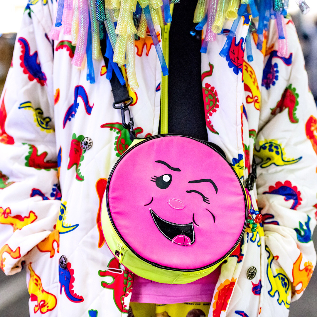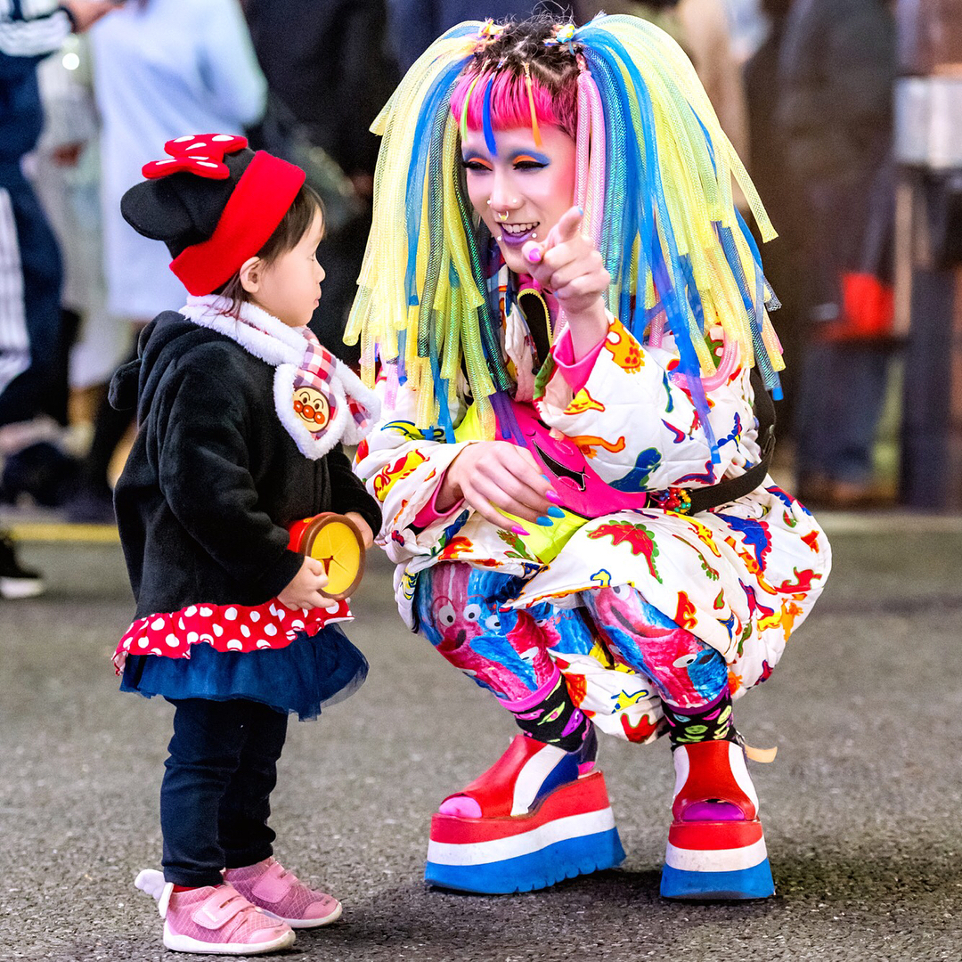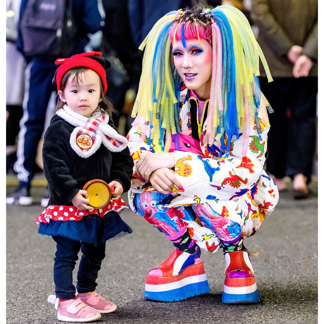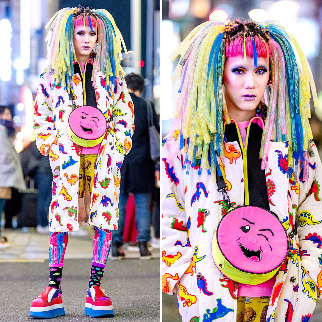 While we were street snapping @Kanata.Circlek in Harajuku, a super cute child walked up, mesmerized by Kanata’s kawaii-ness! Kanata is wearing a vintage dinosaur coat over a 6%DOKIDOKI (@6doki_official) top, graphic shorts, print tights, platform sandals, and a Little Miss Matched “funny face” bag. Swipe left to see Kanata’s full look!