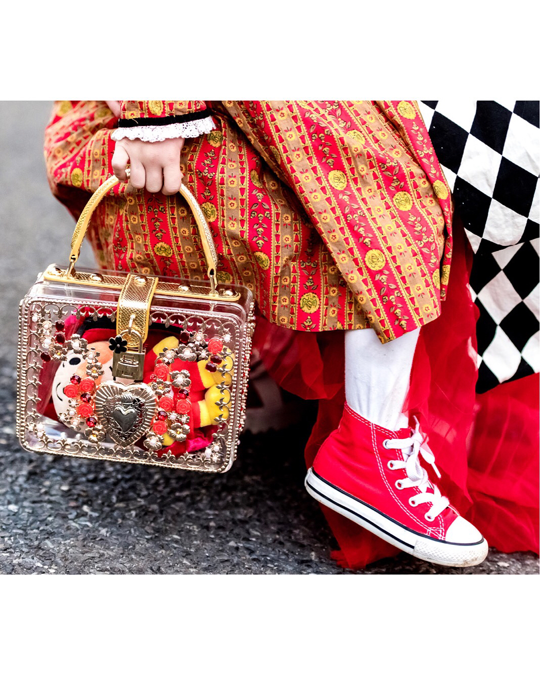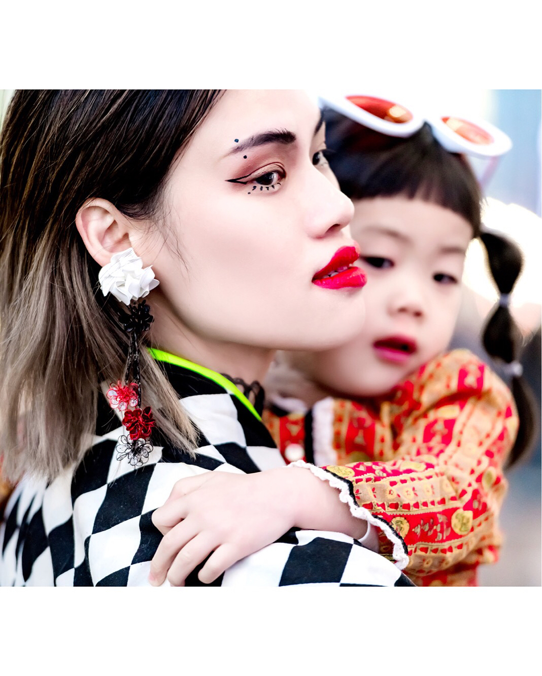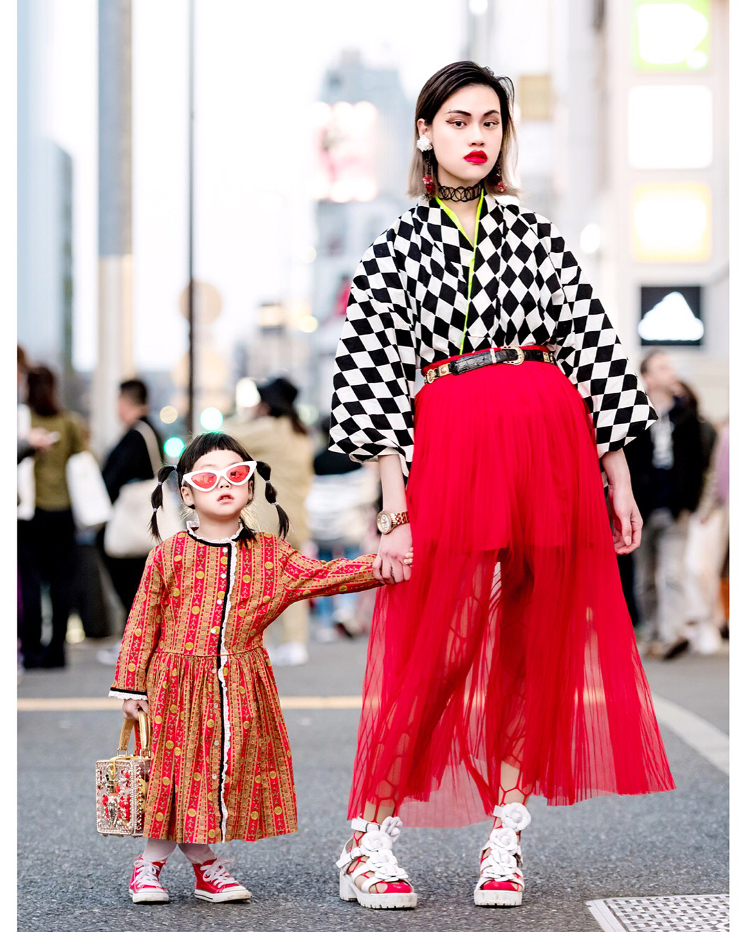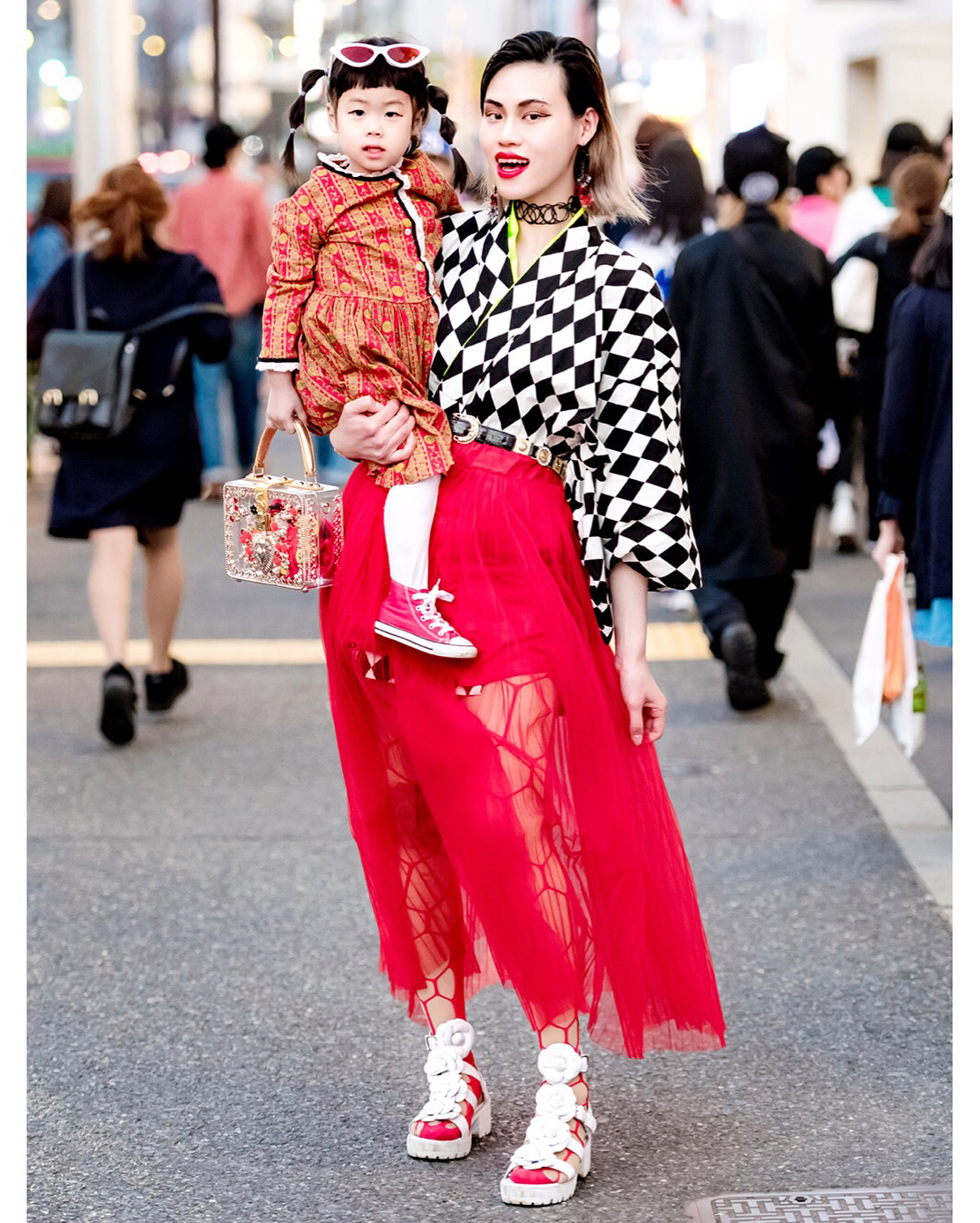 Mother and daughter street styles by Tsumire (@tsumire1224) and Ivy (@IvyBabyTokyo) in Harajuku. Tsumire – designer of @TheIvyTokyo – is wearing a vintage kimono top with a sheer red skirt, floral sandals, and The Ivy Tokyo earrings. Ivy is wearing a vintage dress with Converse sneakers and an Anpanman purse.