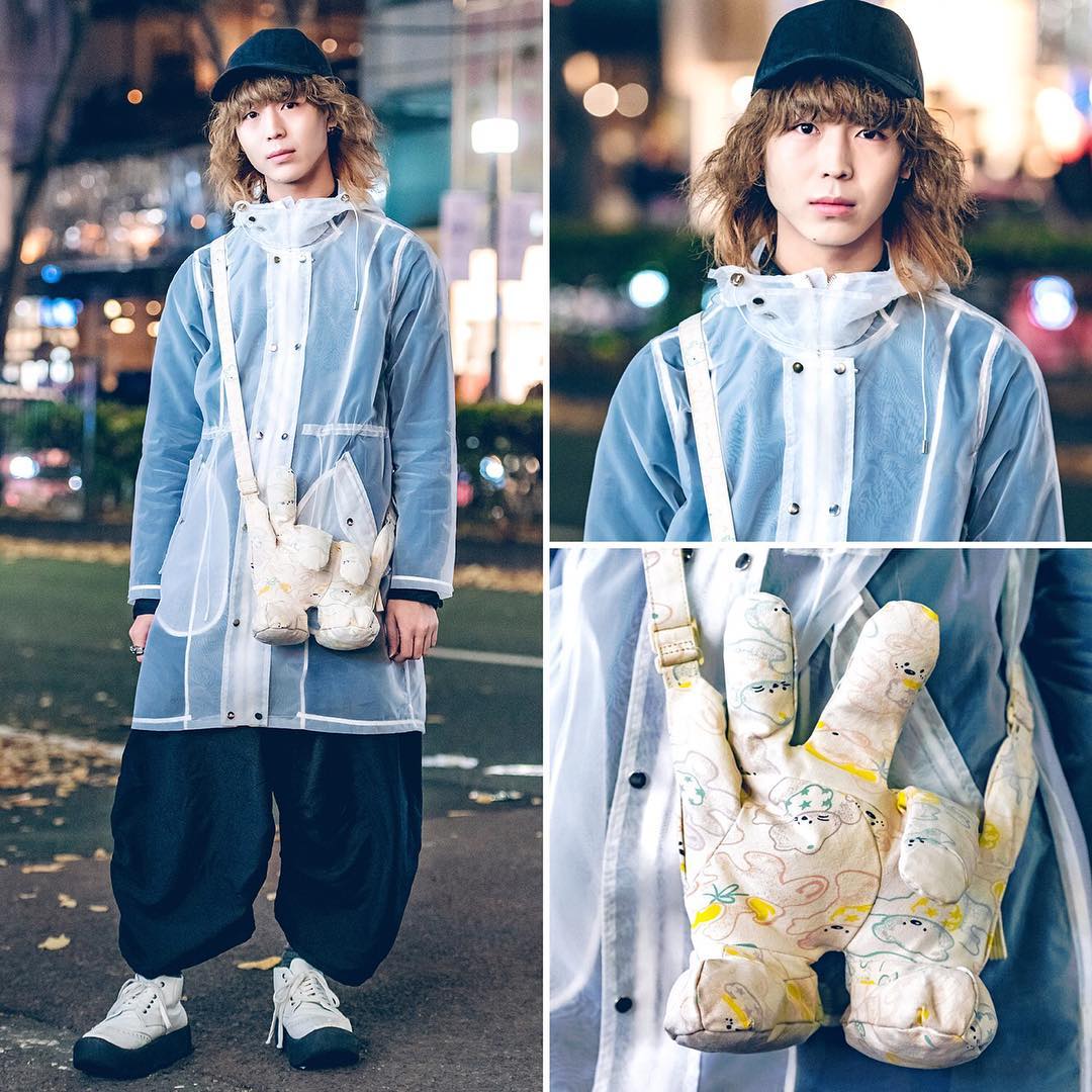 Japanese fashion college student Saga (@3sence) on the street in Harajuku wearing a sheer jacket from Dog Harajuku over a Kansai Yamamoto top, Christopher Nemeth pants, Tokyo Bopper shoes, and a Bernhard Willhelm bag.
