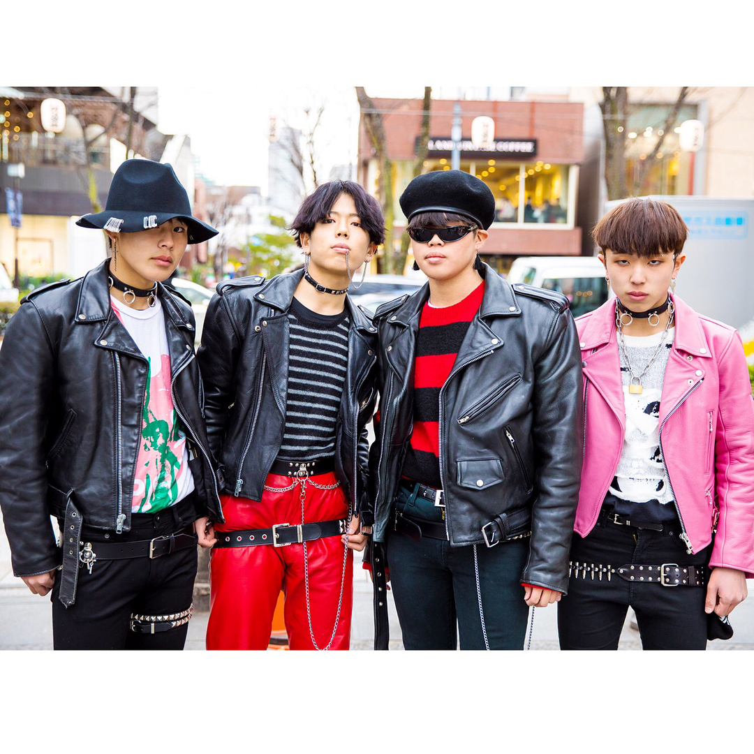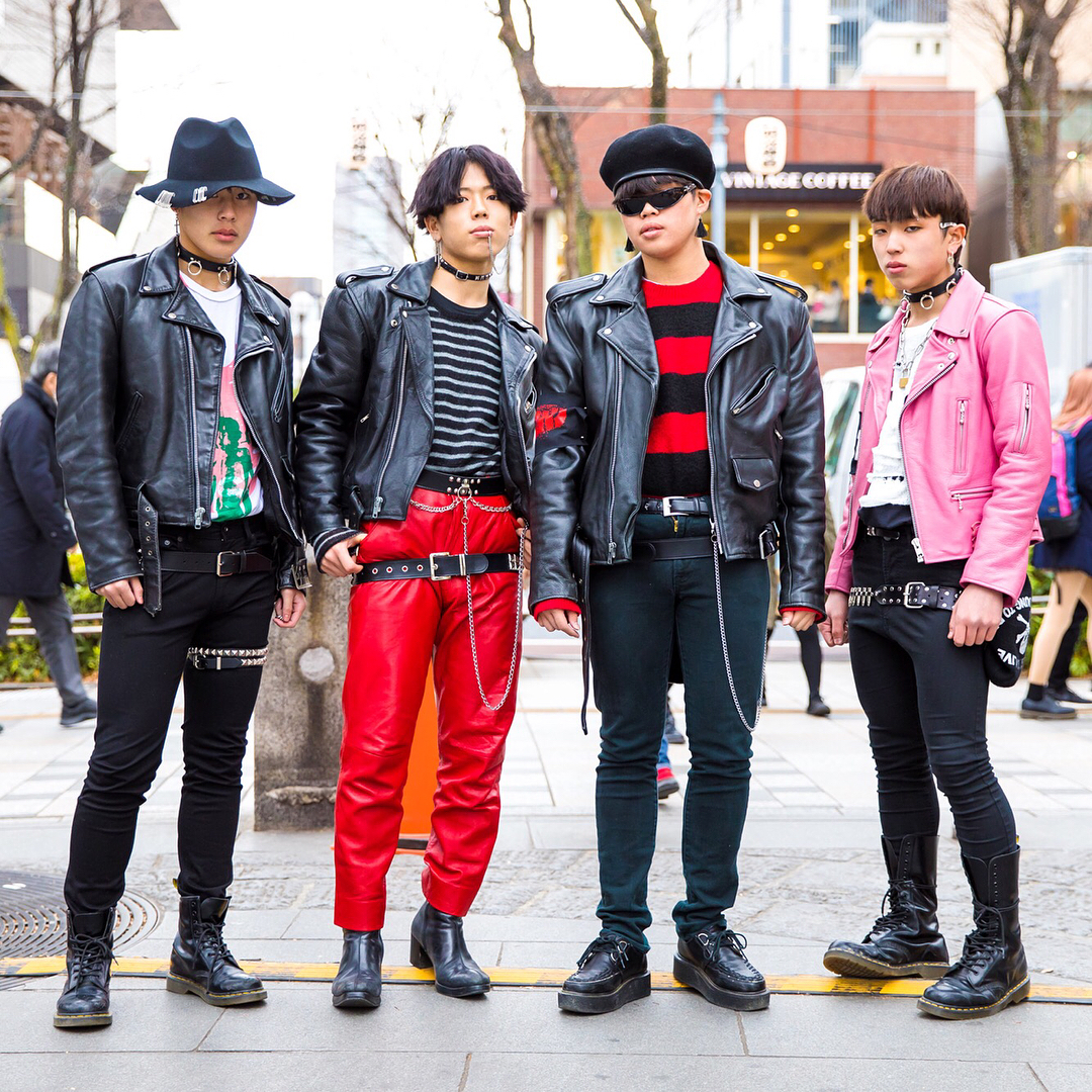 Japanese teens Haruki (@_07oh_99), Daiki (@6_sd___19), Katsuya (@08_izw_28), and Hiroto (@20sh__iro) on the street in Harajuku wearing leather jacket and skinny jeans along with Dr. Martens boots. Tokyo FashionAloJapan.com